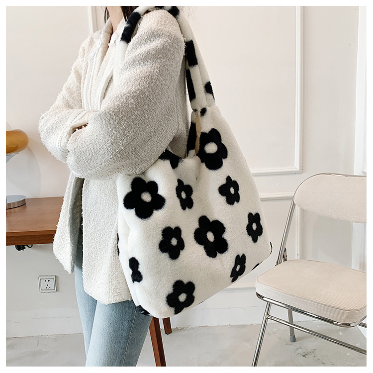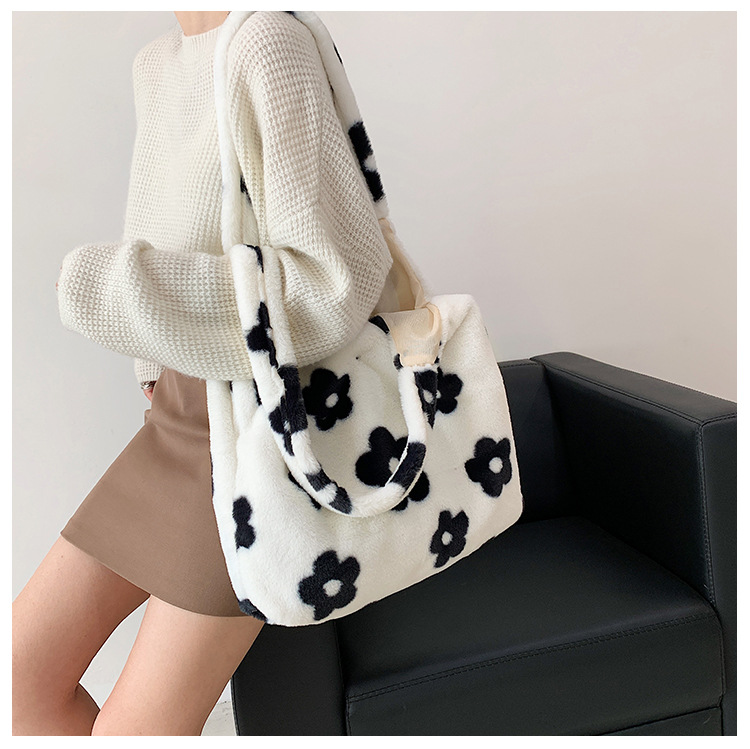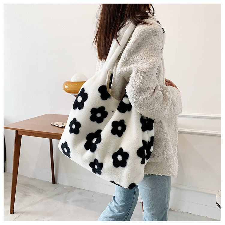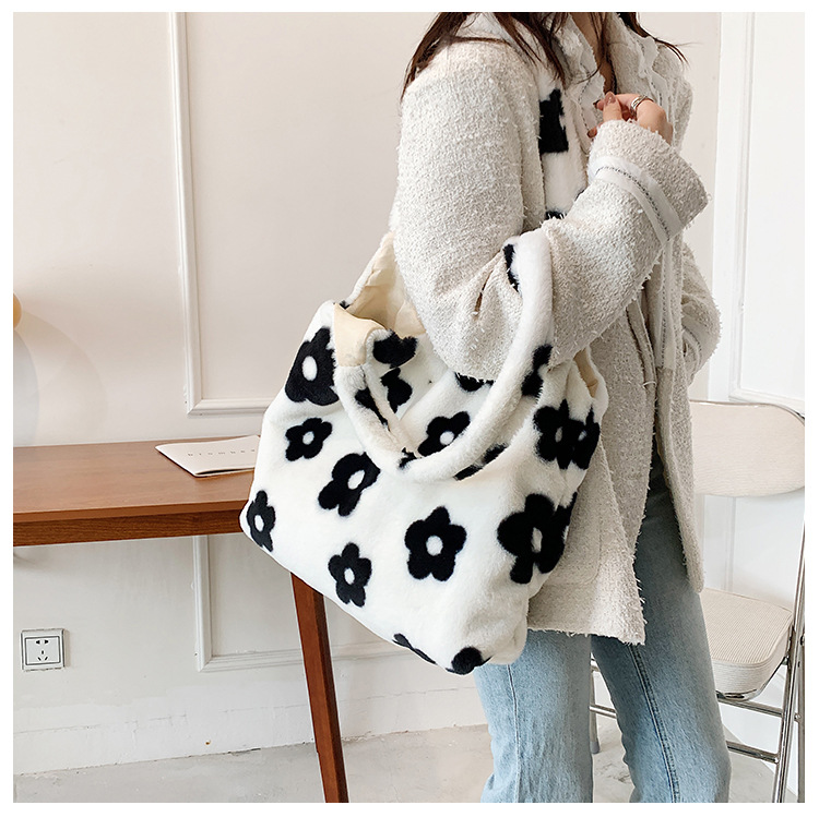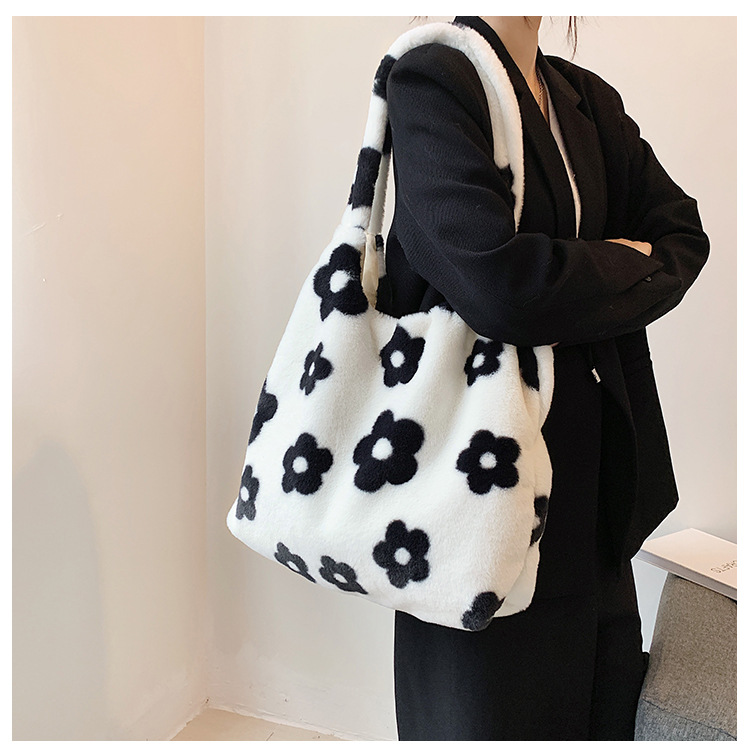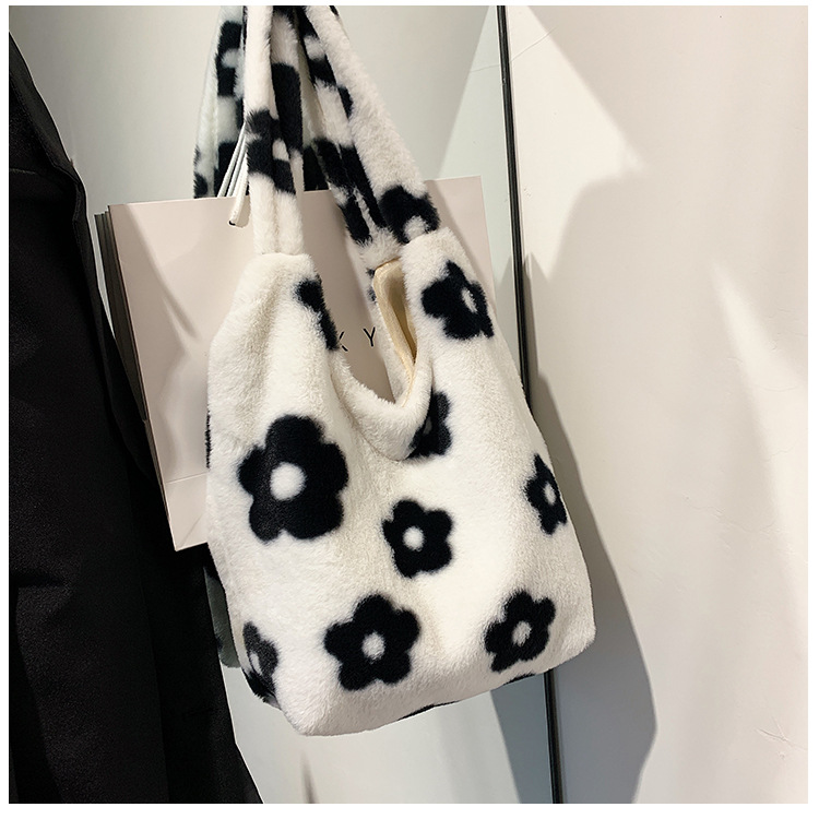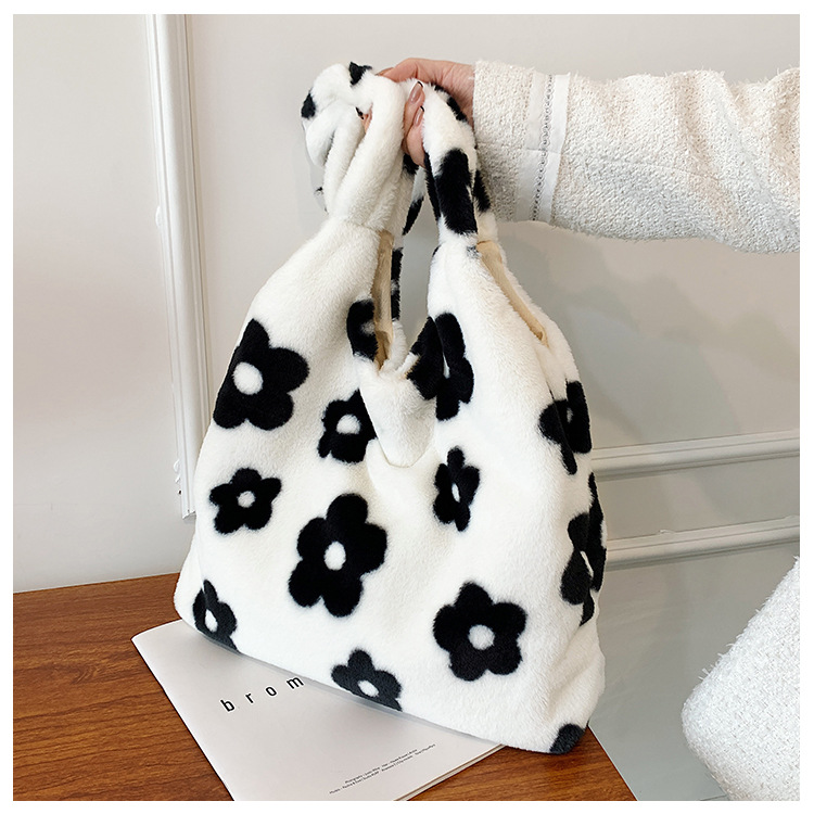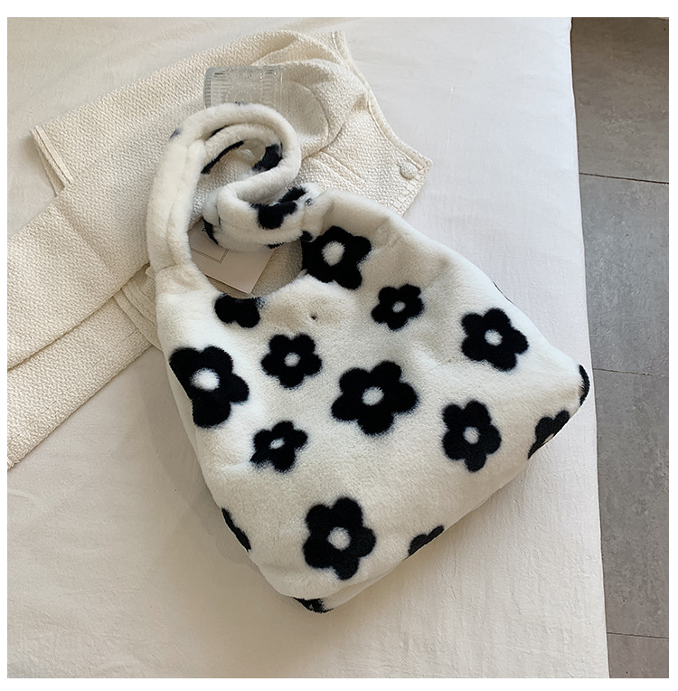 가방 여성의 2024 가을과 겨울 일본 귀여운 흑백 꽃 봉제 가방 어깨 통근 크로스 바디 토트 백 트렌디스토어 가기