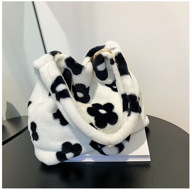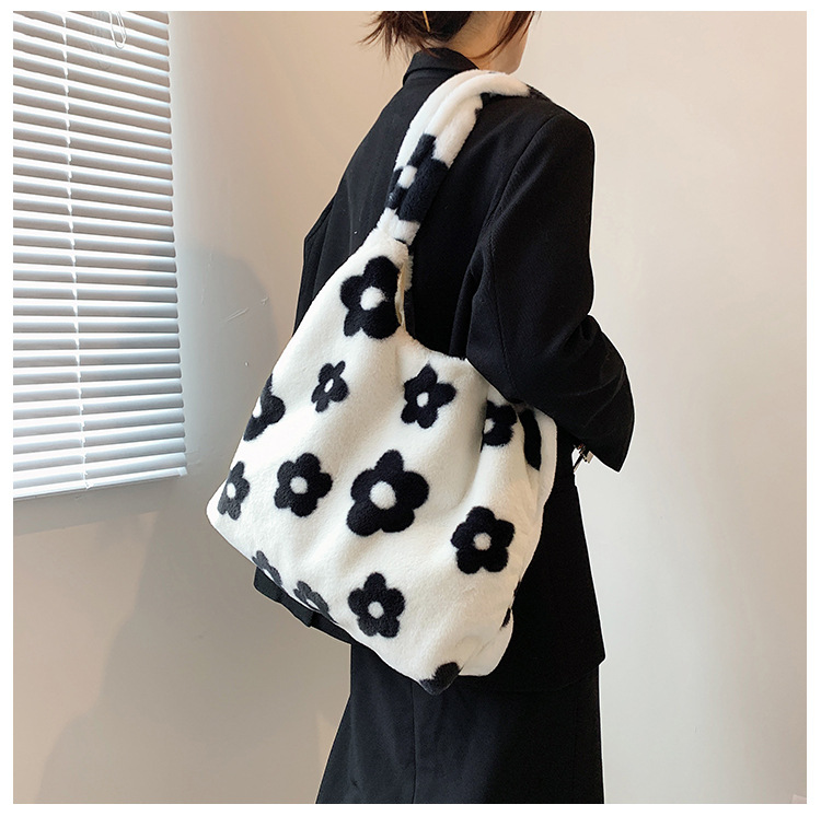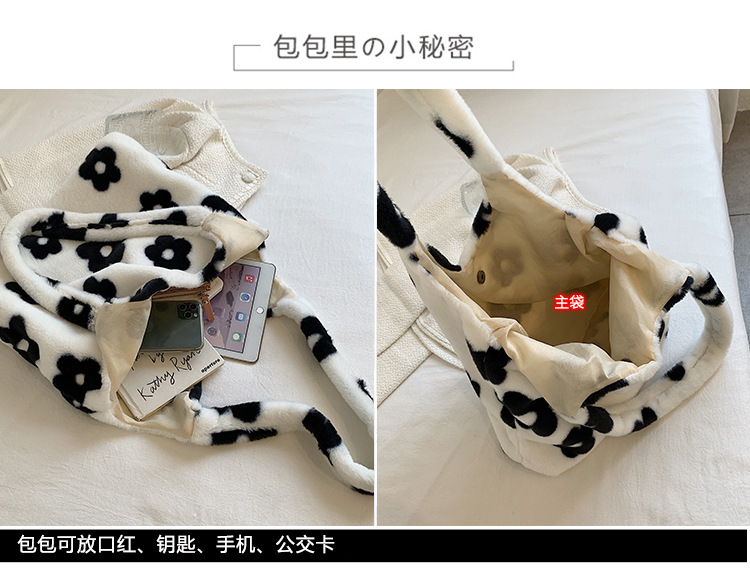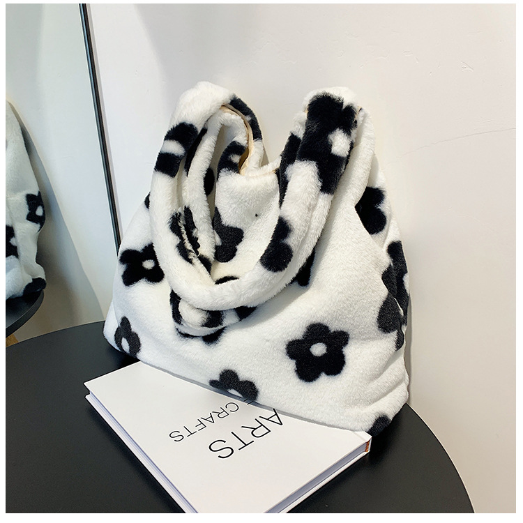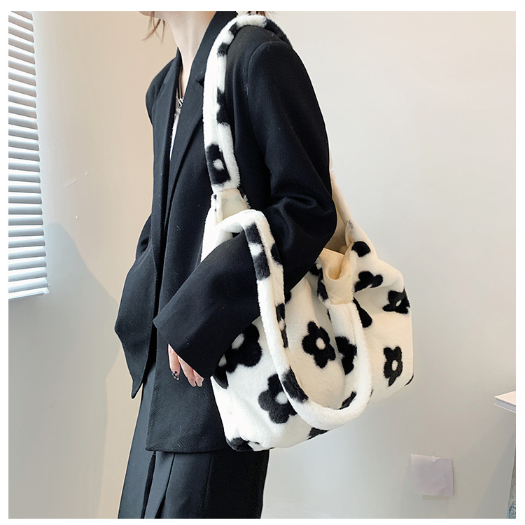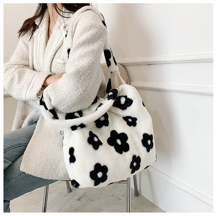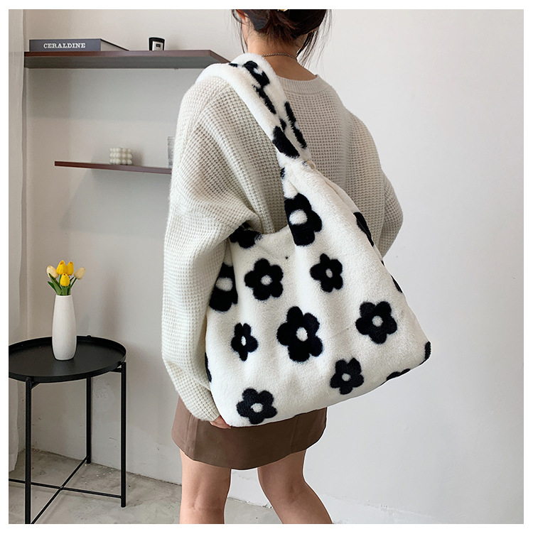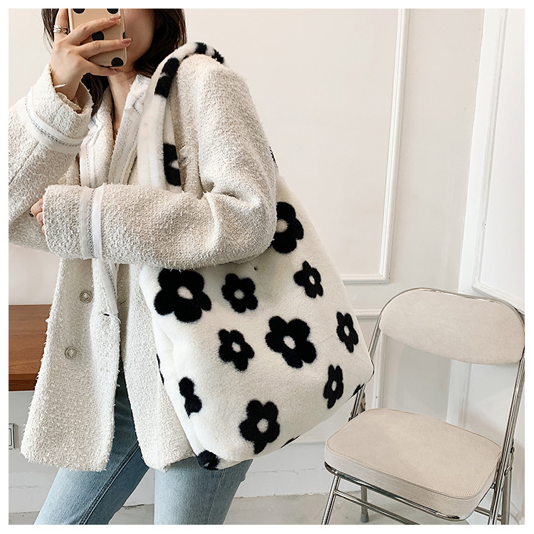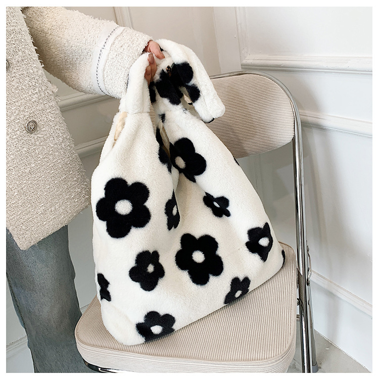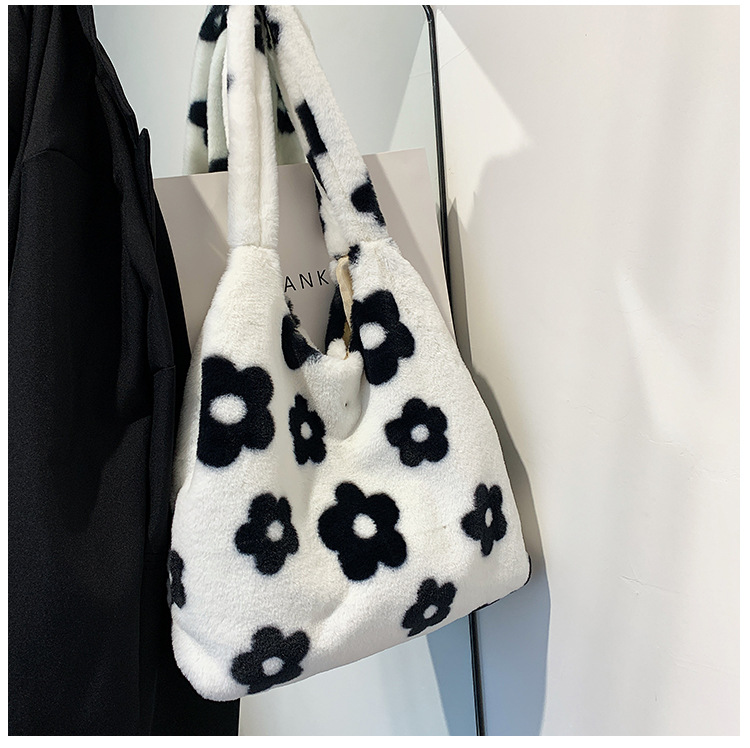 가방 여성의 2024 가을과 겨울 일본 귀여운 흑백 꽃 봉제 가방 어깨 통근 크로스 바디 토트 백 트렌디스토어 가기