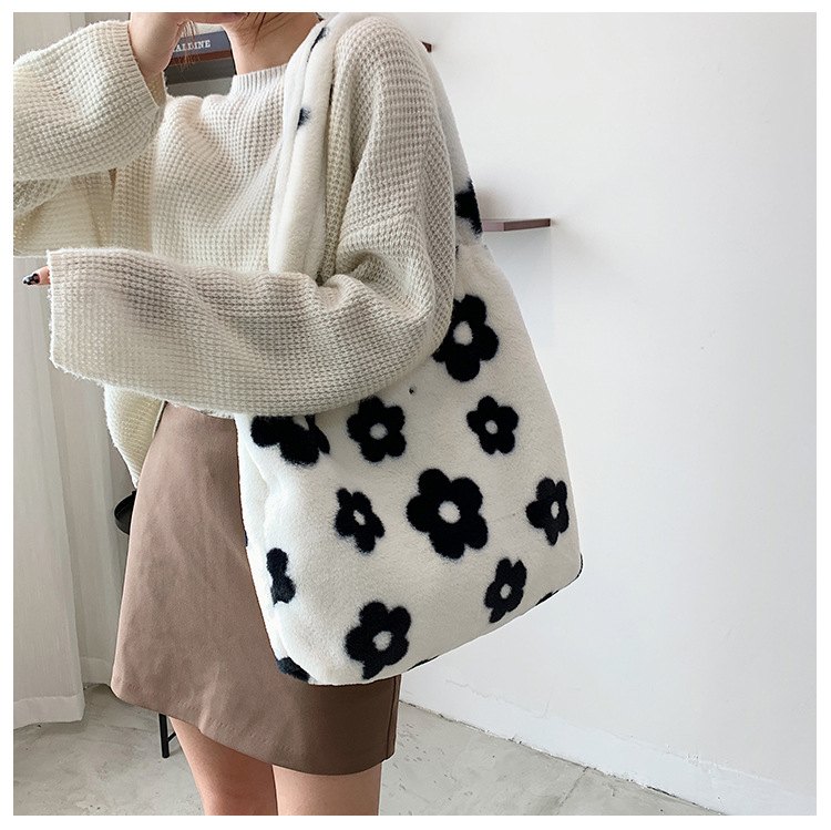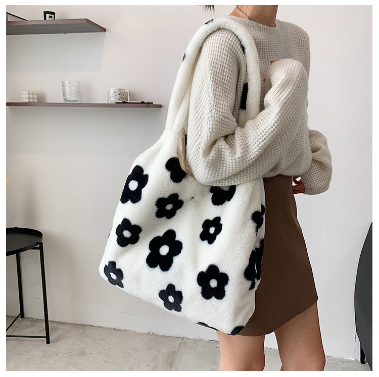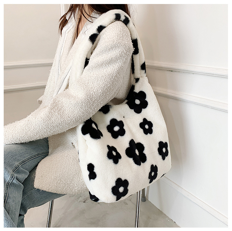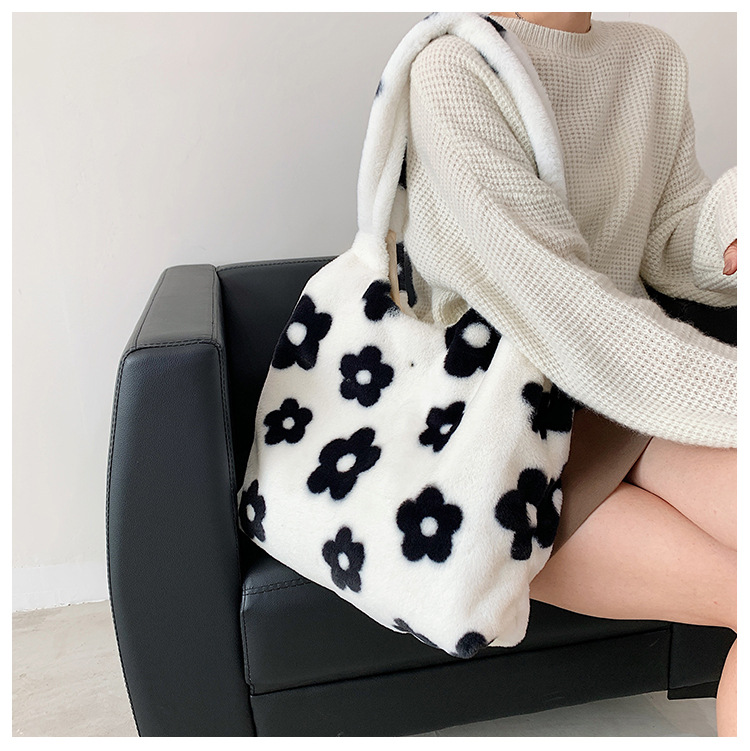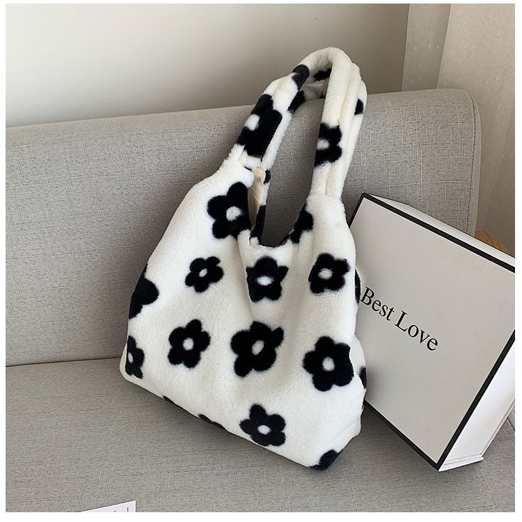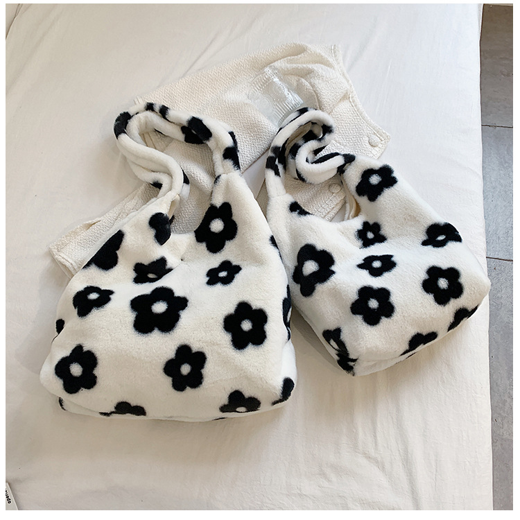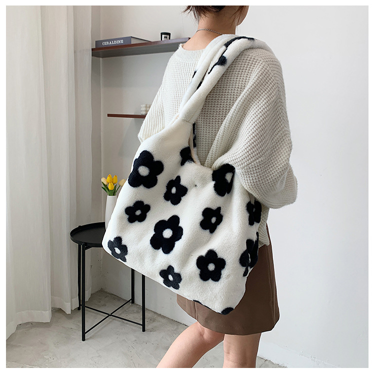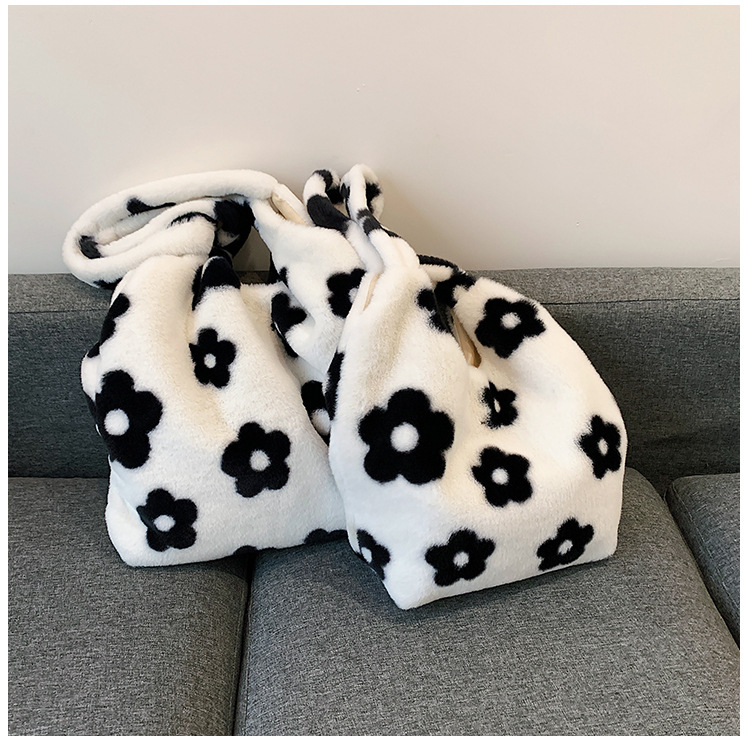 가방 여성의 2024 가을과 겨울 일본 귀여운 흑백 꽃 봉제 가방 어깨 통근 크로스 바디 토트 백 트렌디스토어 가기