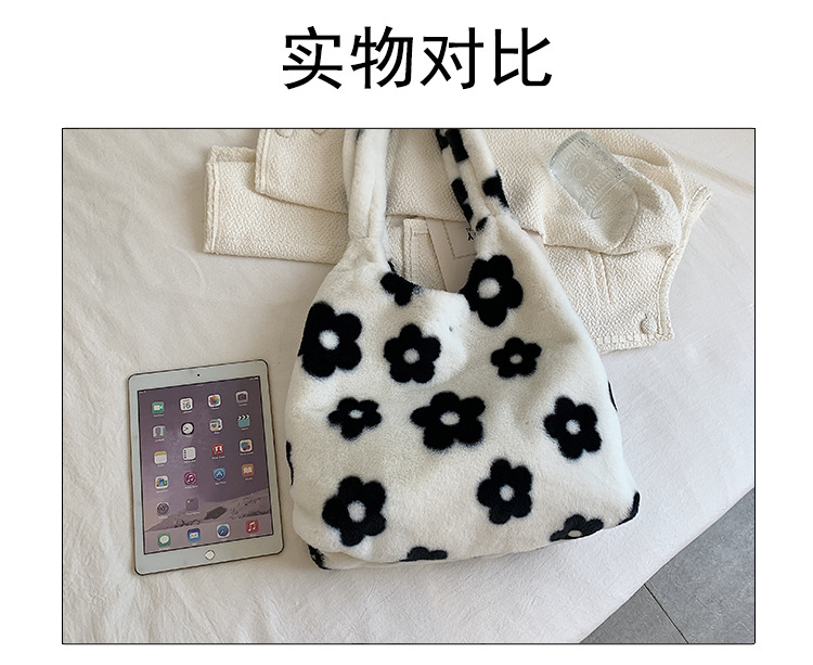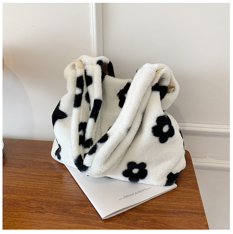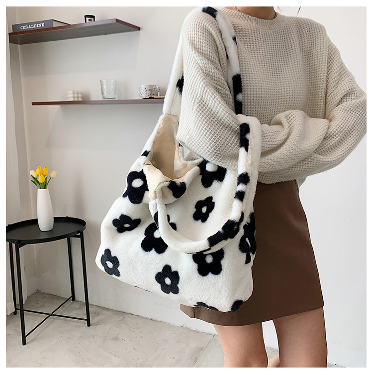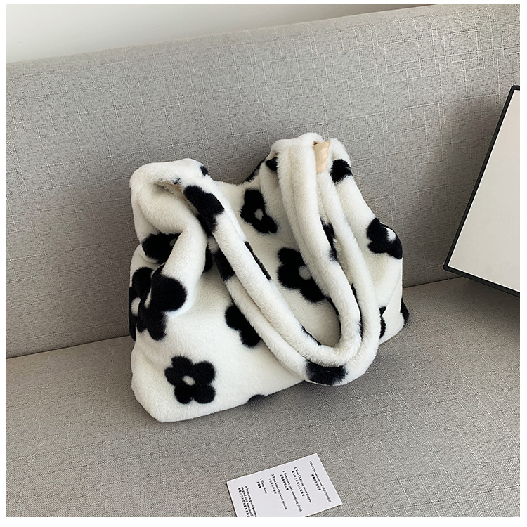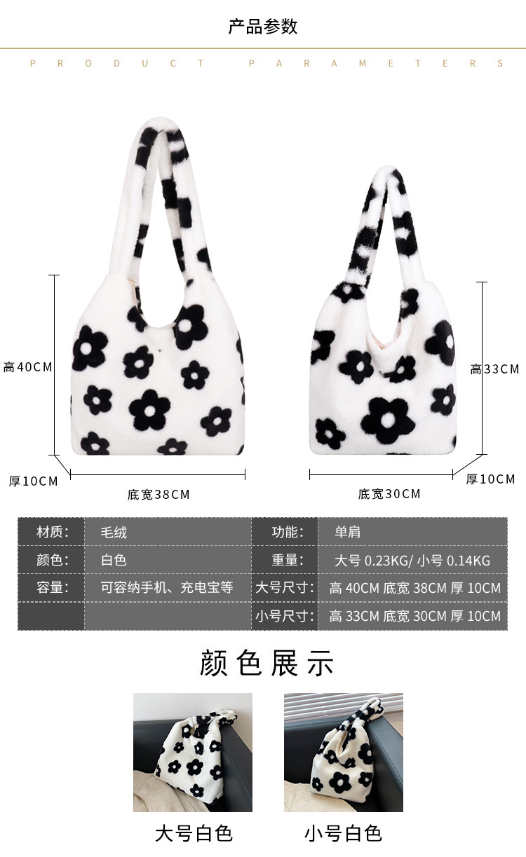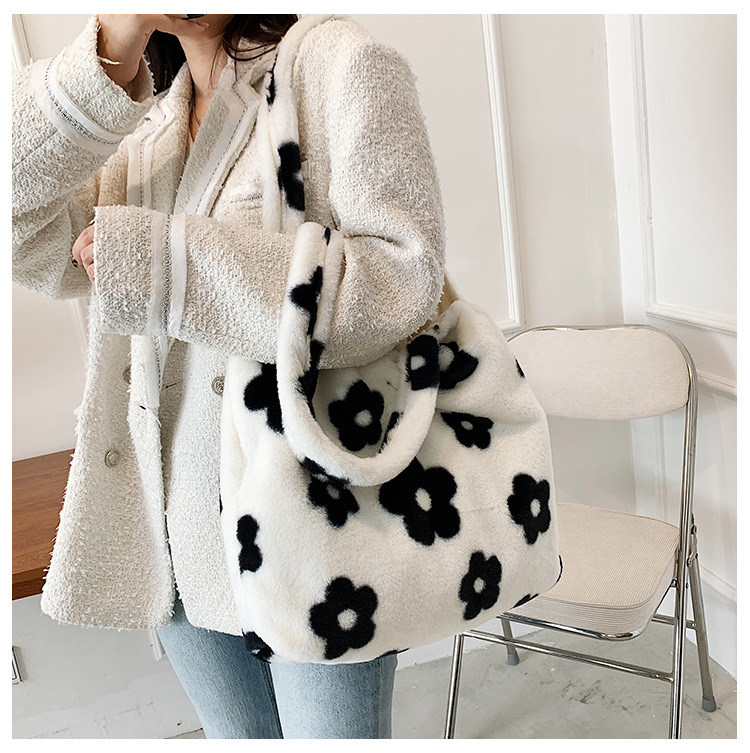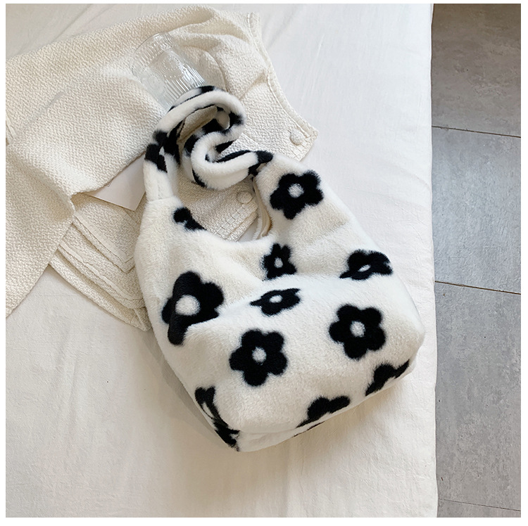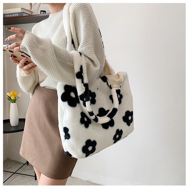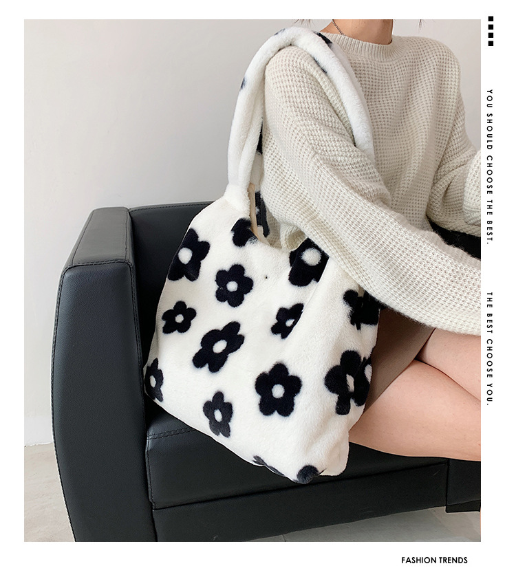 가방 여성의 2024 가을과 겨울 일본 귀여운 흑백 꽃 봉제 가방 어깨 통근 크로스 바디 토트 백 트렌디스토어 가기
