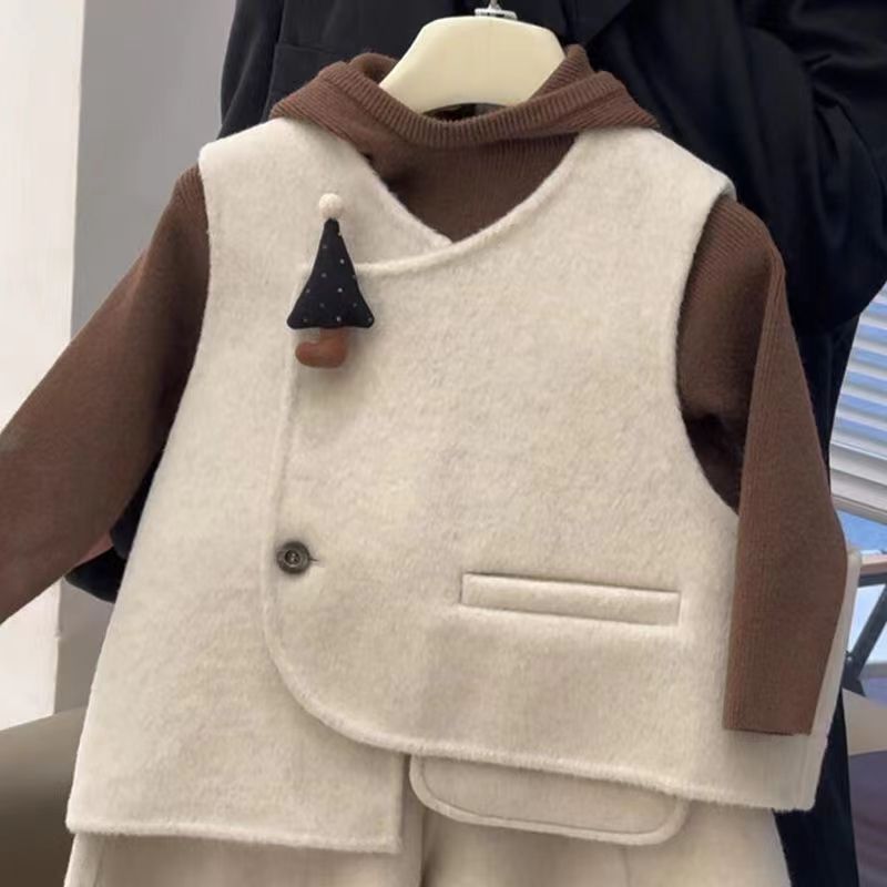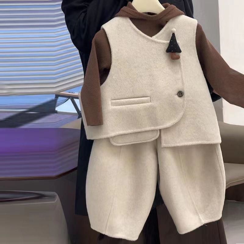 어린이 가을 겨울 착용 세트 2024 새로운 복고풍 영국 스타일 모직 조끼 재킷 소녀 캐주얼 스트레이트 바지스토어 가기