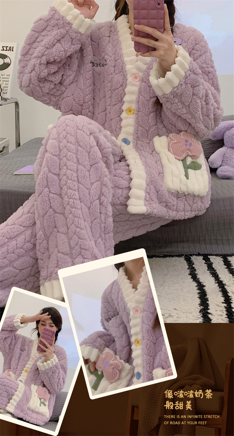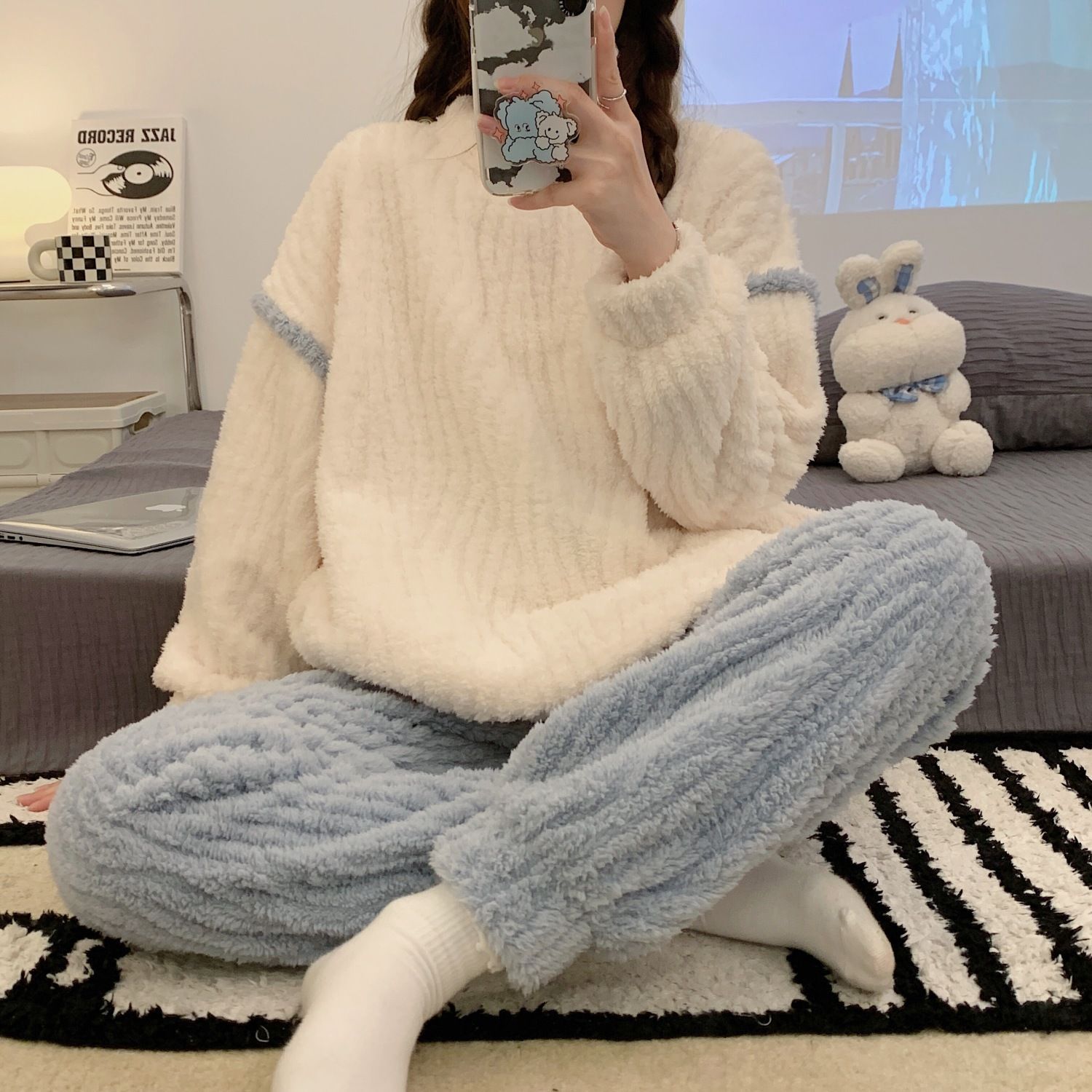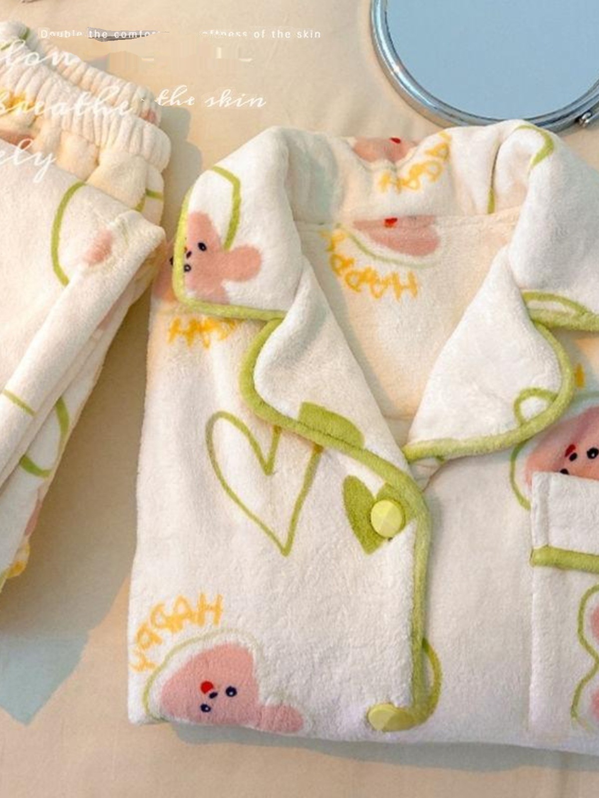 새로운 산호 양털 잠옷 여성의 가을과 겨울 귀여운 플란넬 따뜻한 두꺼운 달콤한 가정 옷 가을과 겨울 세트스토어 가기