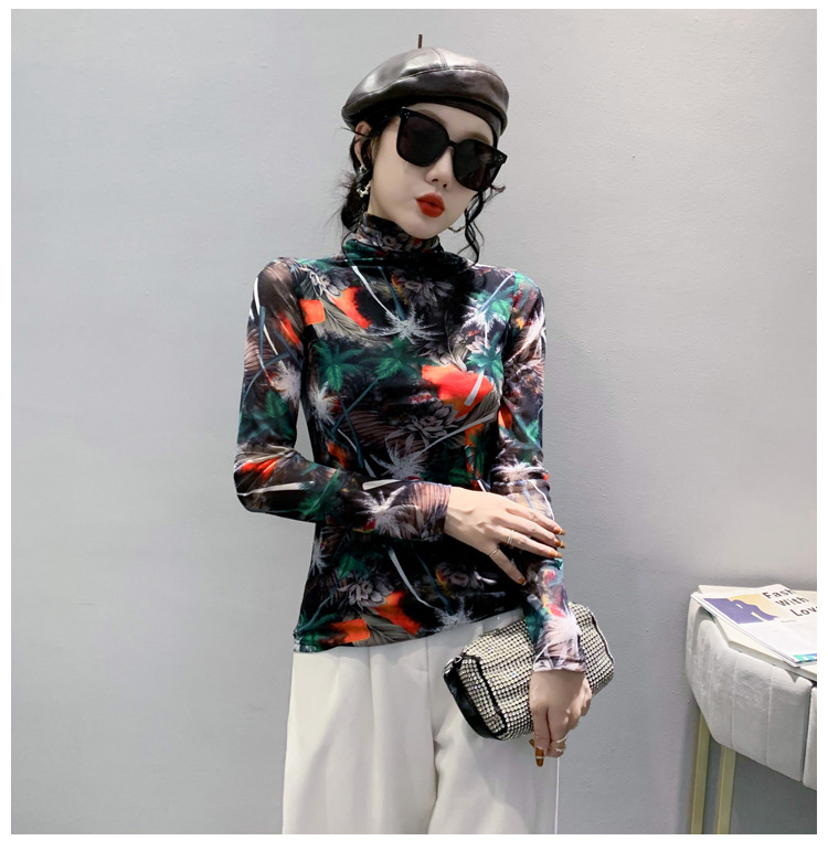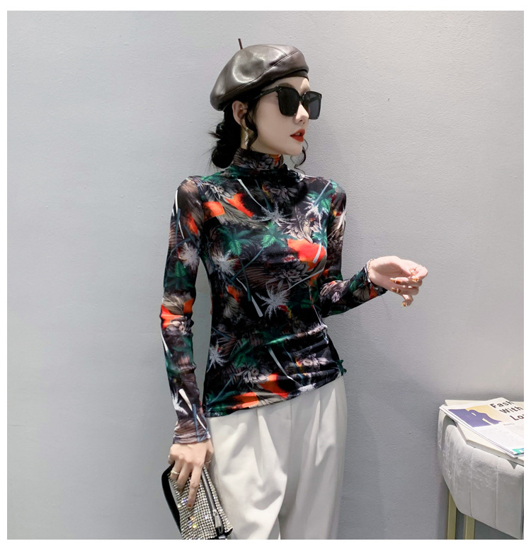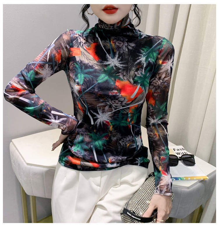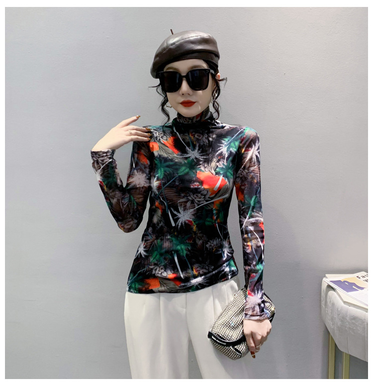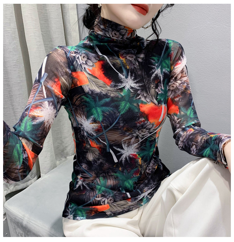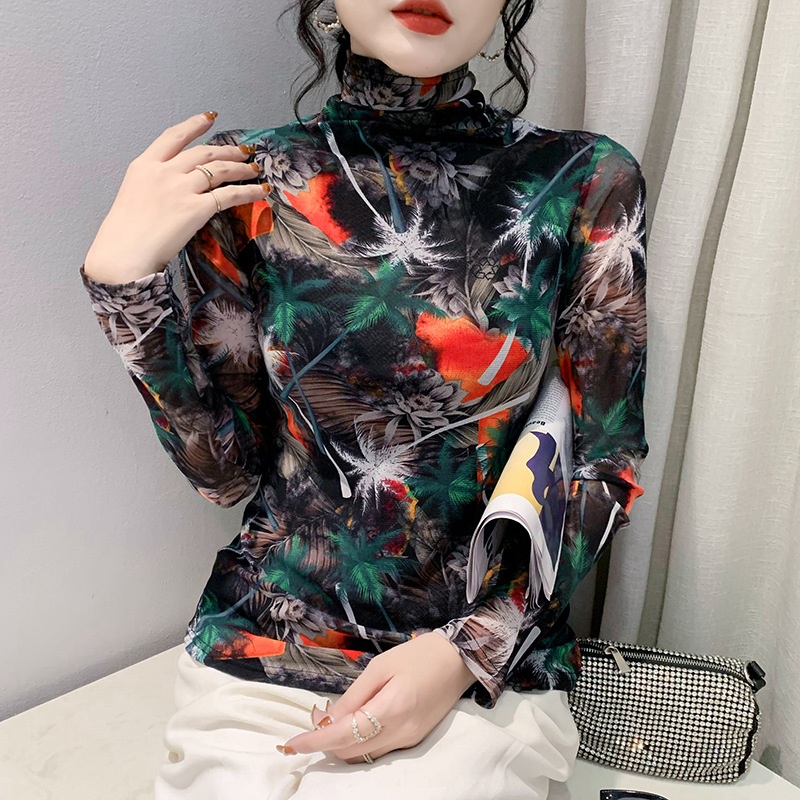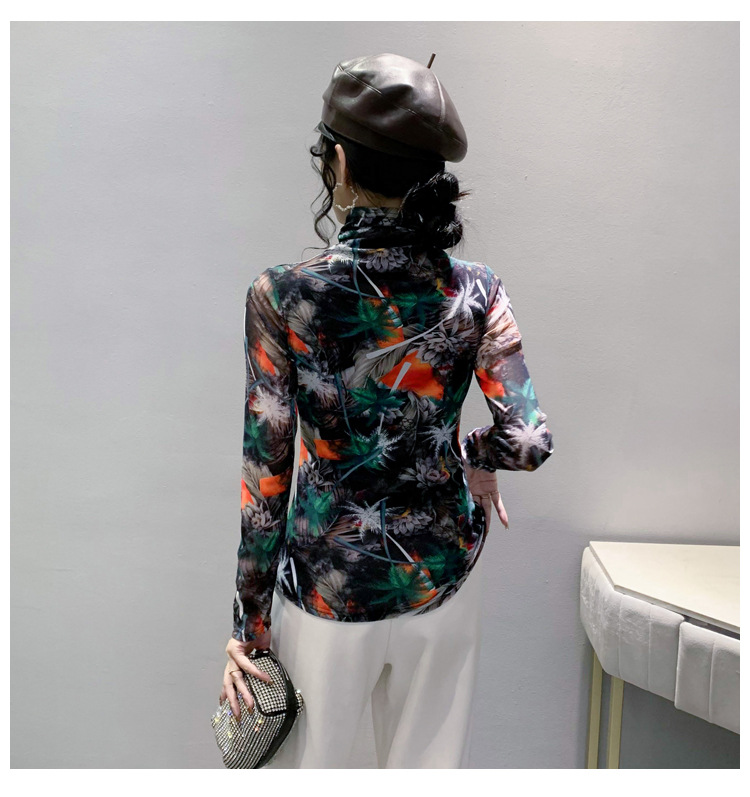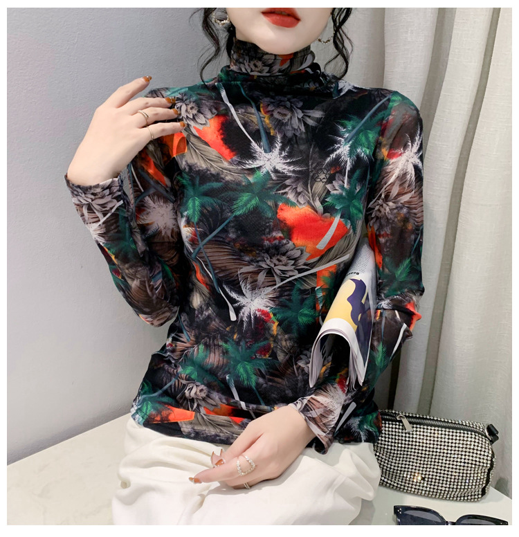유럽 여성 의류 2024 가을과 겨울 패션 외국 스타일 긴 소매 높은 칼라 메쉬 티셔츠 여성용 포지셔닝 플라워 코트 헤어스토어 가기