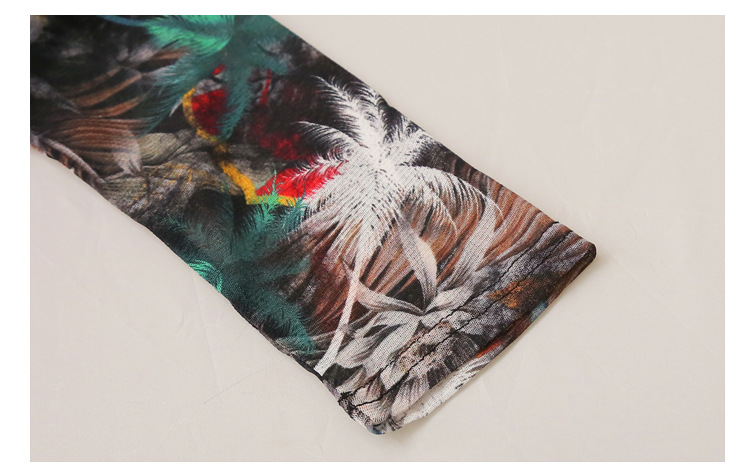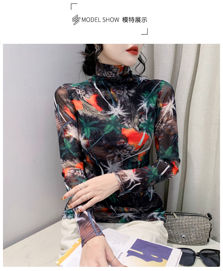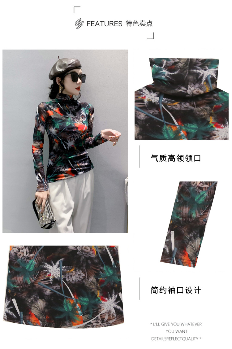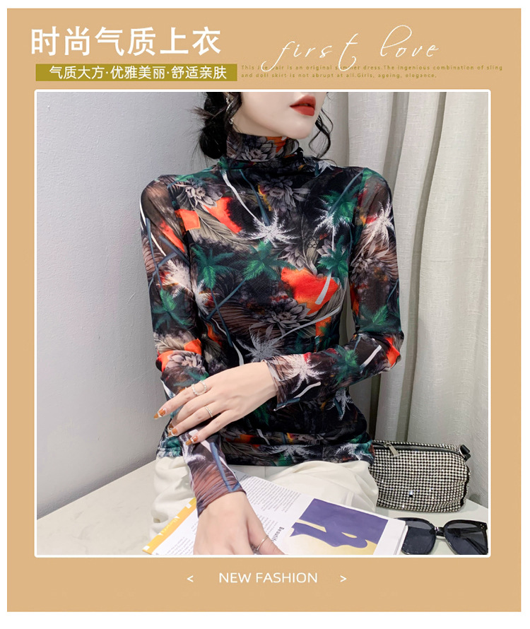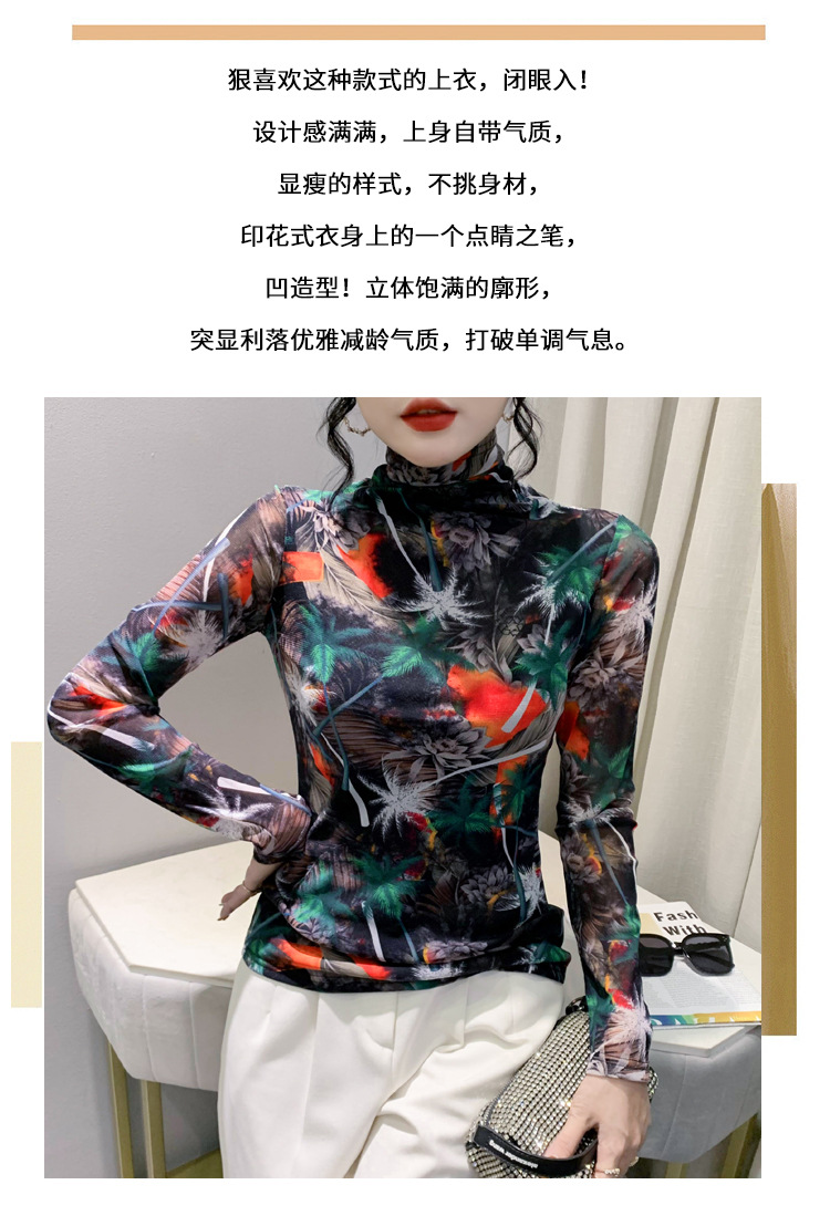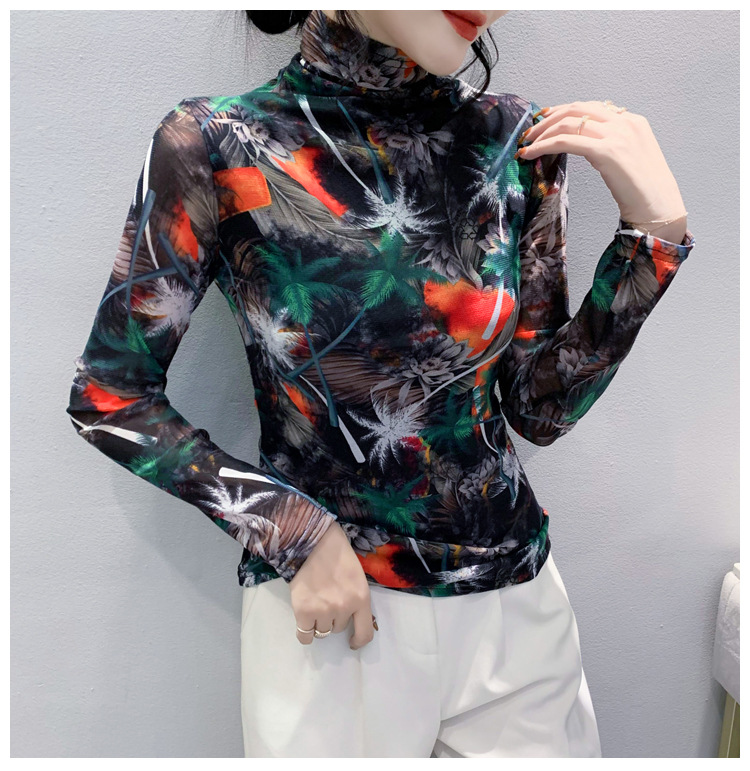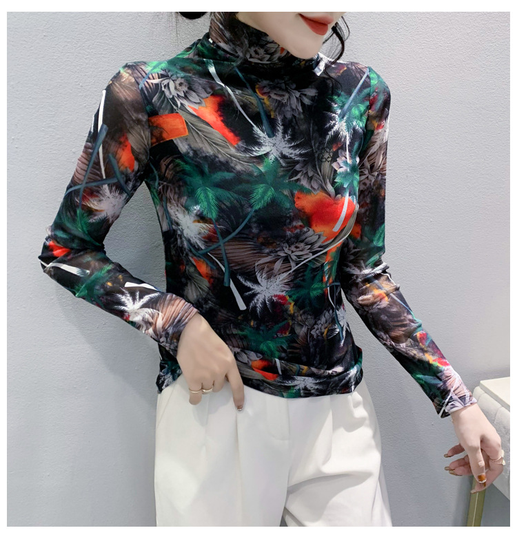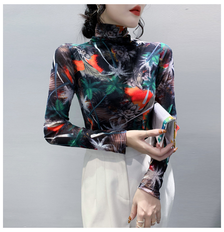 유럽 여성 의류 2024 가을과 겨울 패션 외국 스타일 긴 소매 높은 칼라 메쉬 티셔츠 여성용 포지셔닝 플라워 코트 헤어스토어 가기