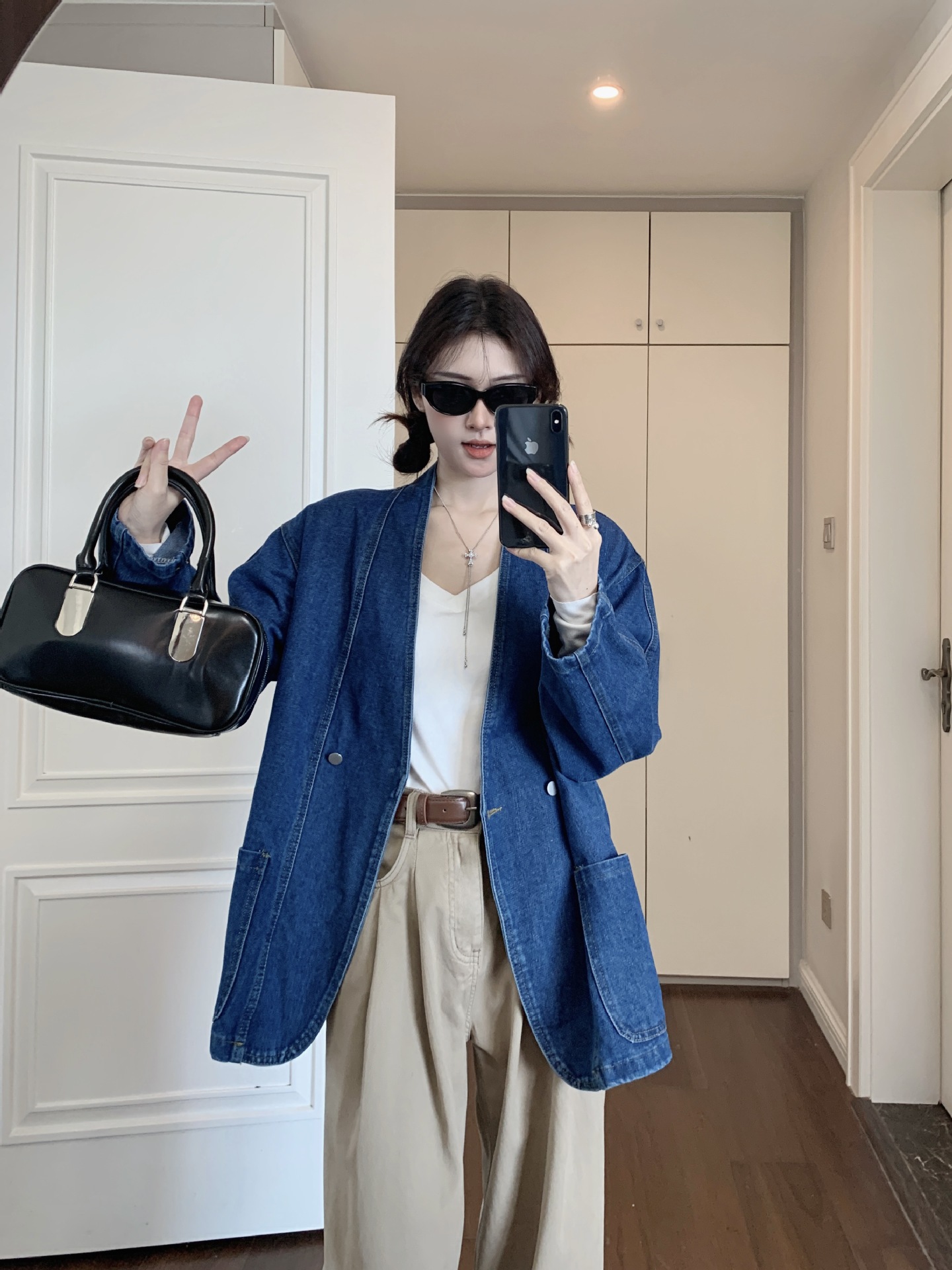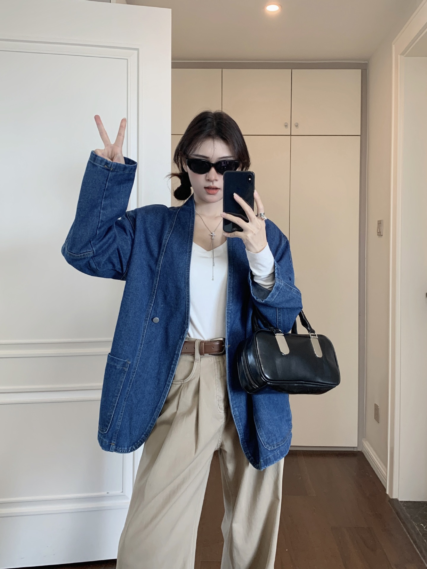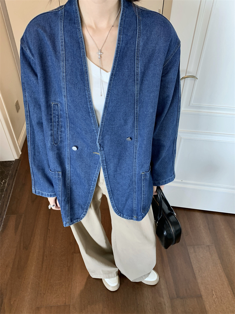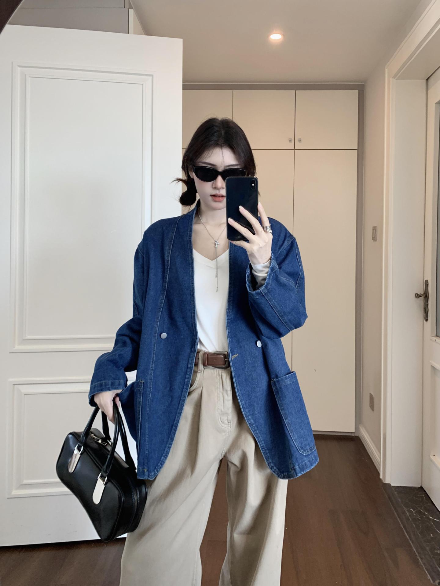 2024 년 가을 한국 동대문 가을 프랑스 레트로 더블 브레스트 숄더 패드 캐주얼 칼라 데님 재킷스토어 가기