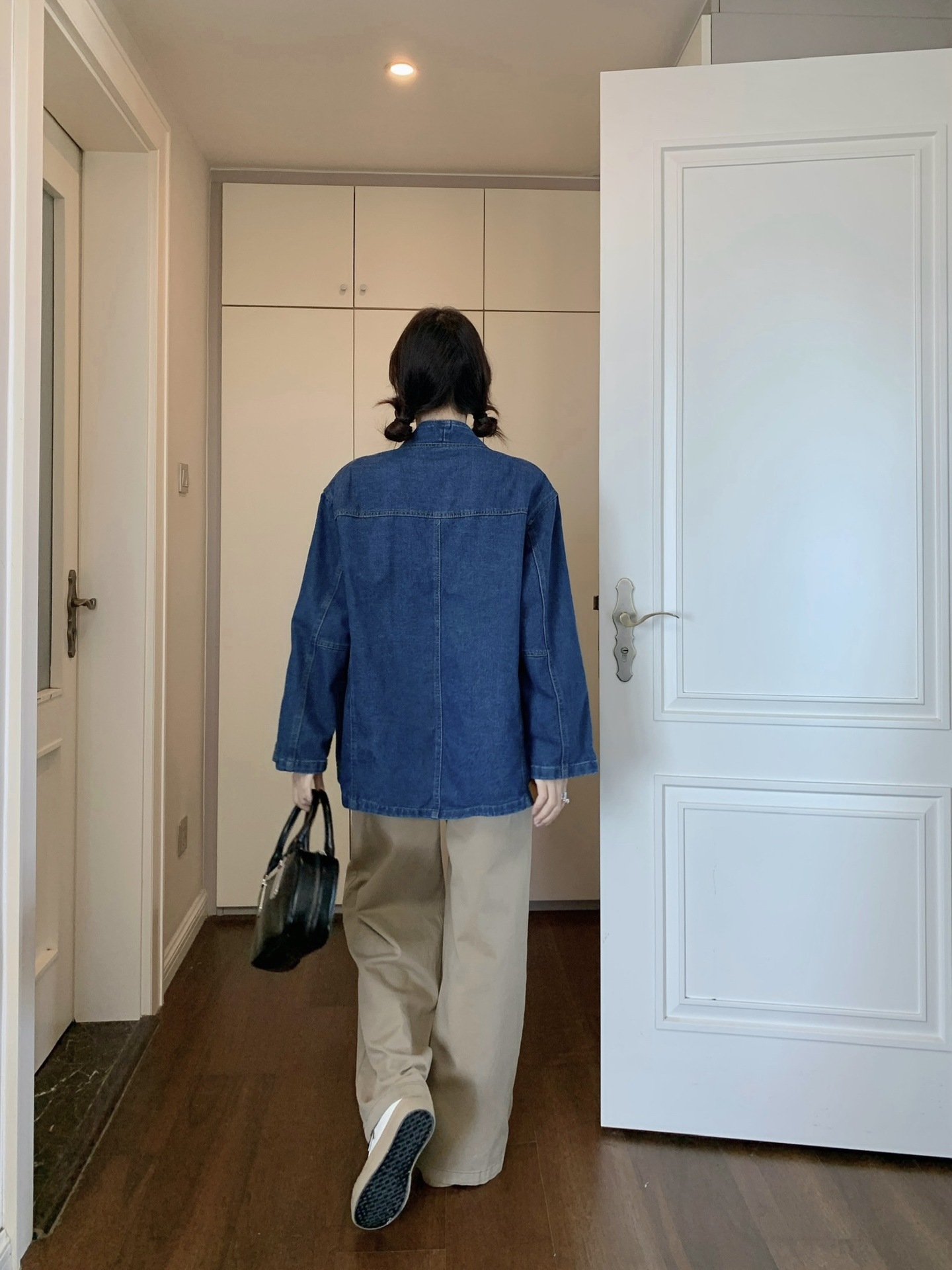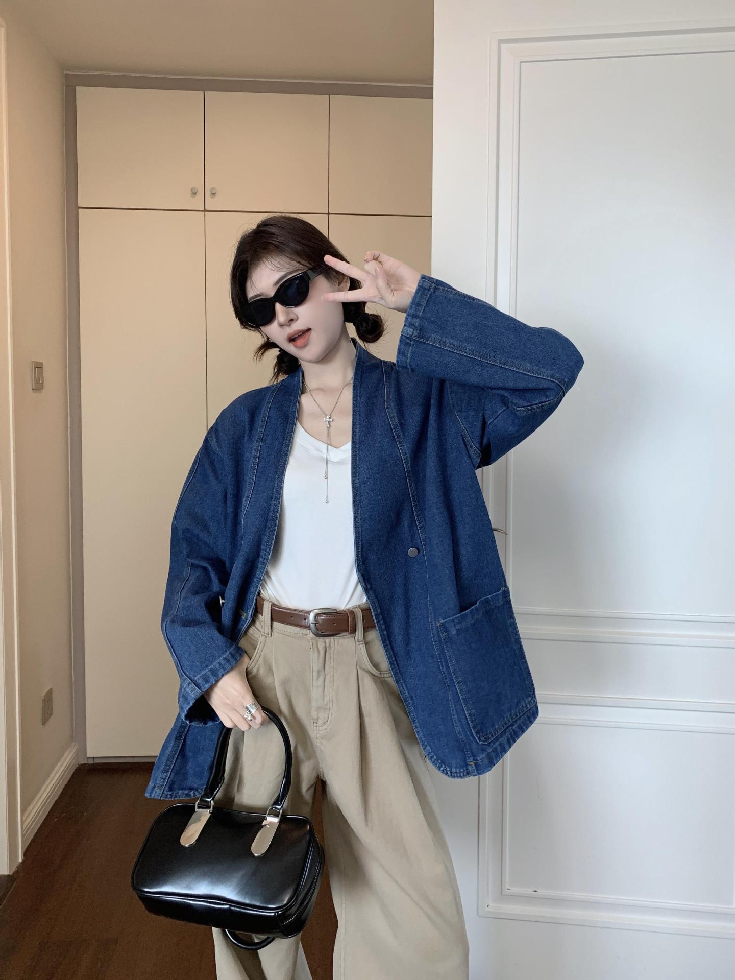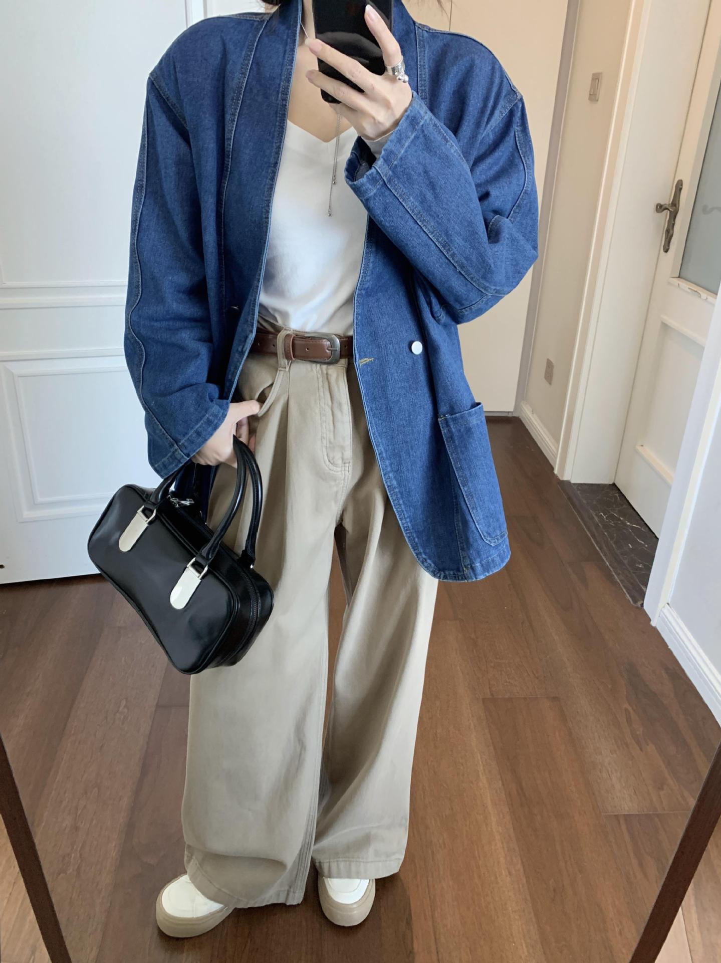 2024 년 가을 한국 동대문 가을 프랑스 레트로 더블 브레스트 숄더 패드 캐주얼 칼라 데님 재킷스토어 가기