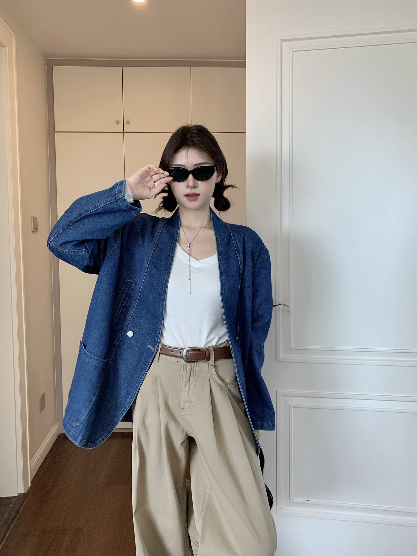 2024 년 가을 한국 동대문 가을 프랑스 레트로 더블 브레스트 숄더 패드 캐주얼 칼라 데님 재킷