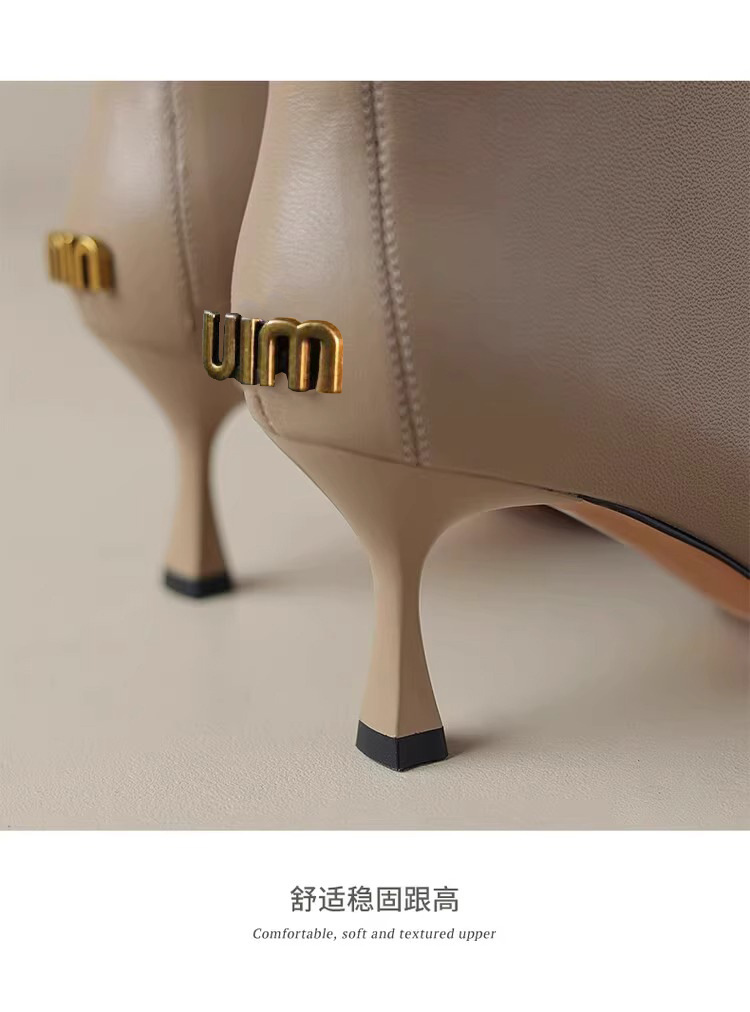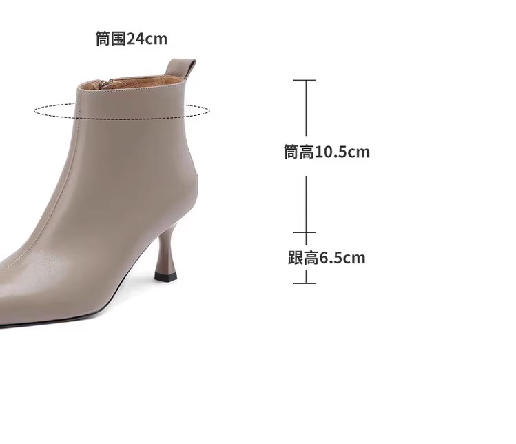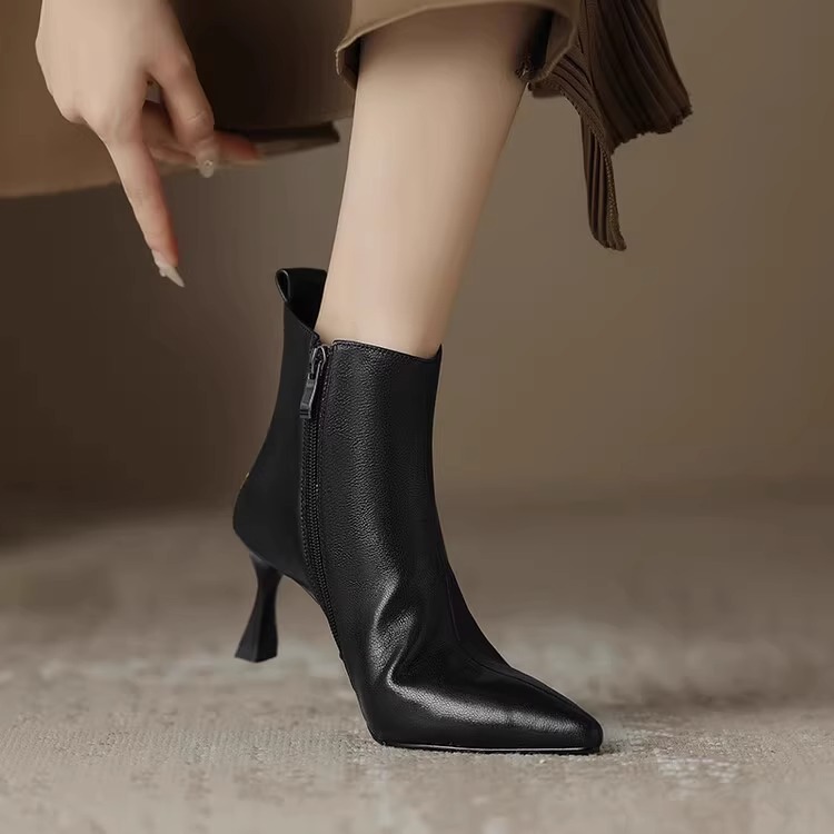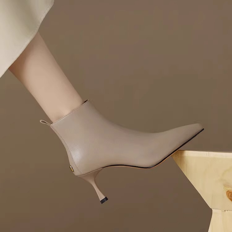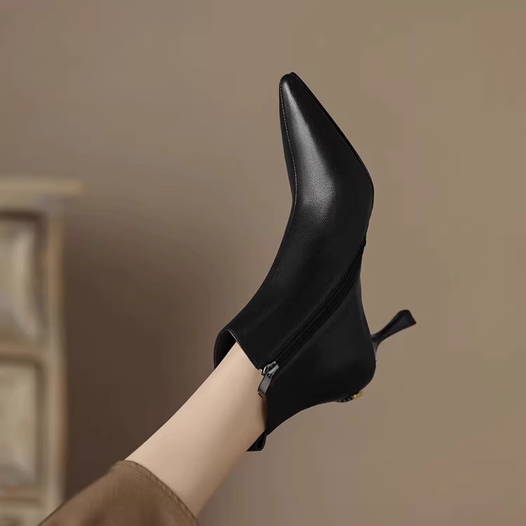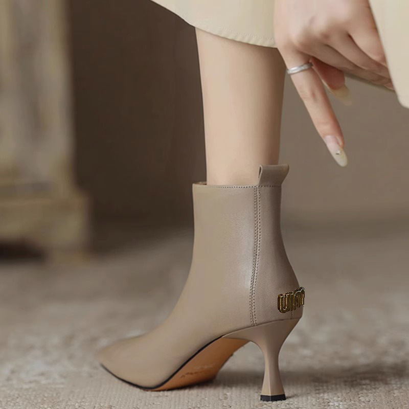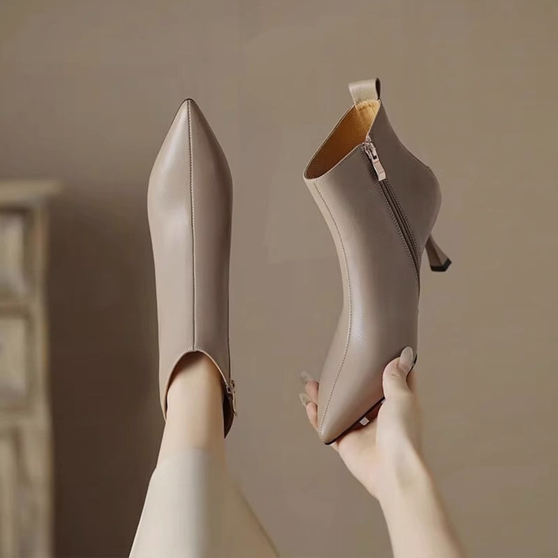 2023 가을과 겨울 새로운 우아한 발목 부츠 Cowhide 여성용 신발 뾰족한 스틸레토 힐 하이힐 메탈 버클 지퍼 패션 쇼트