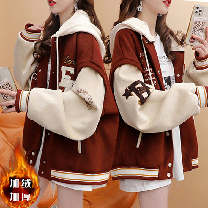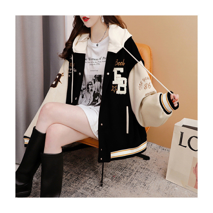 미국 레트로 야구 세트 코트 여자 2024 가을 겨울 누빔안감 학생 루즈 후드 올 매치 자수 재킷