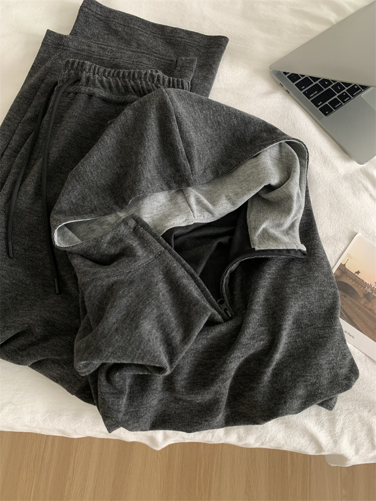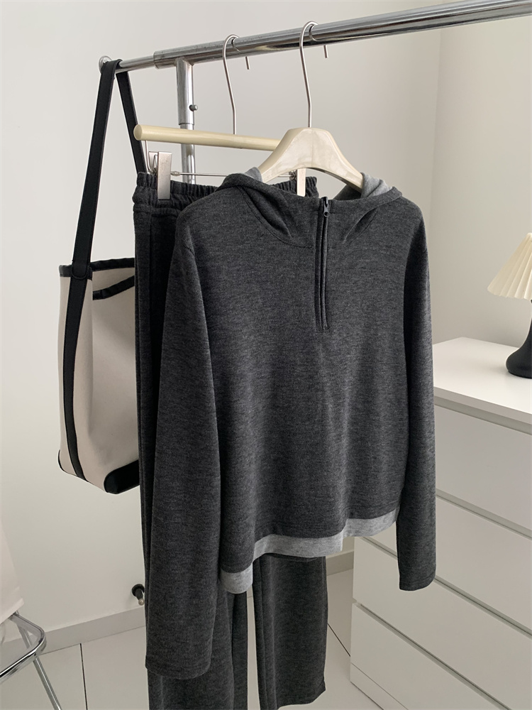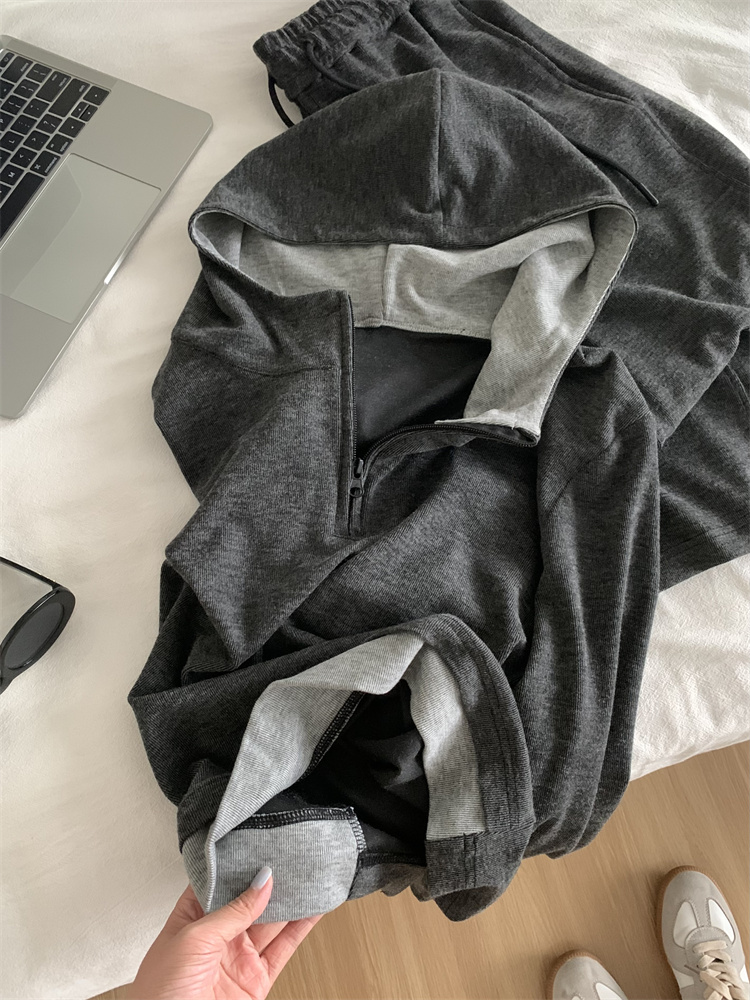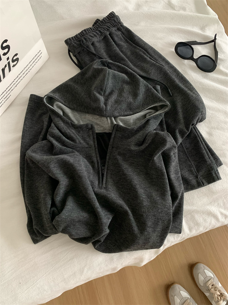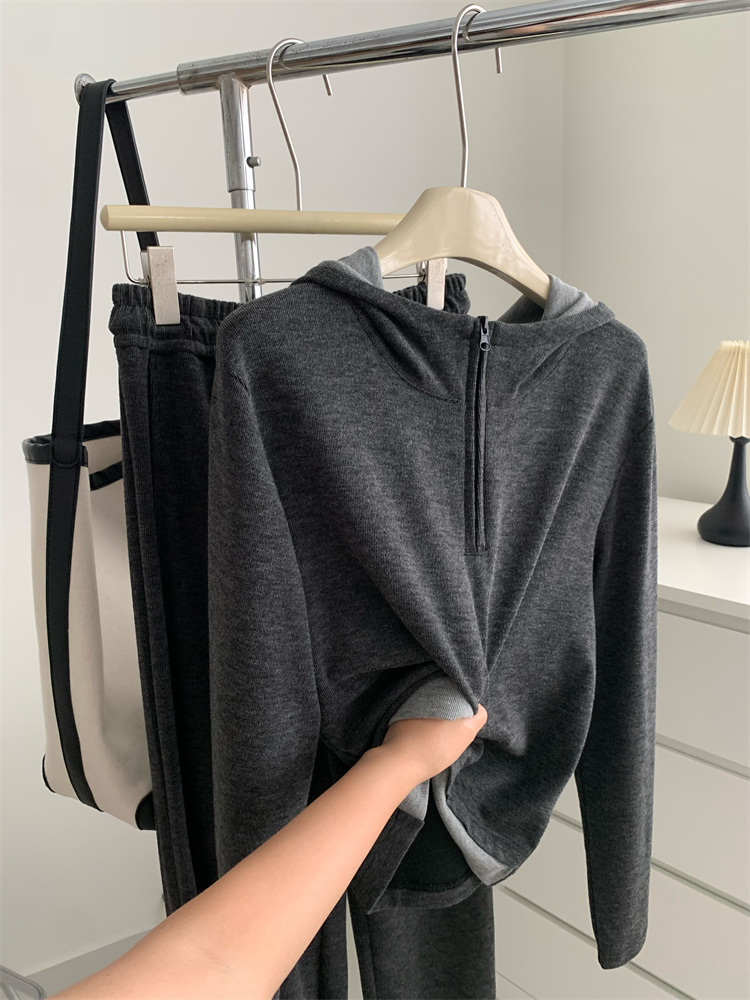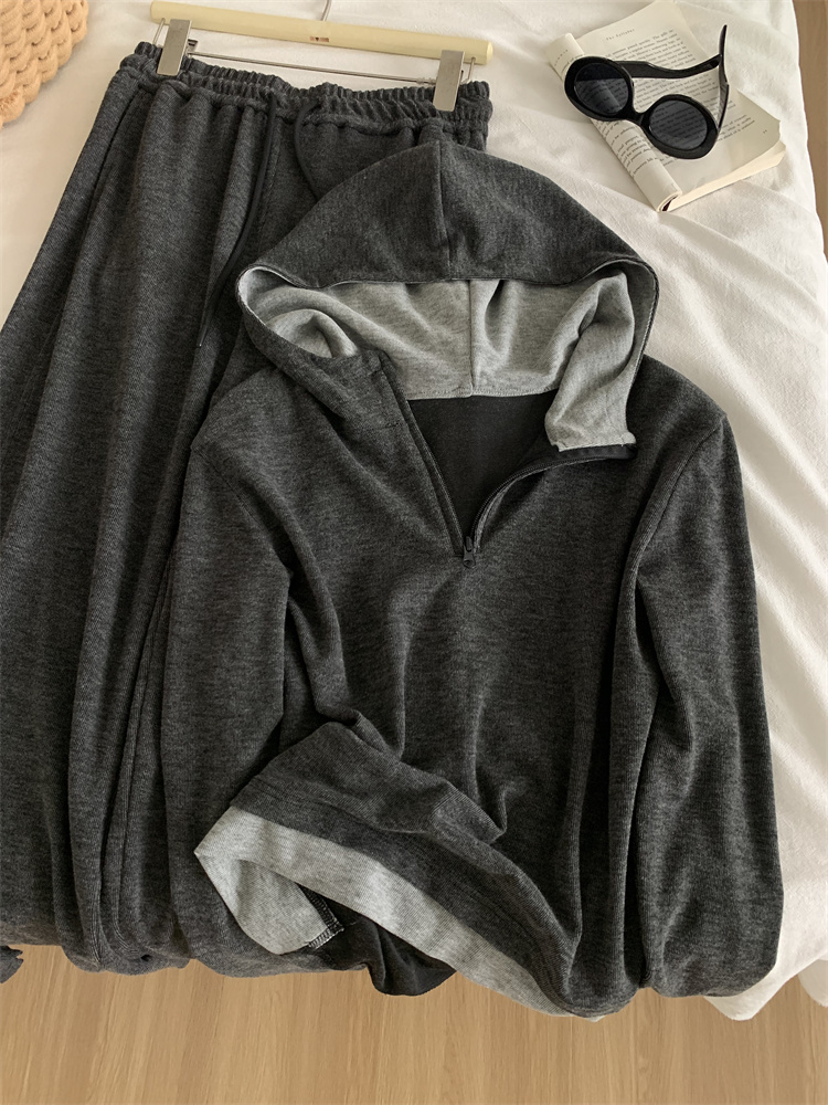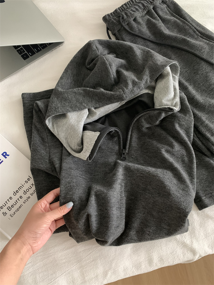 기질 통근 찹쌀 벨벳 게으른 세트 여성 디자인 센스 하프 Zip 색상 차단 후드 와이드 레그 바지 투피스 세트 가을