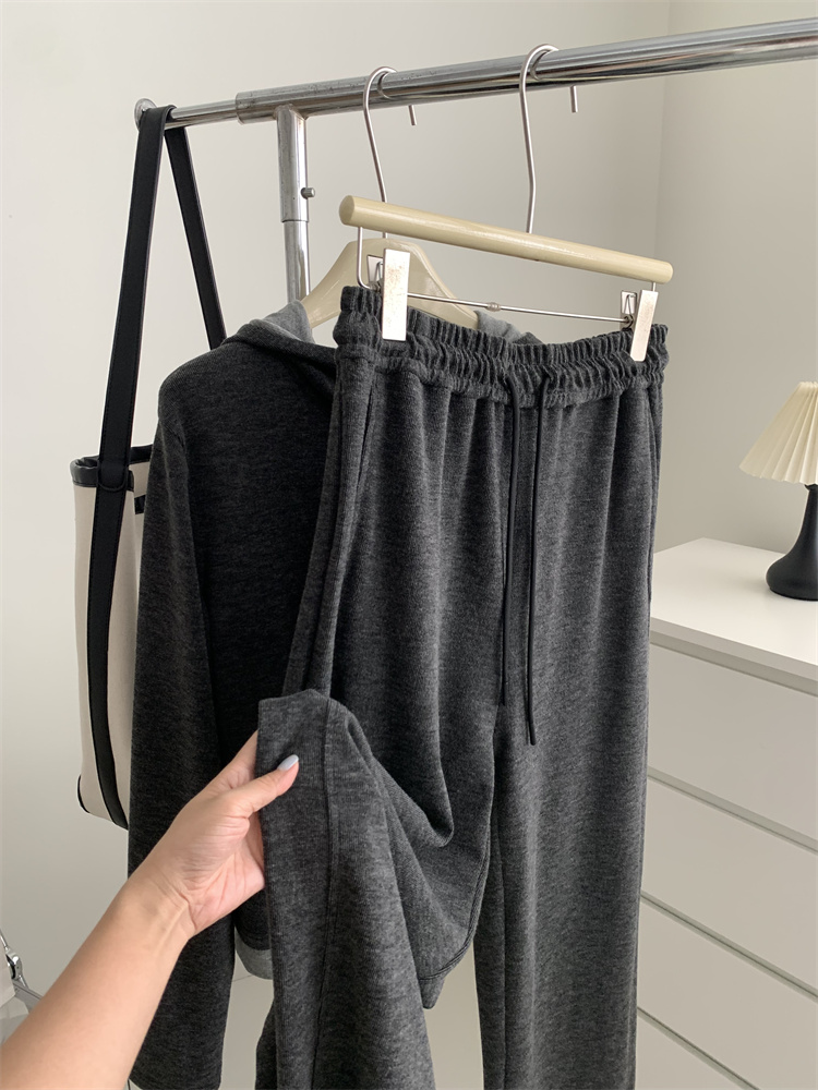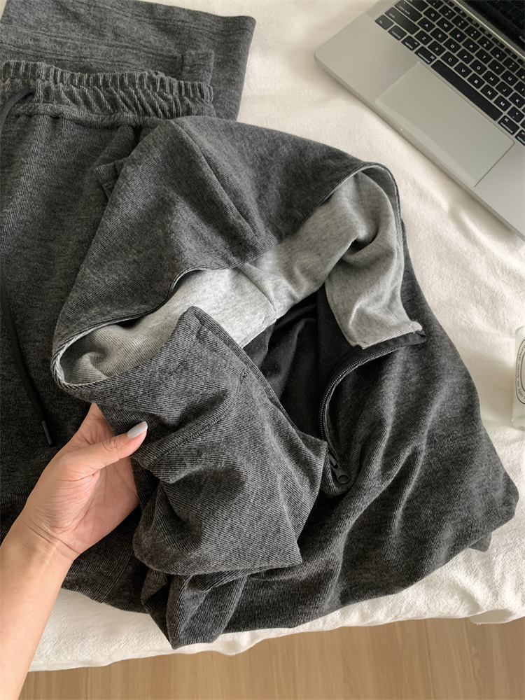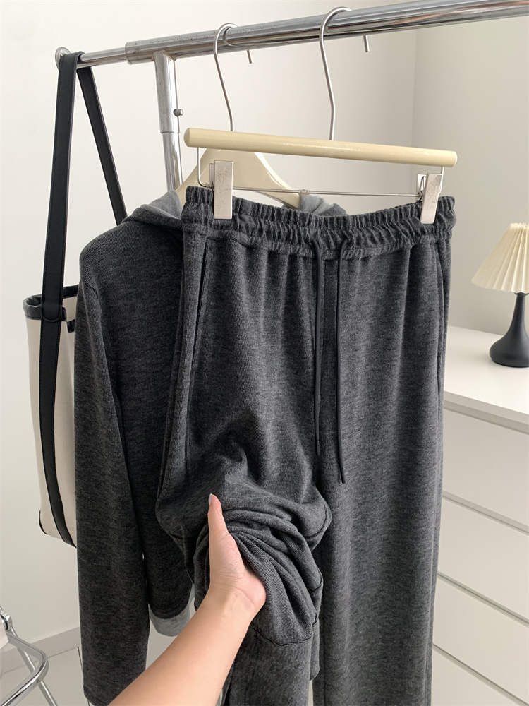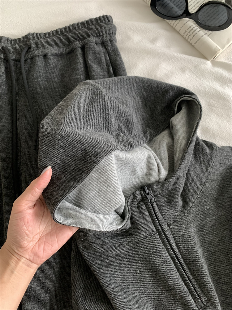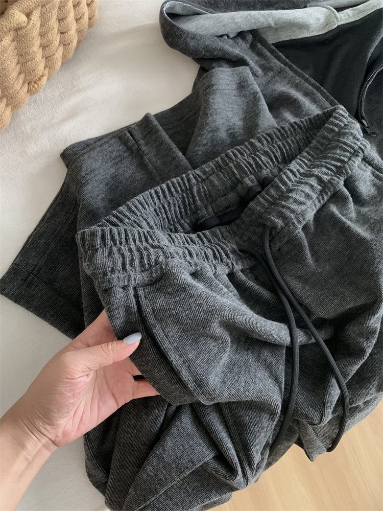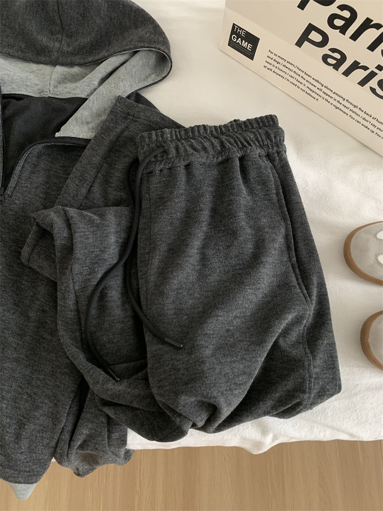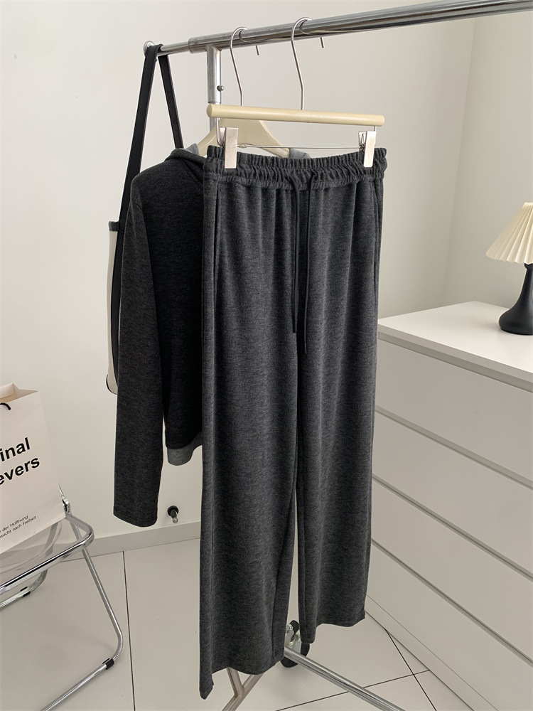 기질 통근 찹쌀 벨벳 게으른 세트 여성 디자인 센스 하프 Zip 색상 차단 후드 와이드 레그 바지 투피스 세트 가을