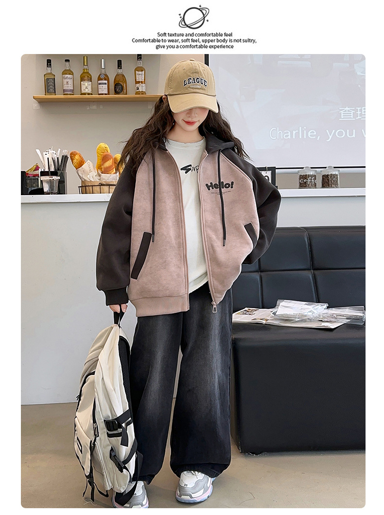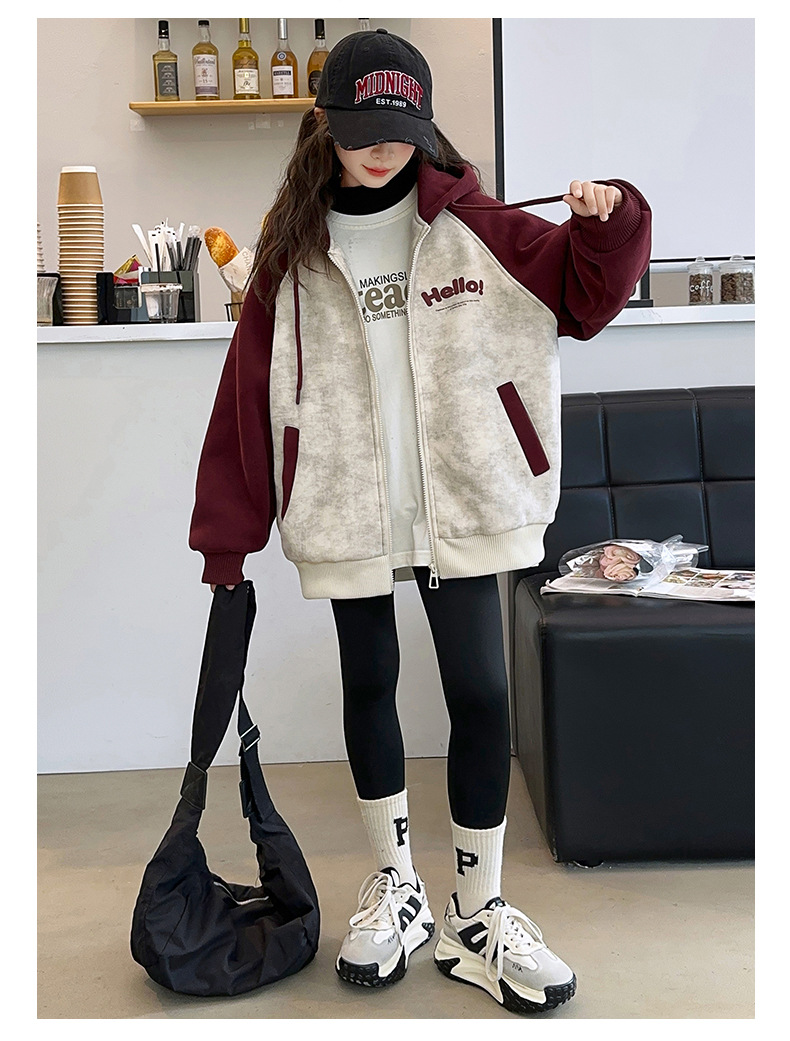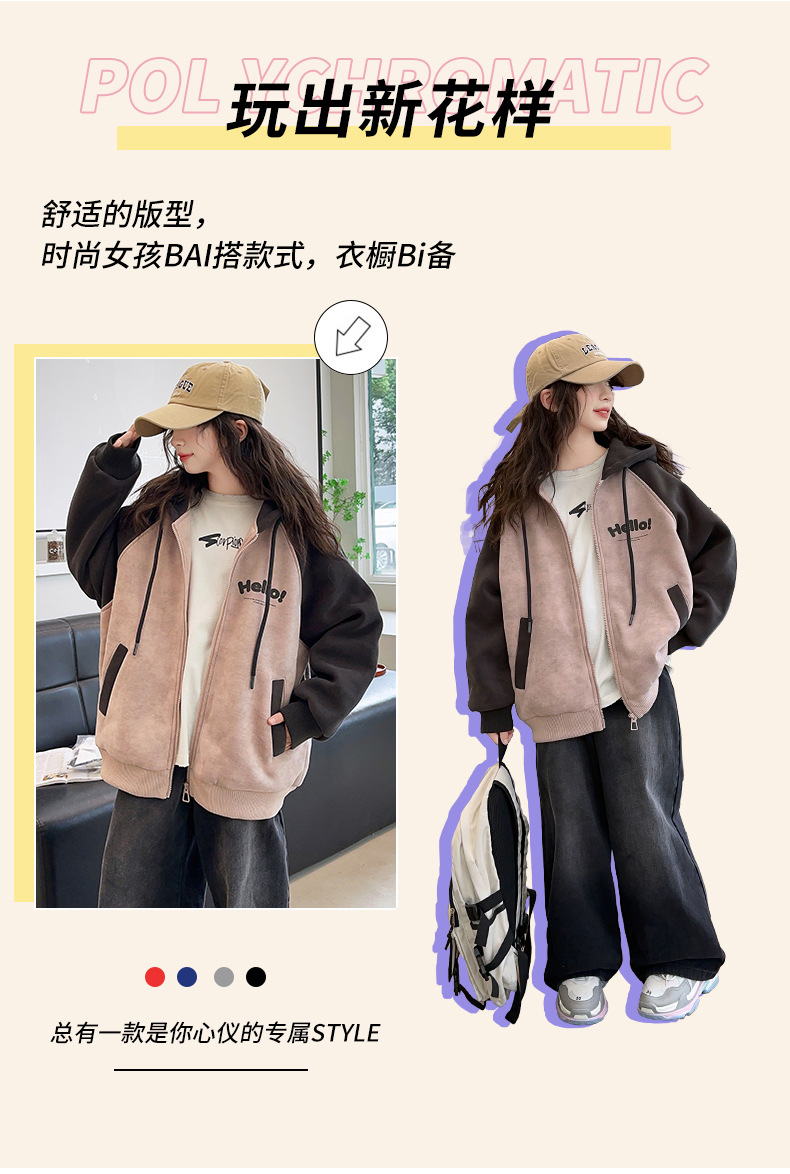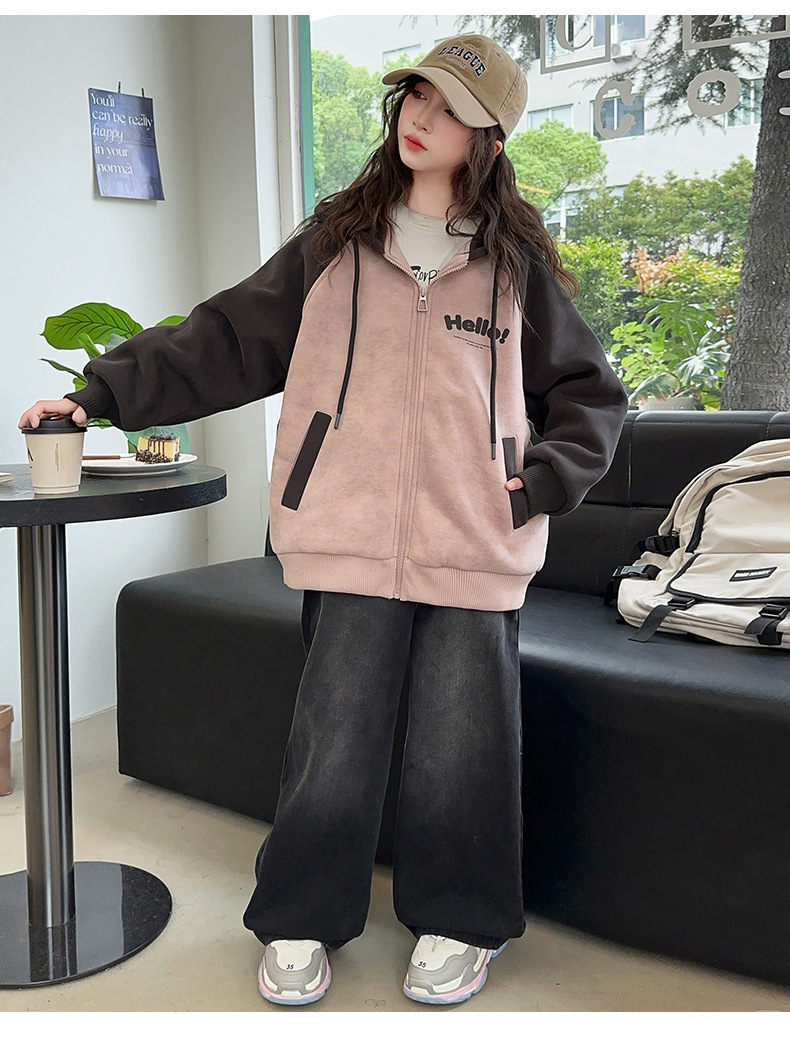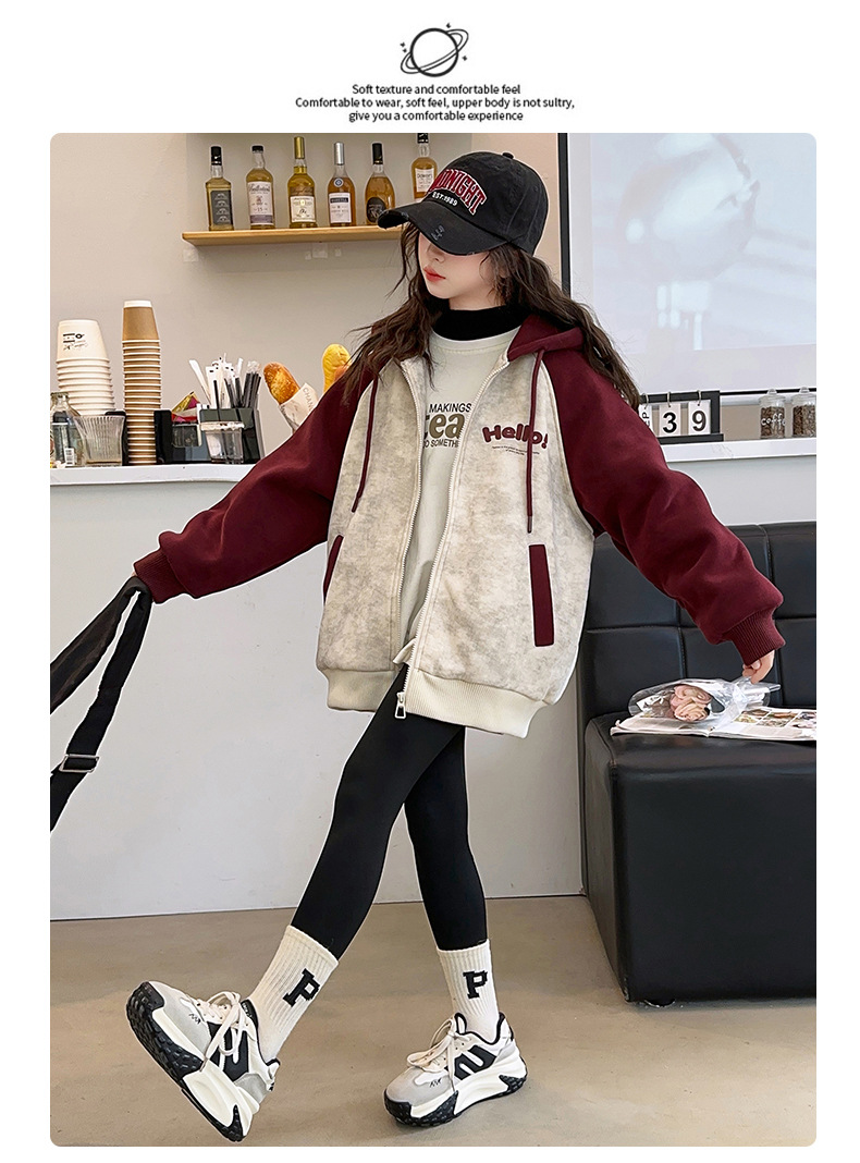 소녀 스웨트 셔츠 가을과 겨울 코트 기모 후드 2024 새로운 스타일 큰 어린이 가을 코트 두꺼운 소녀 캐주얼 루즈 탑스토어 가기