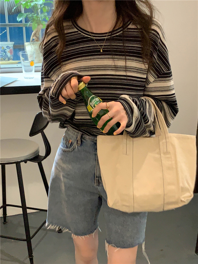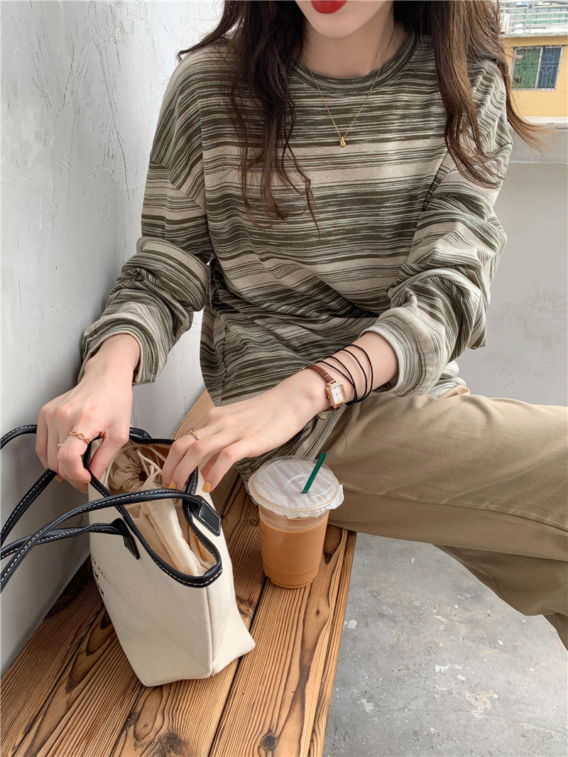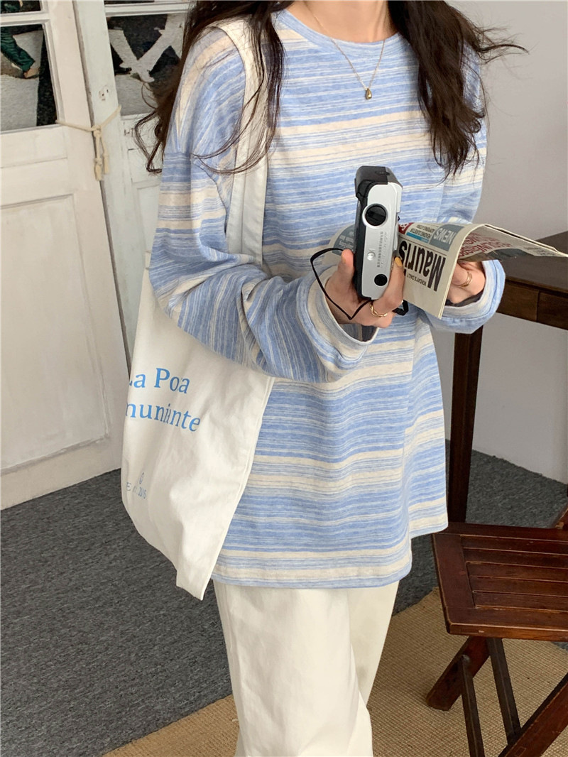 동남아시아 2024 새로운 도착 대학 스타일 가을 줄무늬 긴 소매 티셔츠 한국 라운드 넥 느슨한 탑베이스 셔츠스토어 가기