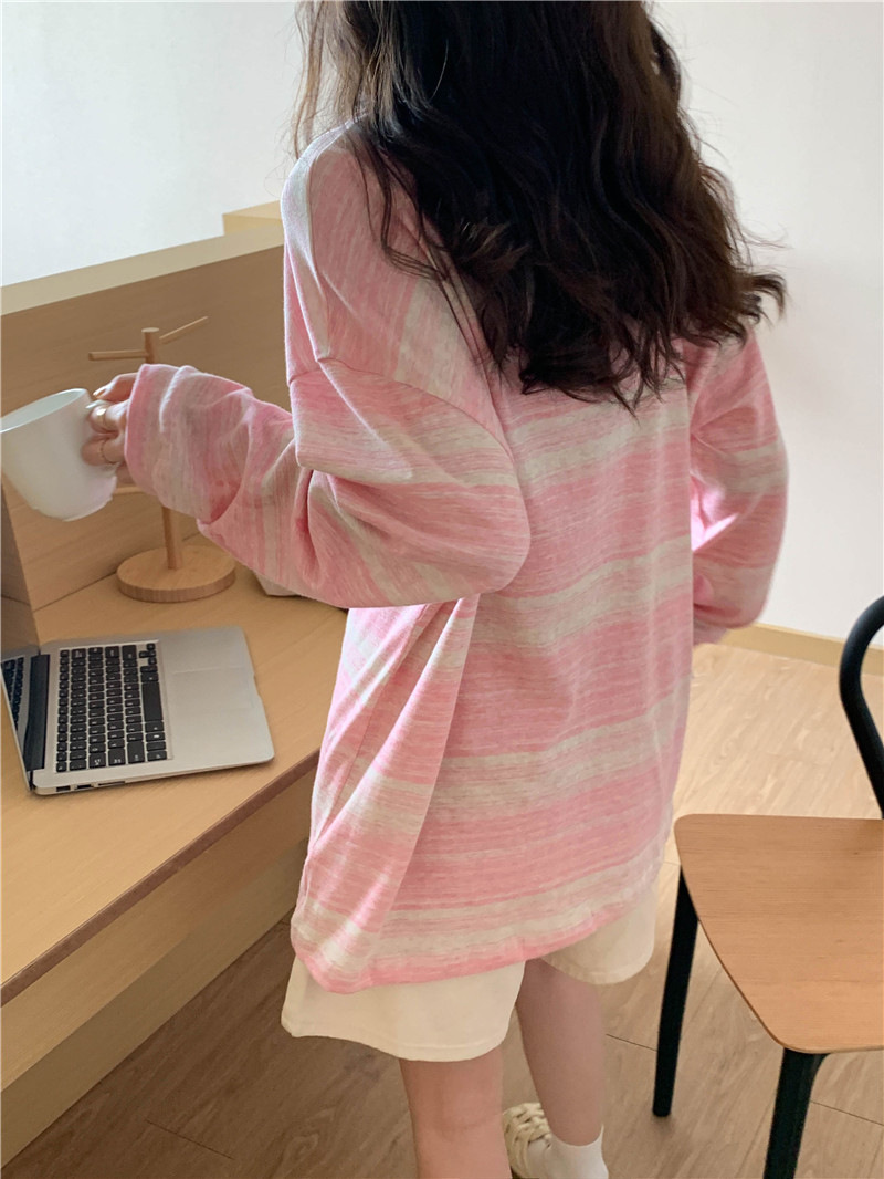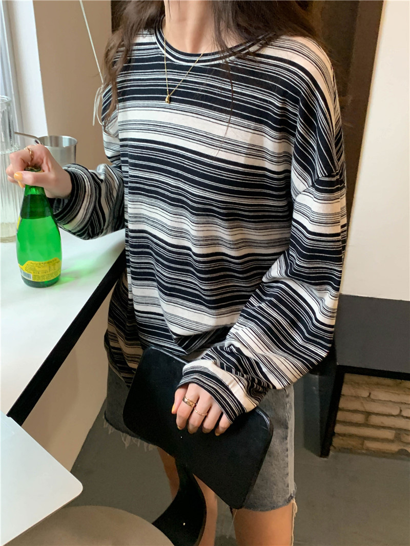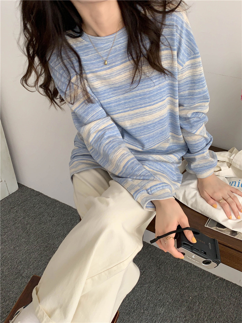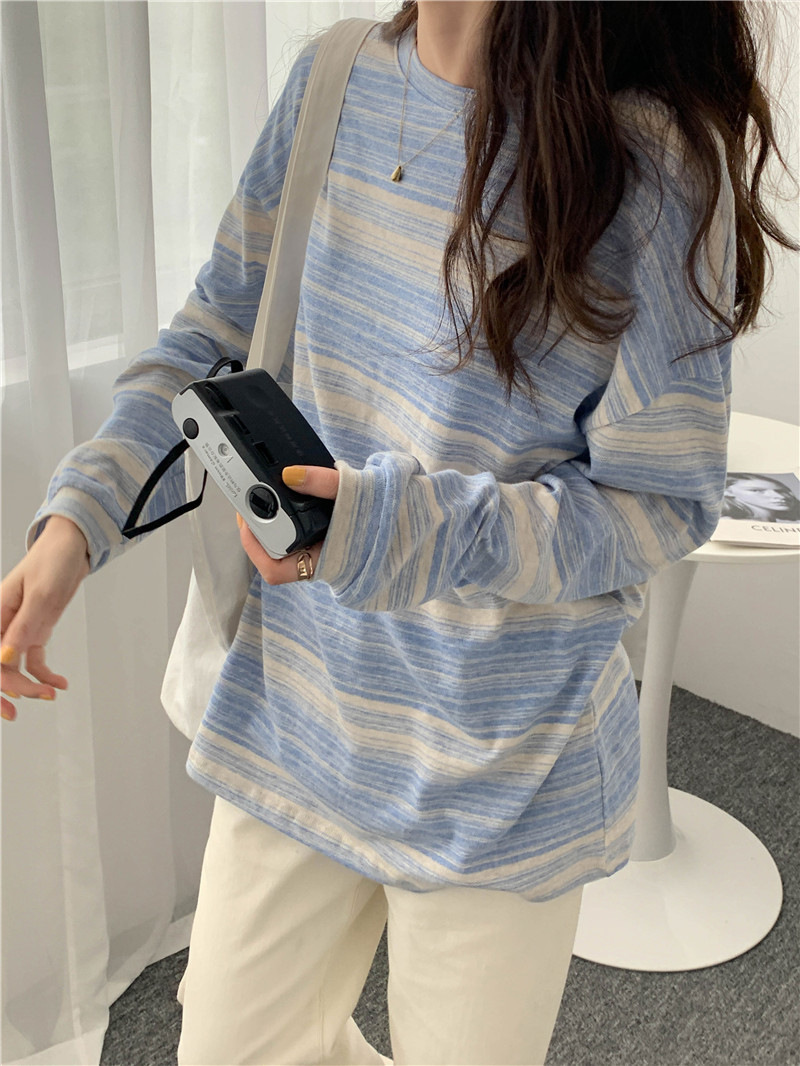 동남아시아 2024 새로운 도착 대학 스타일 가을 줄무늬 긴 소매 티셔츠 한국 라운드 넥 느슨한 탑베이스 셔츠