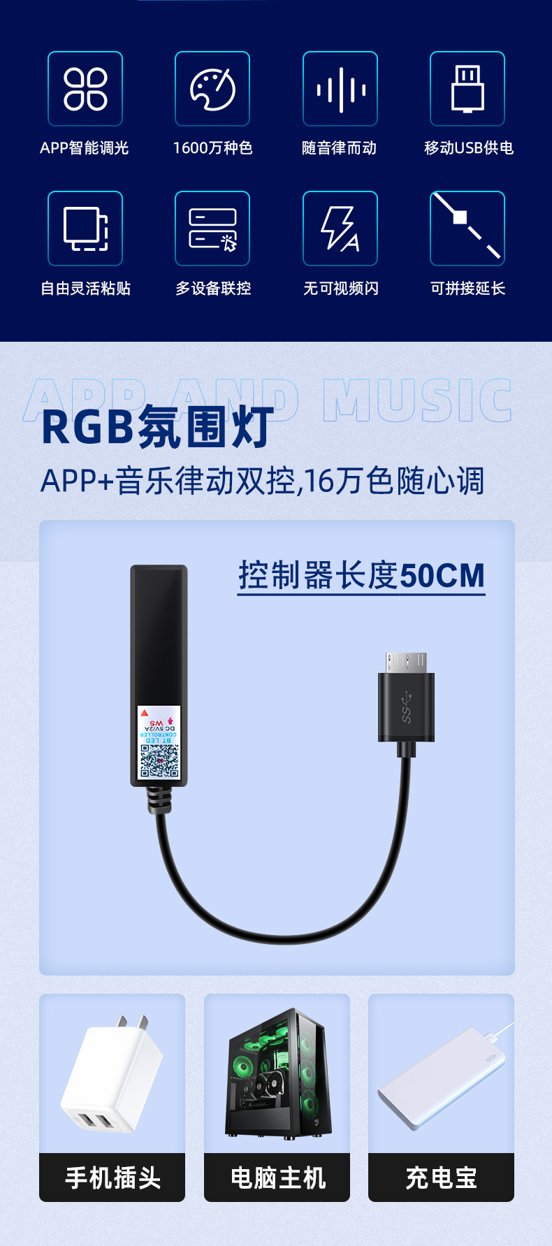 • 5V-럭셔리 블루투스 버전(블루투스 업그레이드 + 리모콘) usb+RGB 라이트 스트립 [ 1.3m 조명]