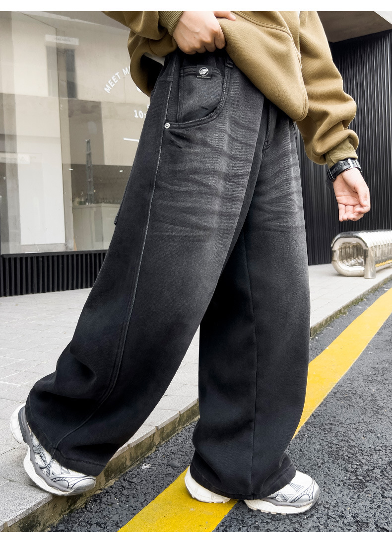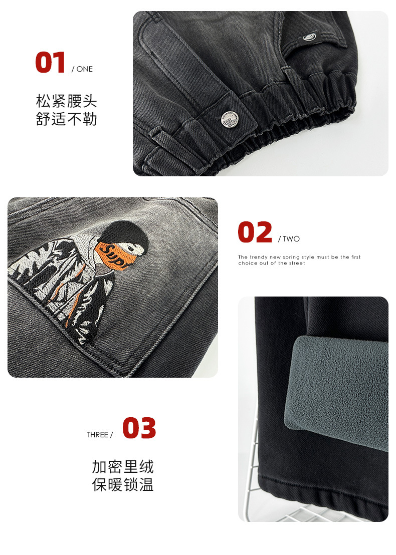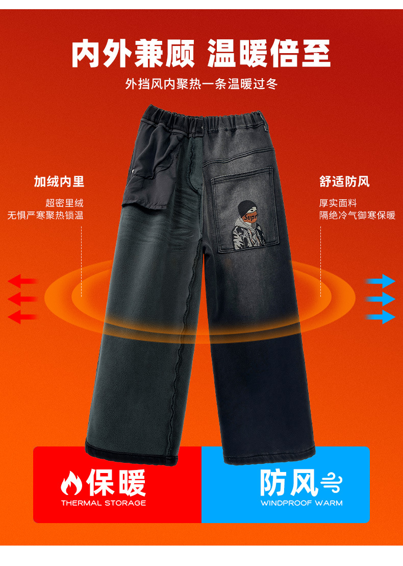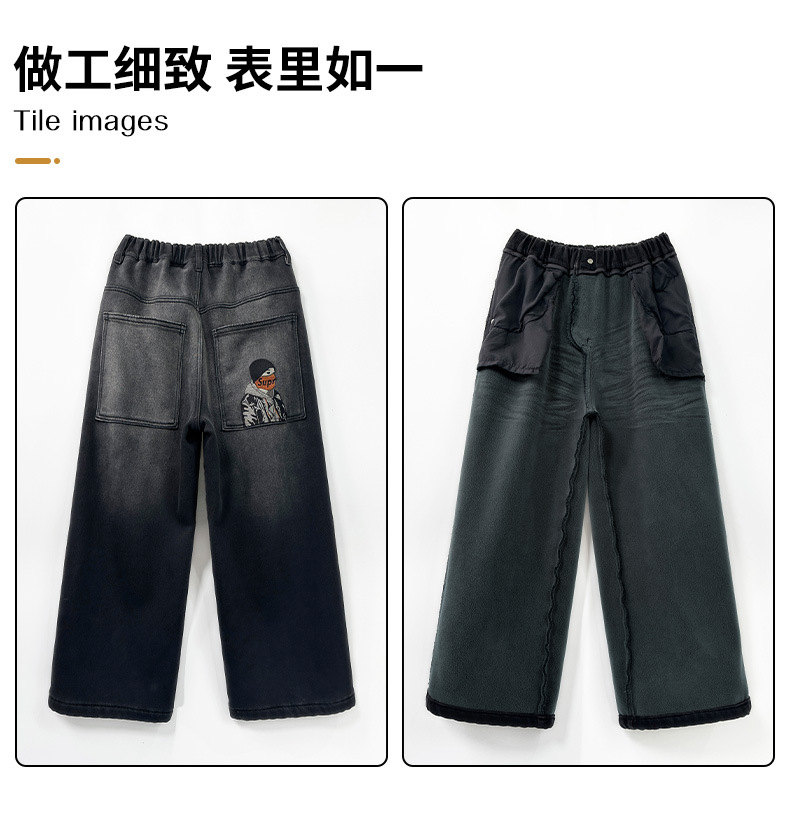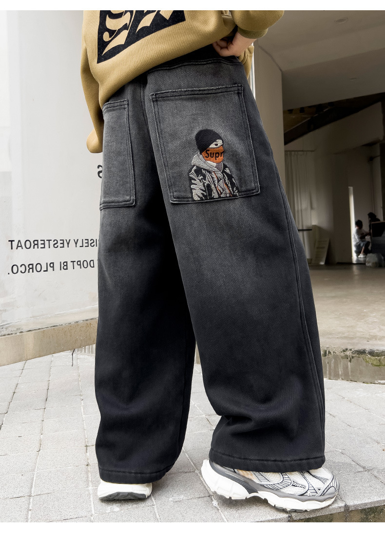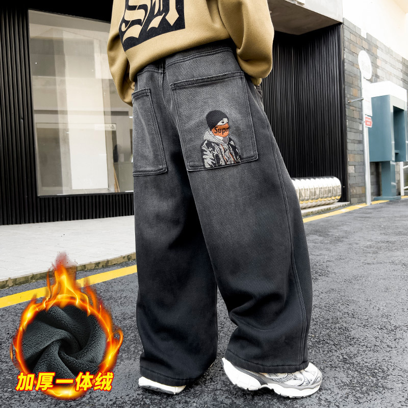 Z1348 원바디 벨벳 초기 양 소년 겨울 긴 바지 기모 중년 및 대형 어린이를위한 두꺼운 유행 느슨한 청바지