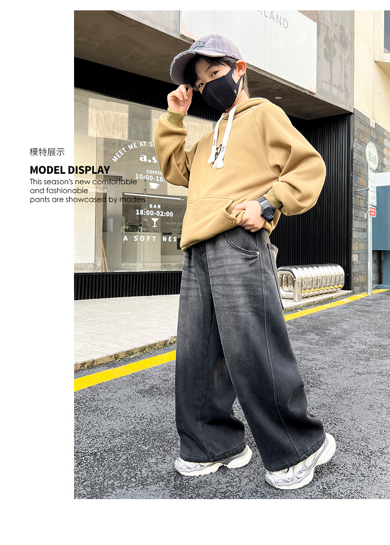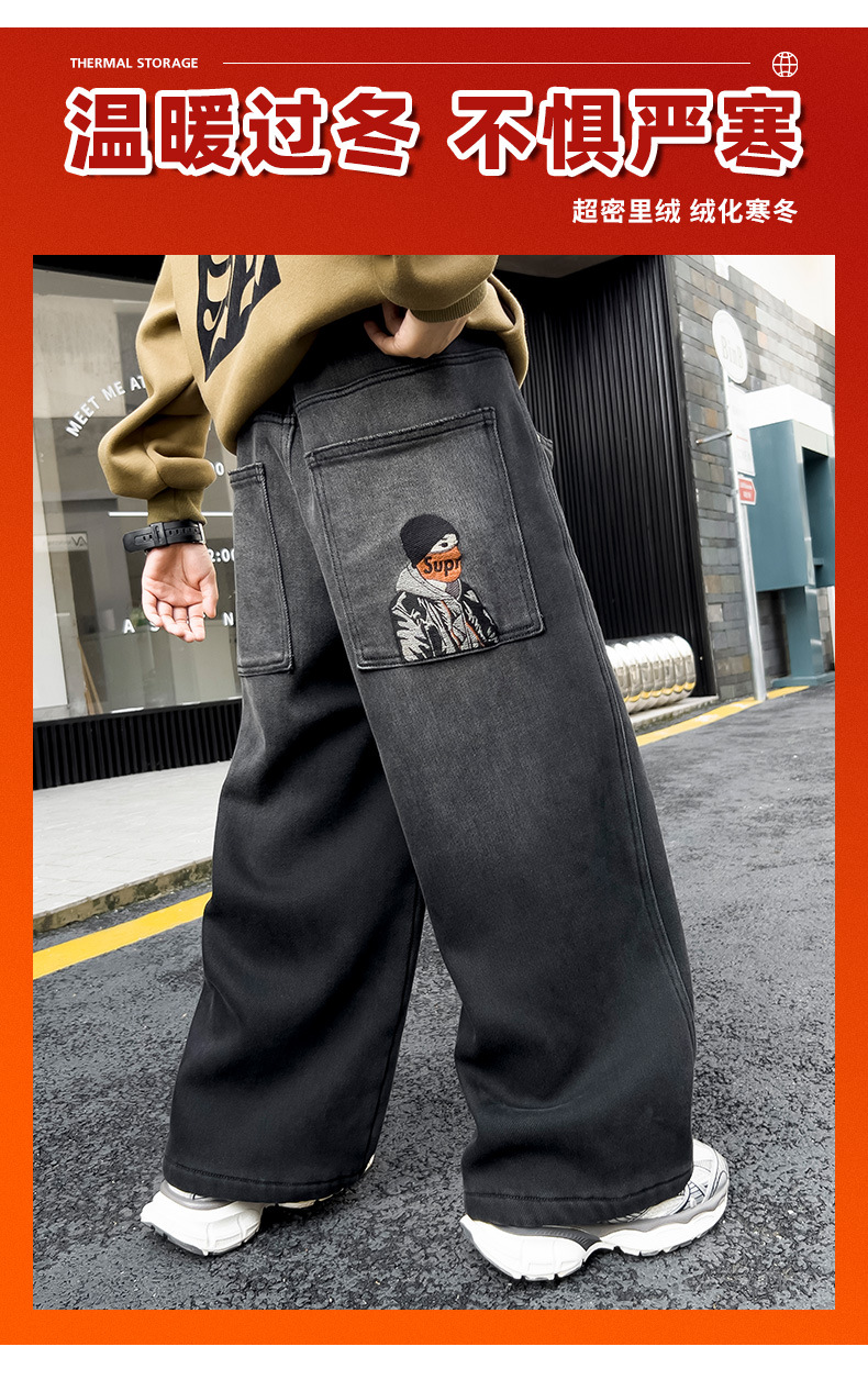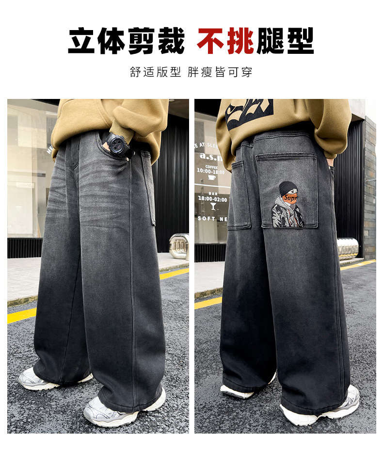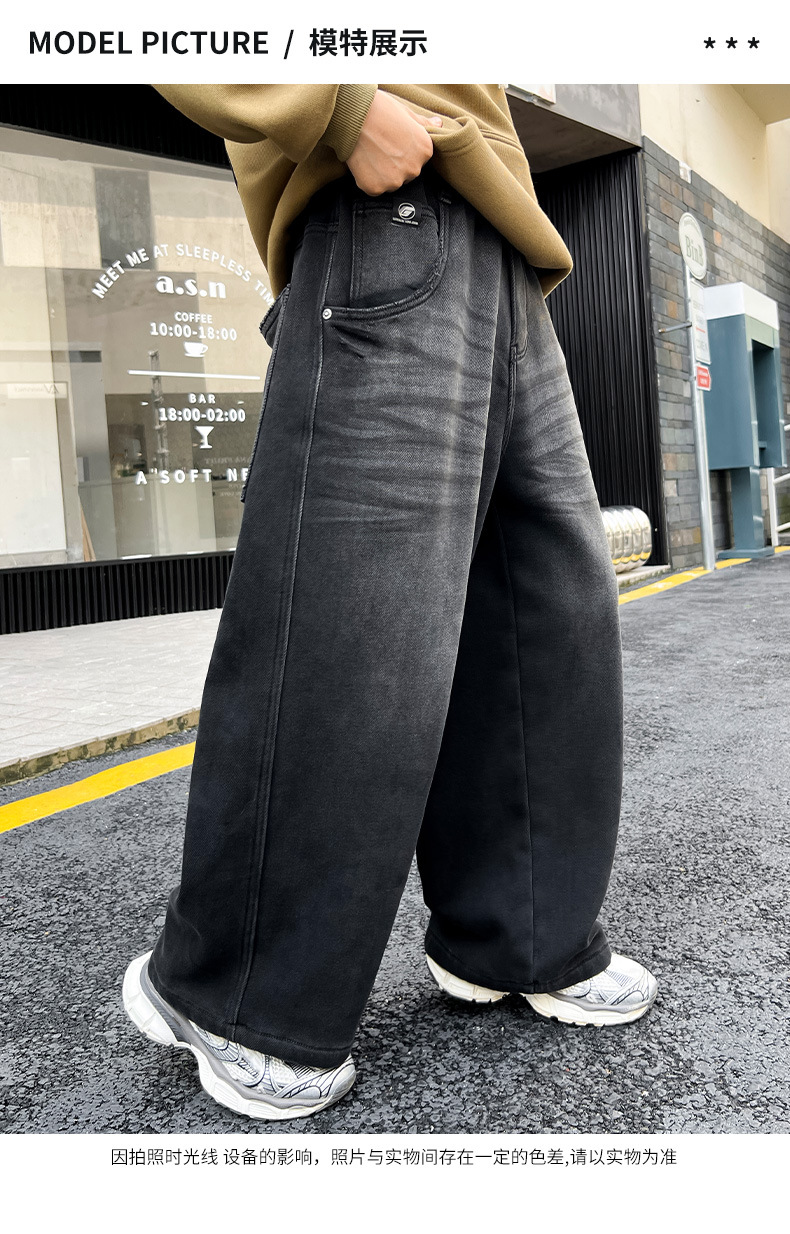 Z1348 원바디 벨벳 초기 양 소년 겨울 긴 바지 기모 중년 및 대형 어린이를위한 두꺼운 유행 느슨한 청바지스토어 가기