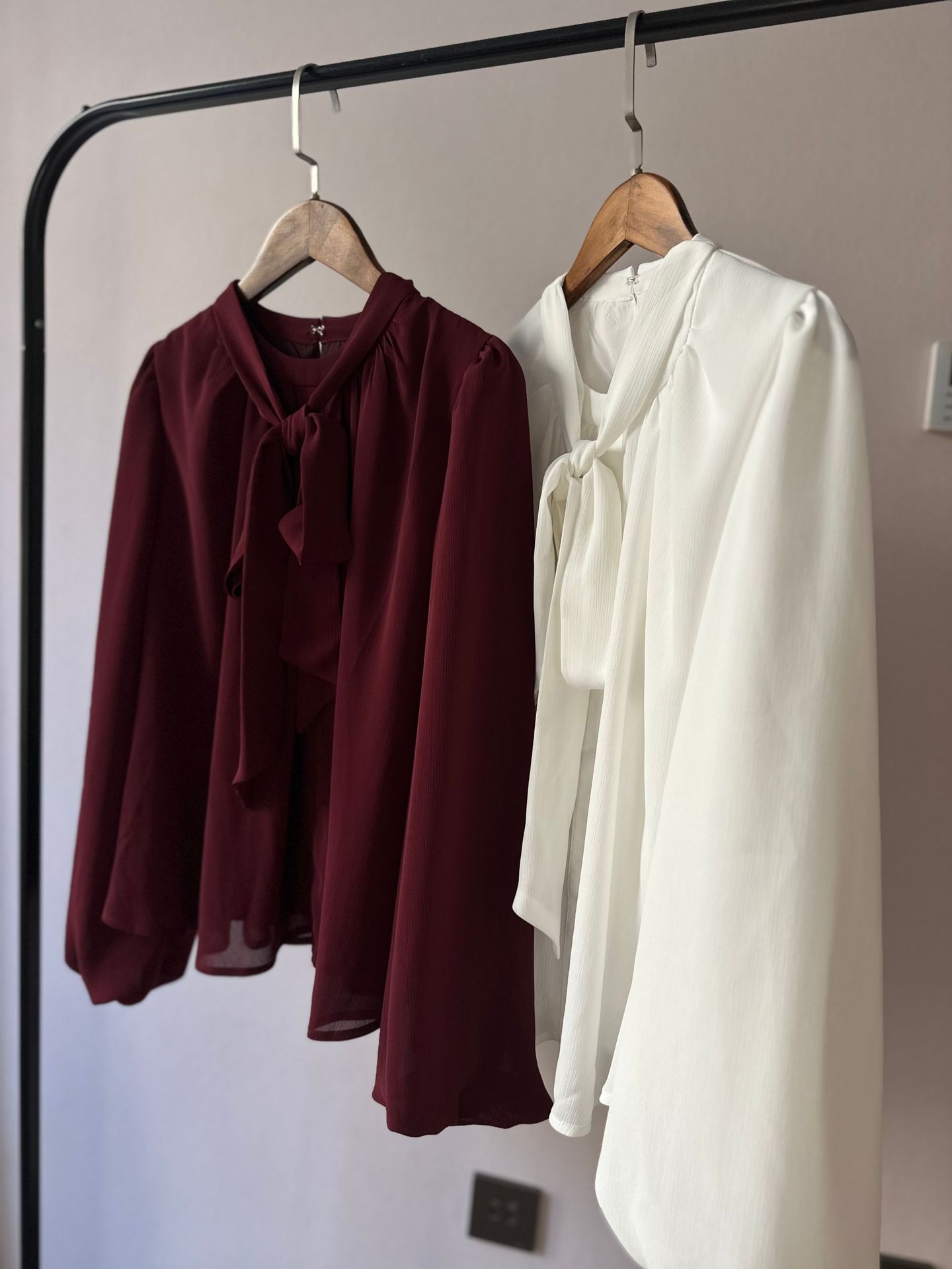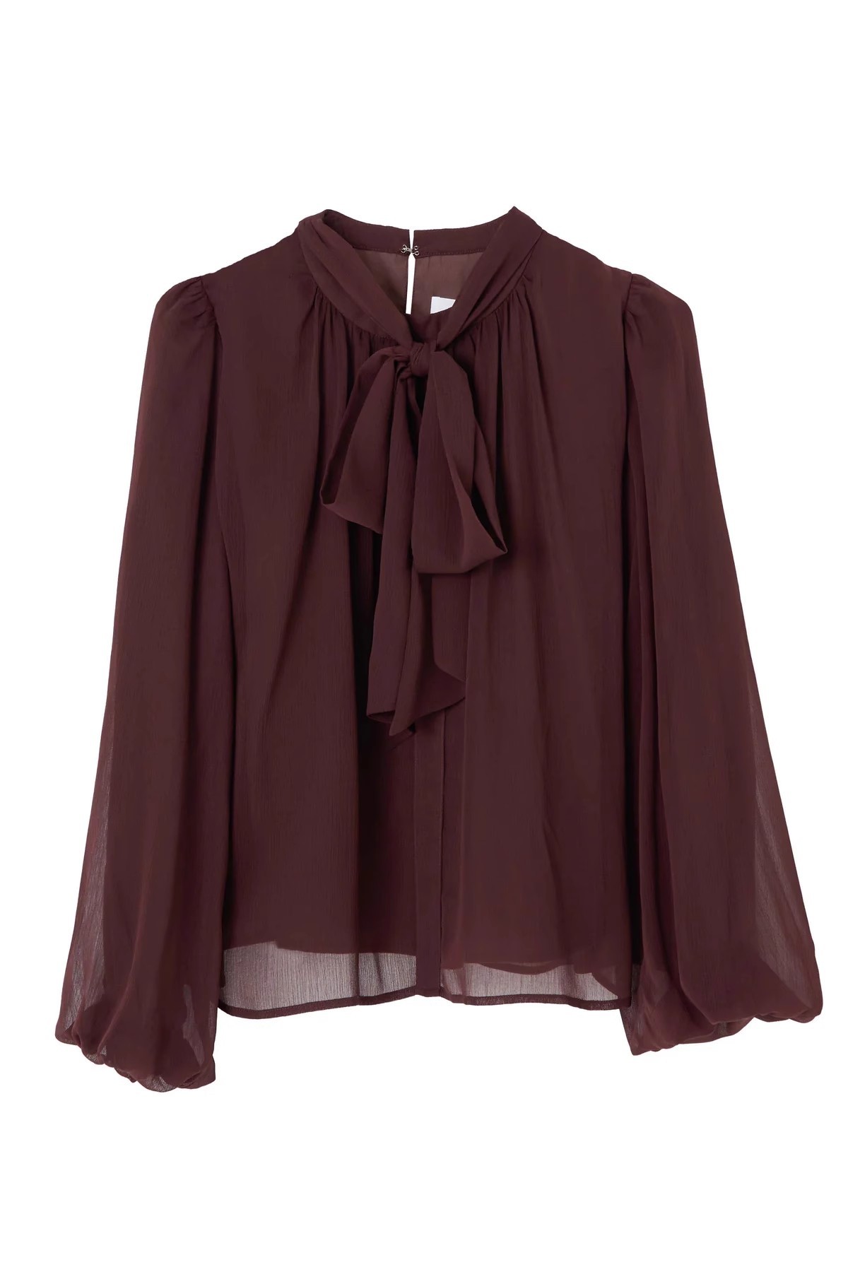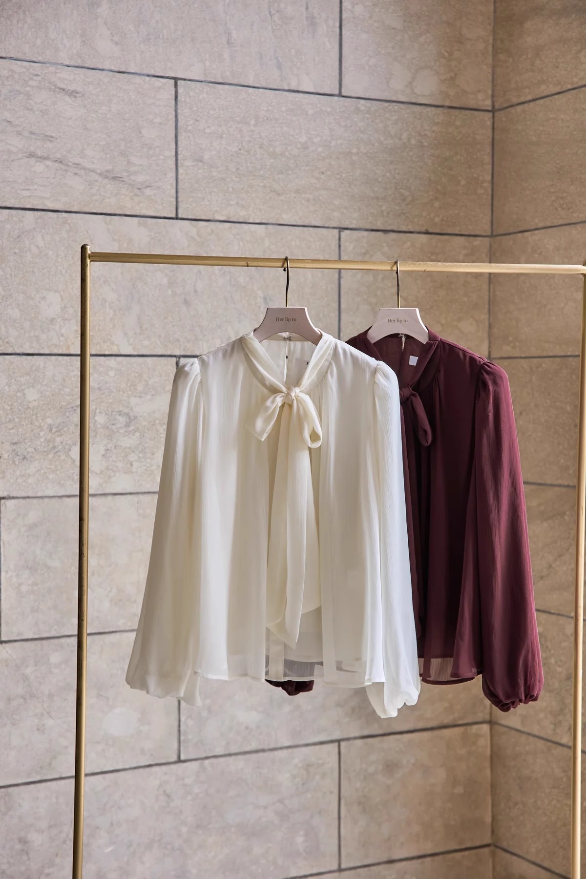 WZFS24075 가을과 겨울 황후 홈 보우 랜턴 슬리브 루즈 쉬폰 라이트 얇은 셔츠베이스 탑 크로스 국경스토어 가기