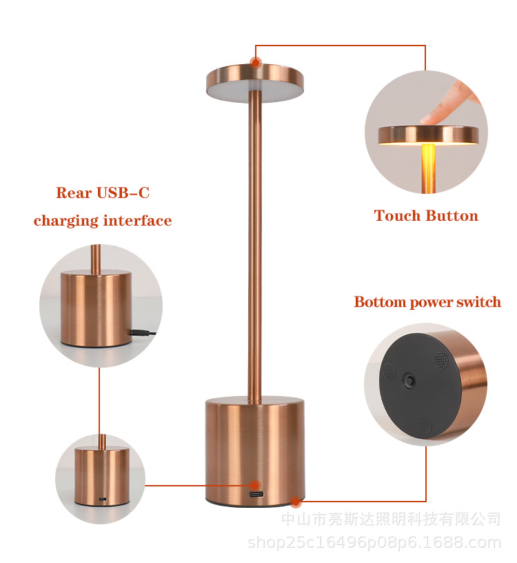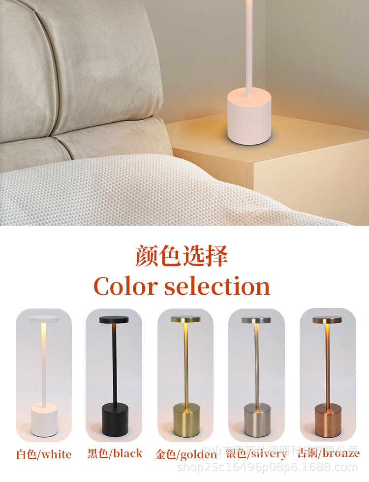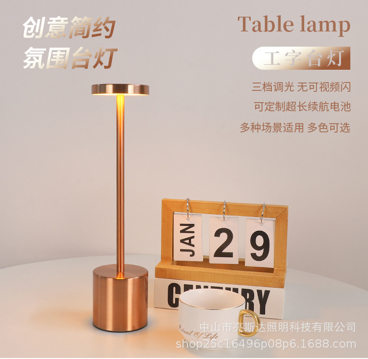 产品名称:工字台灯 光色:三色+无极调光 灯珠:24 SMD (12白12黄) 材质:铁+亚克力 充电方式:Type C USB 5V 0.5A 开关模式:触摸开关 长按无极调光 电池:3.7V/800mA 18650 色温:2200K-6000K 130LM 充电红灯,充满绿灯