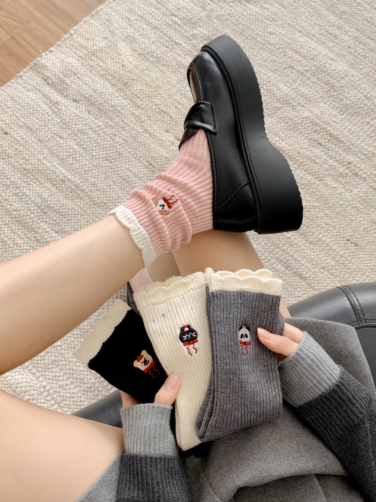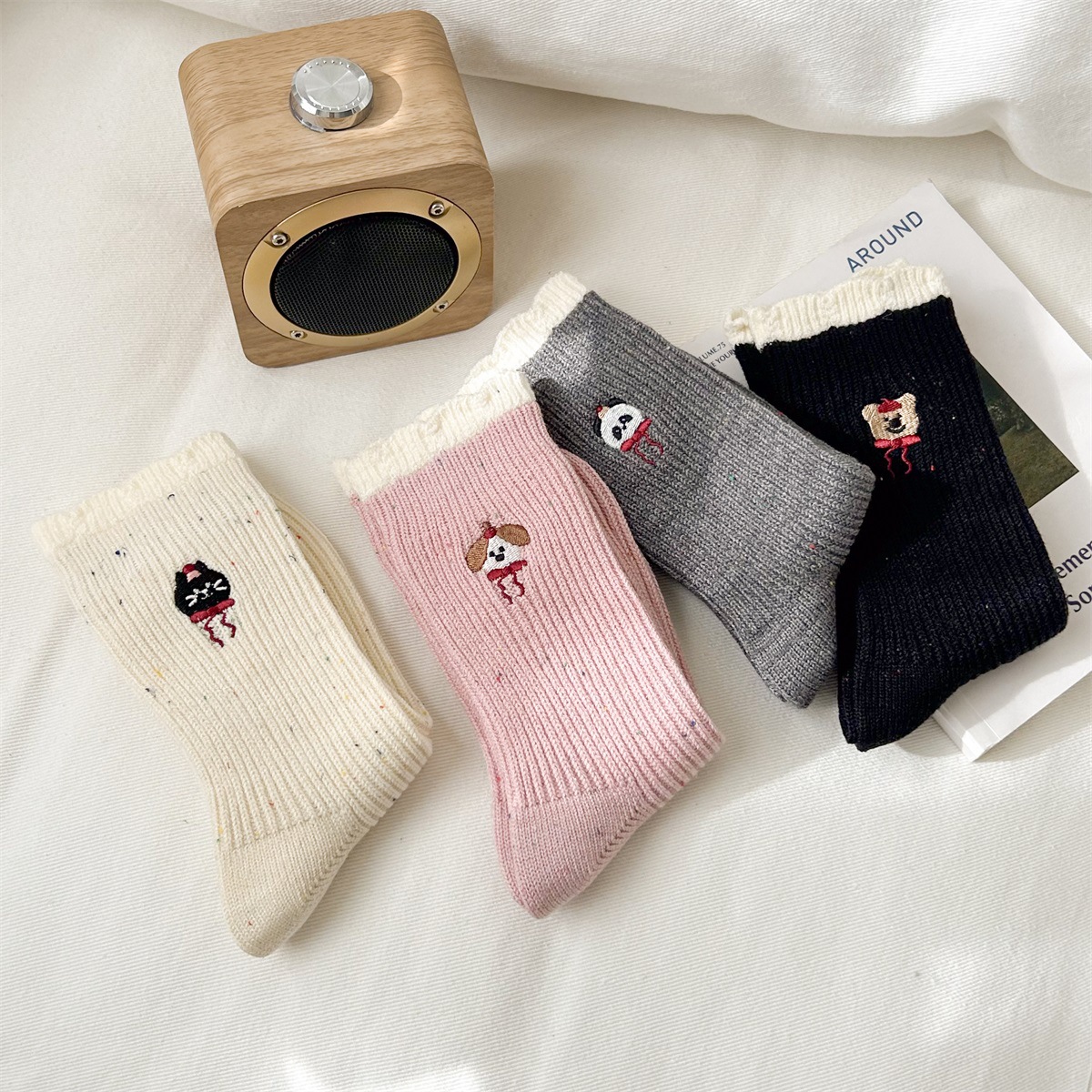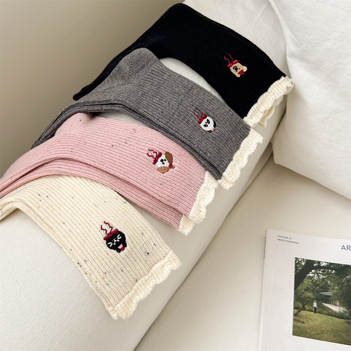 가을과 겨울 귀여운 강아지 자수 캐시미어 양말 여성용 미드 튜브 양말 달콤한 레이스 귀 가장자리 대비 컬러 니트 스택 양말