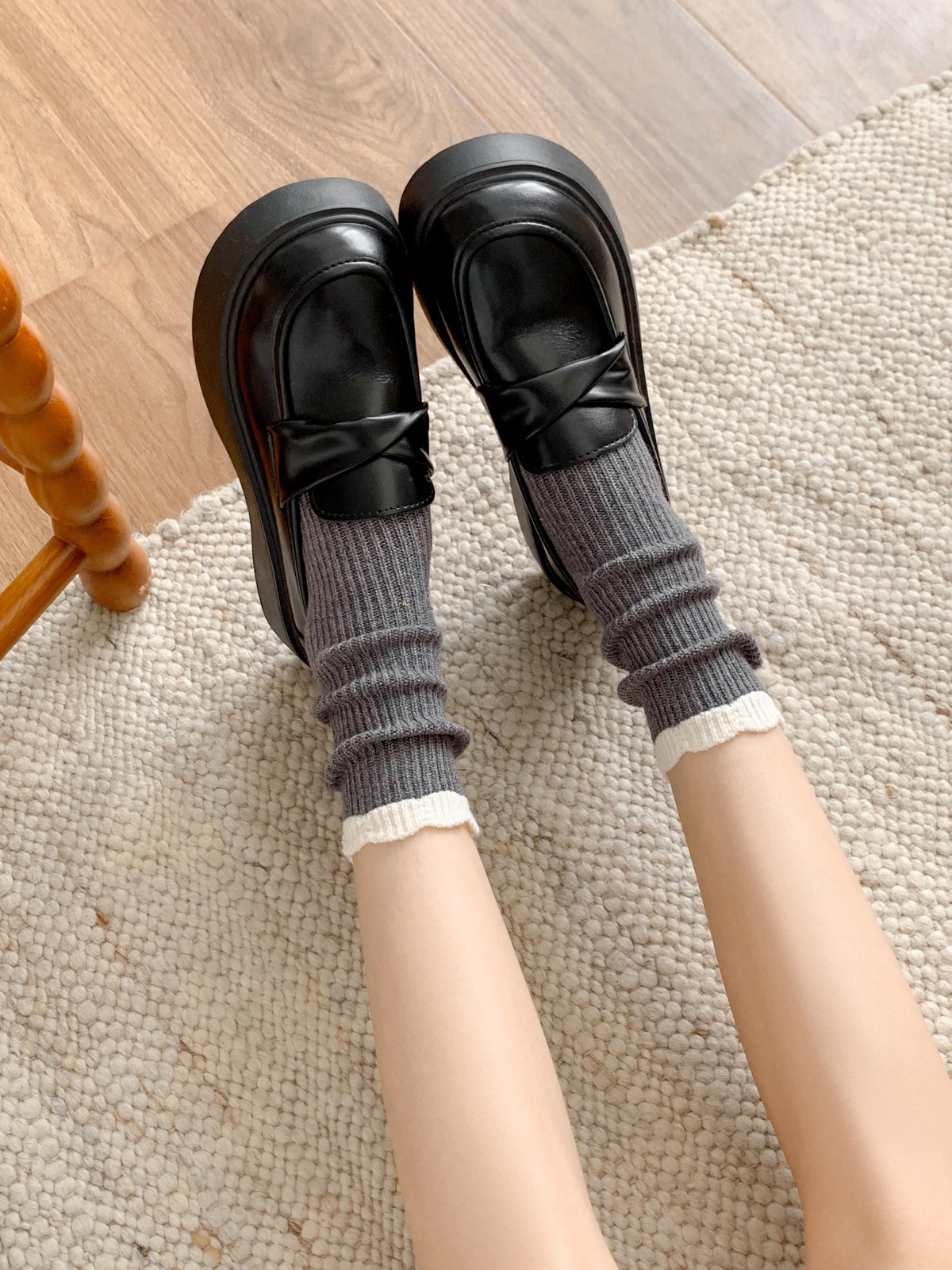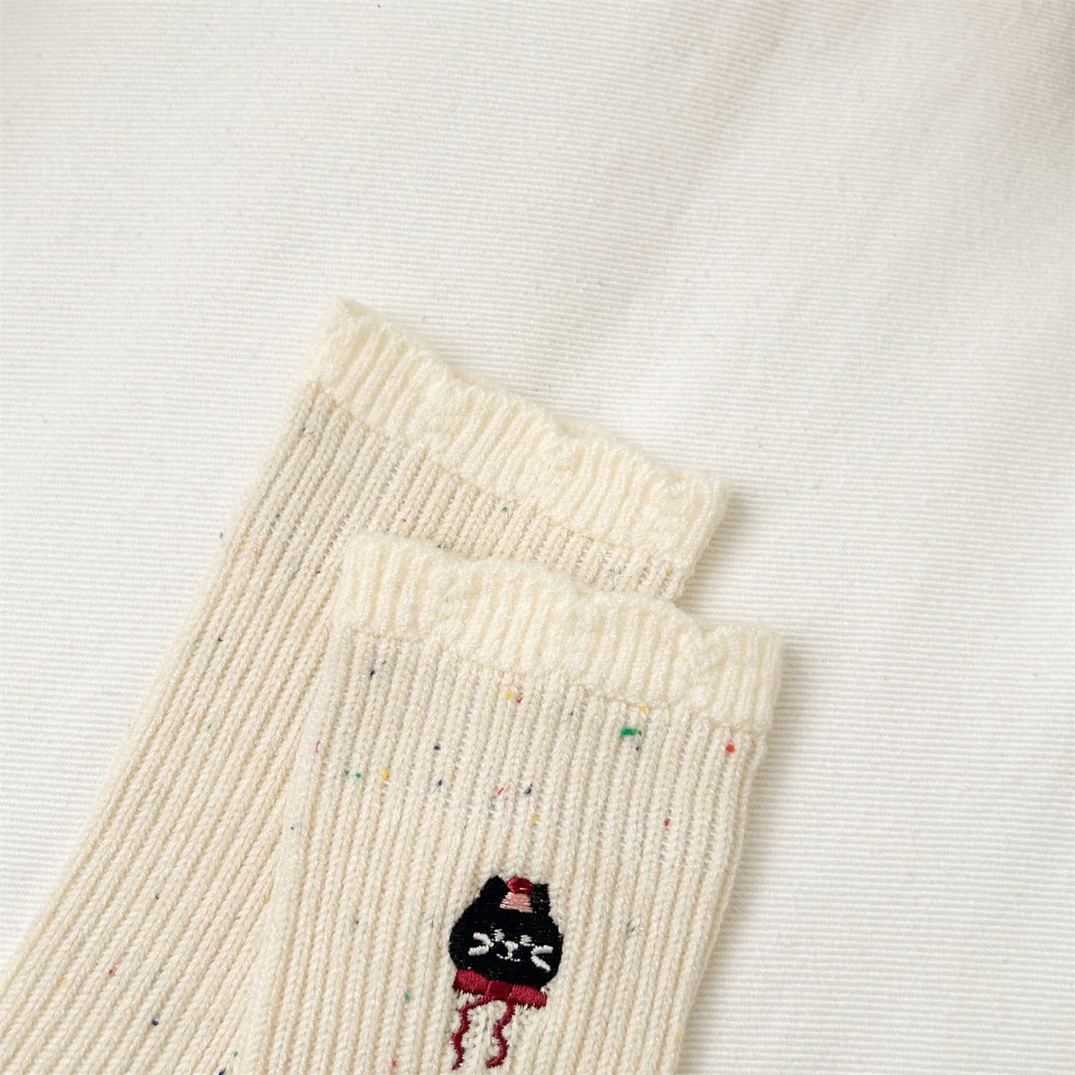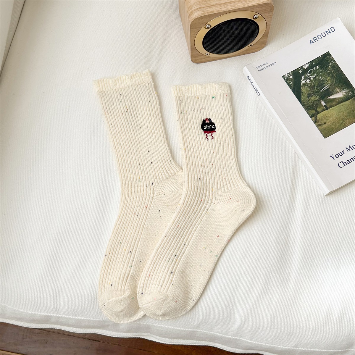 가을과 겨울 귀여운 강아지 자수 캐시미어 양말 여성용 미드 튜브 양말 달콤한 레이스 귀 가장자리 대비 컬러 니트 스택 양말