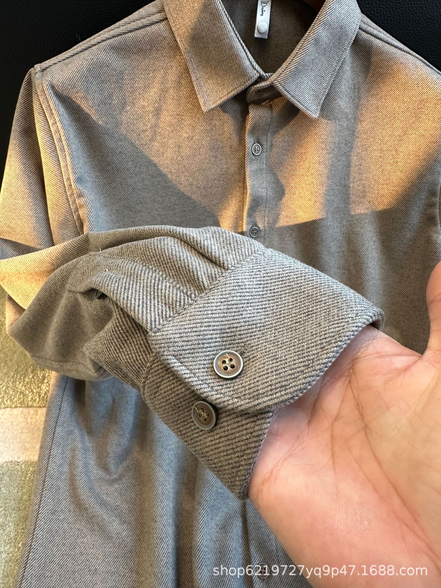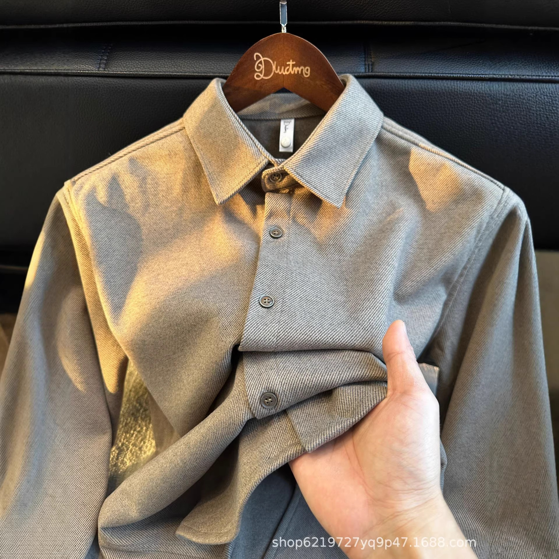 브라운 레트로 스타일! 남성용 브라운 브러시 퀼팅 따뜻한 셔츠 긴팔 슬림 가을, 겨울 남성용 두꺼운 셔츠
