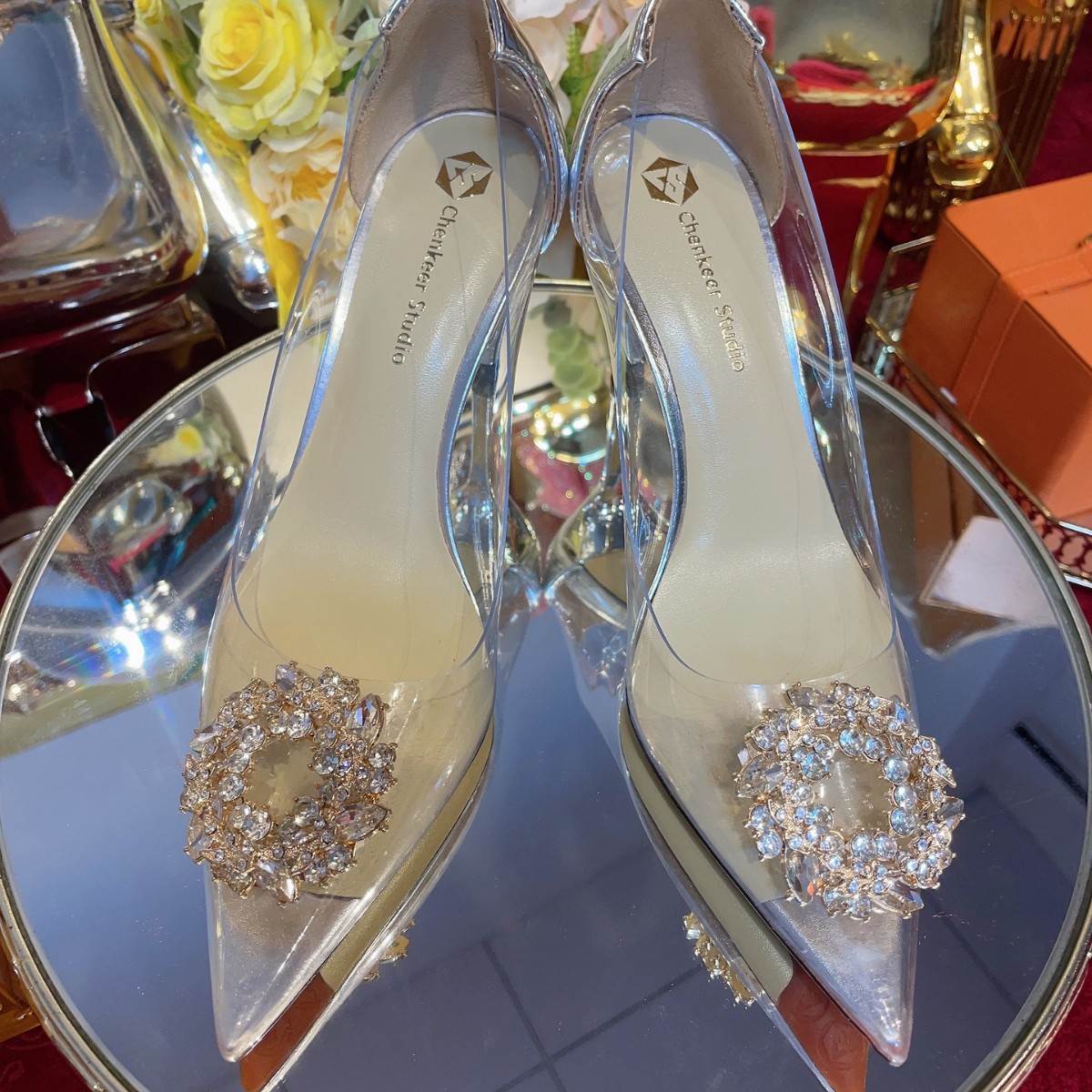 프랑스 투명 하이힐 여성용 스틸레토 힐 2024 여름 새로운 도착 아름다운 크리스탈 웨딩 신발 라인스톤 포인팅 신발스토어 가기