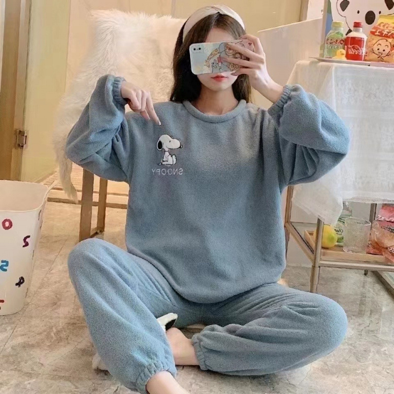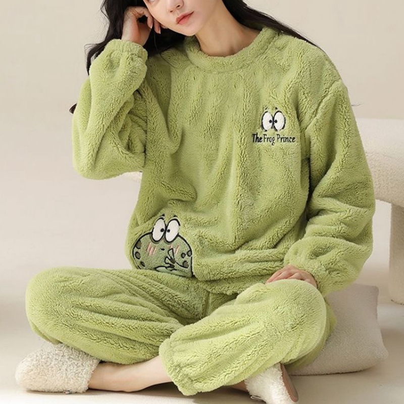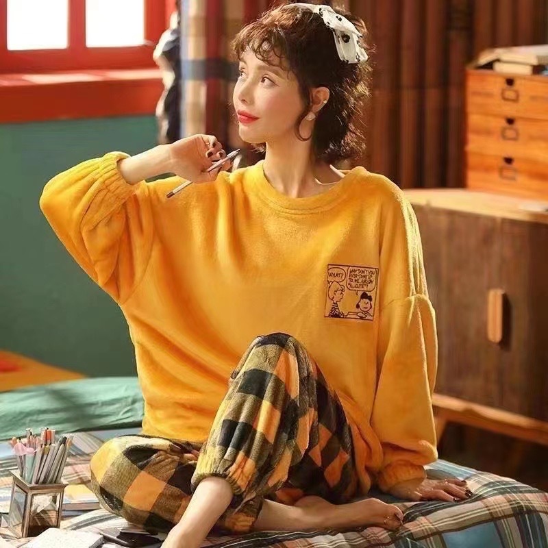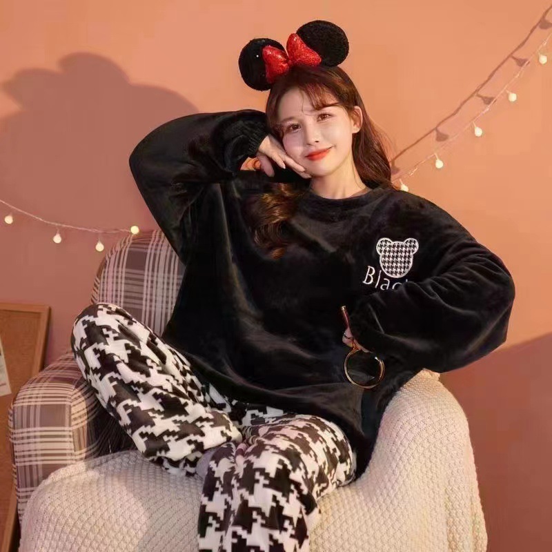 만화 달콤한 비뚤어진 곰 잠옷 여성의 가을과 겨울 산호 양털 두꺼운 느슨한 플러스 사이즈 대외 무역 국경 세트스토어 가기