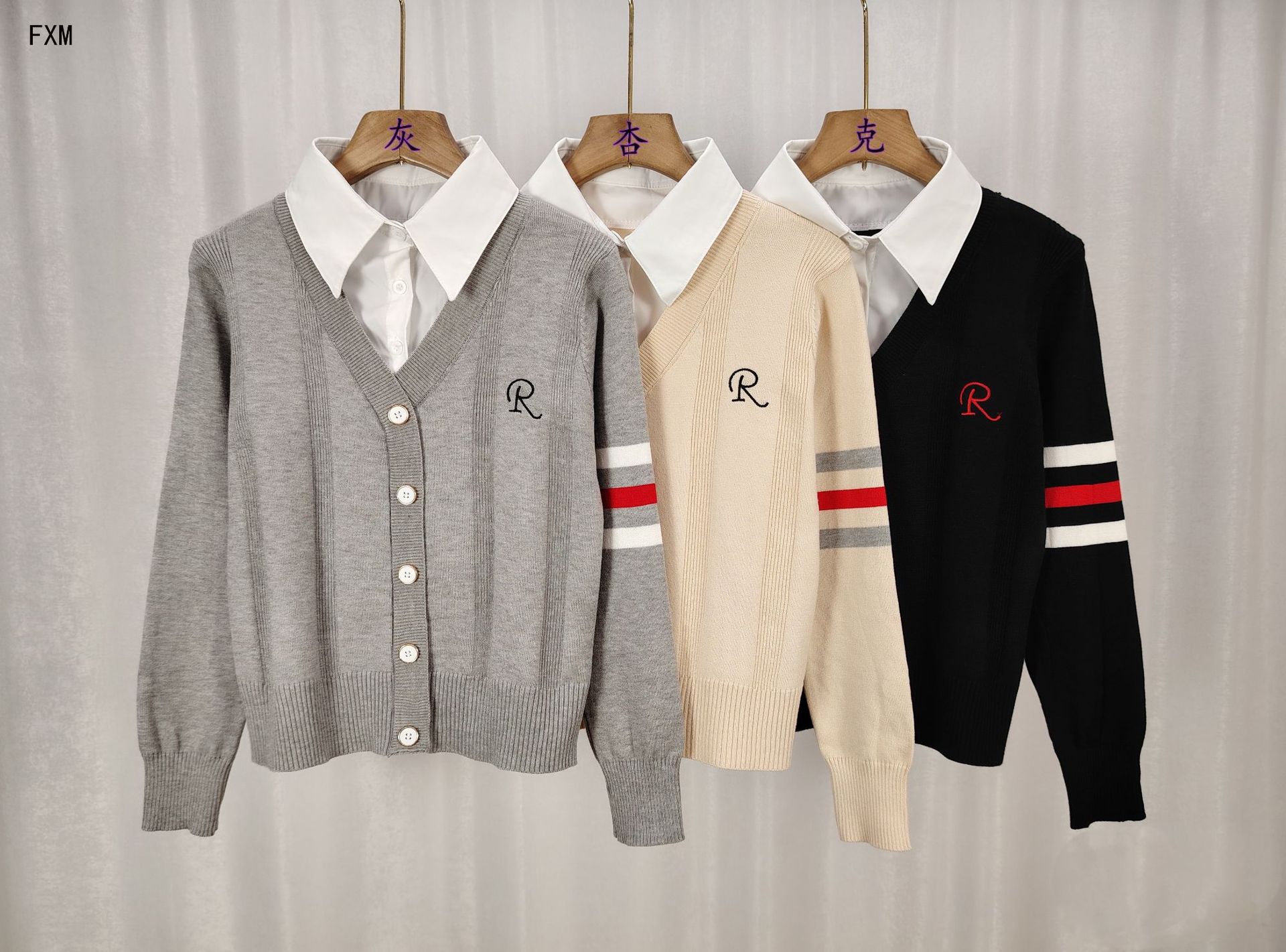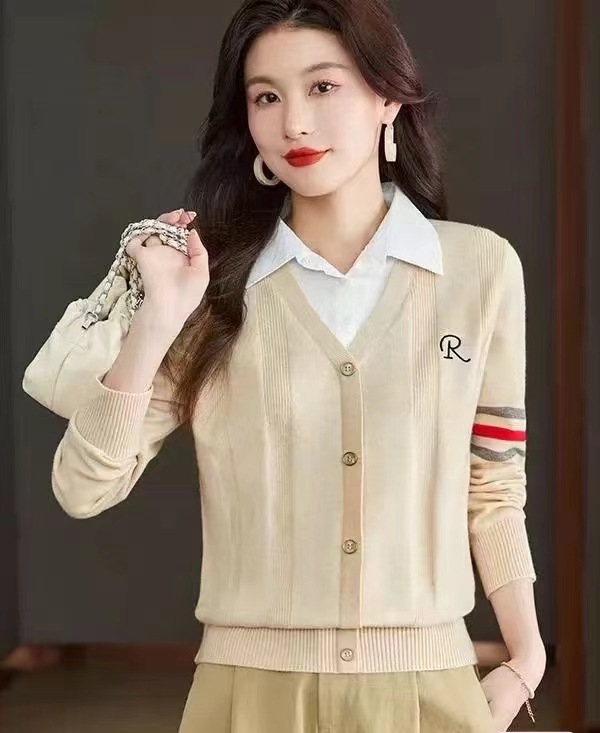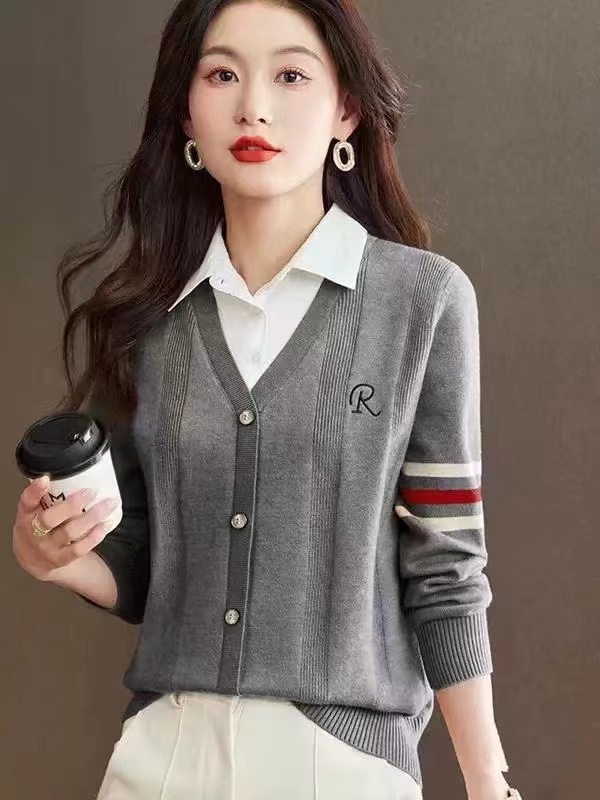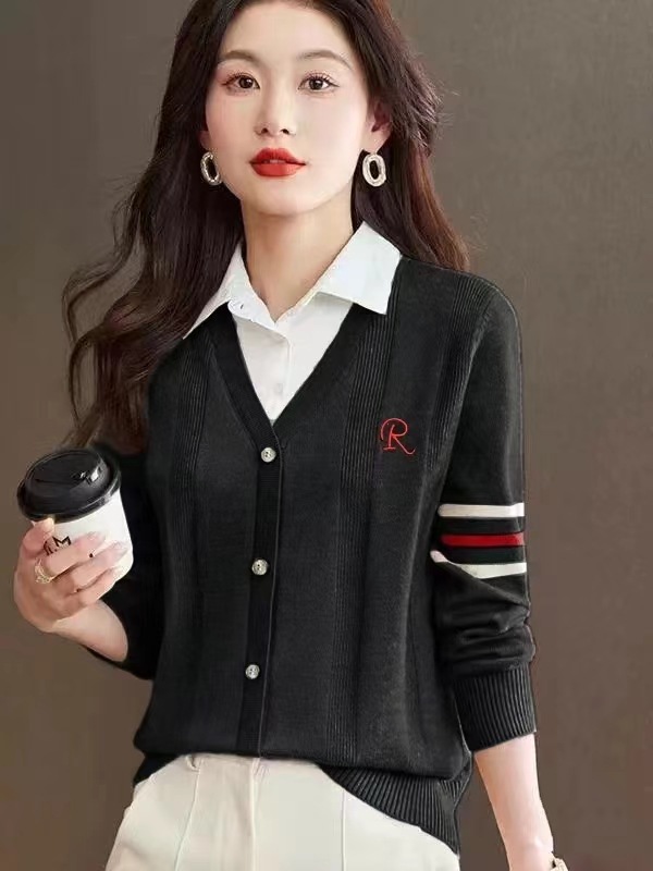 가짜 투피스 셔츠 칼라 스티칭 니트웨어 여성용 세련된 학술 스타일 가짜 카디건 탑 2024 가을 새 셔츠