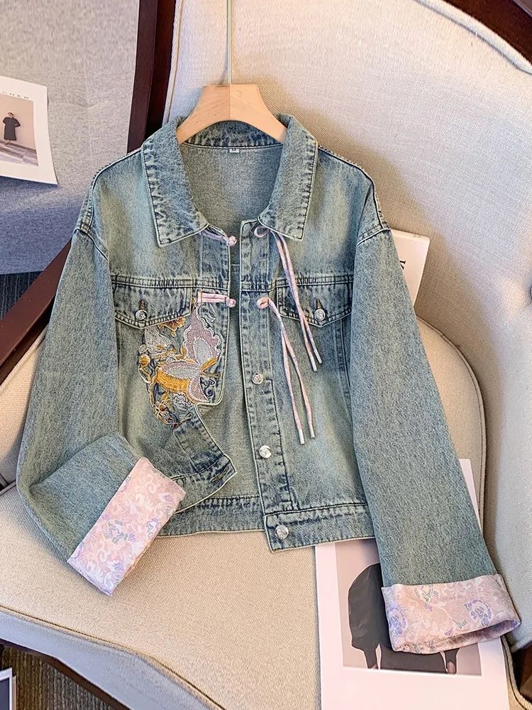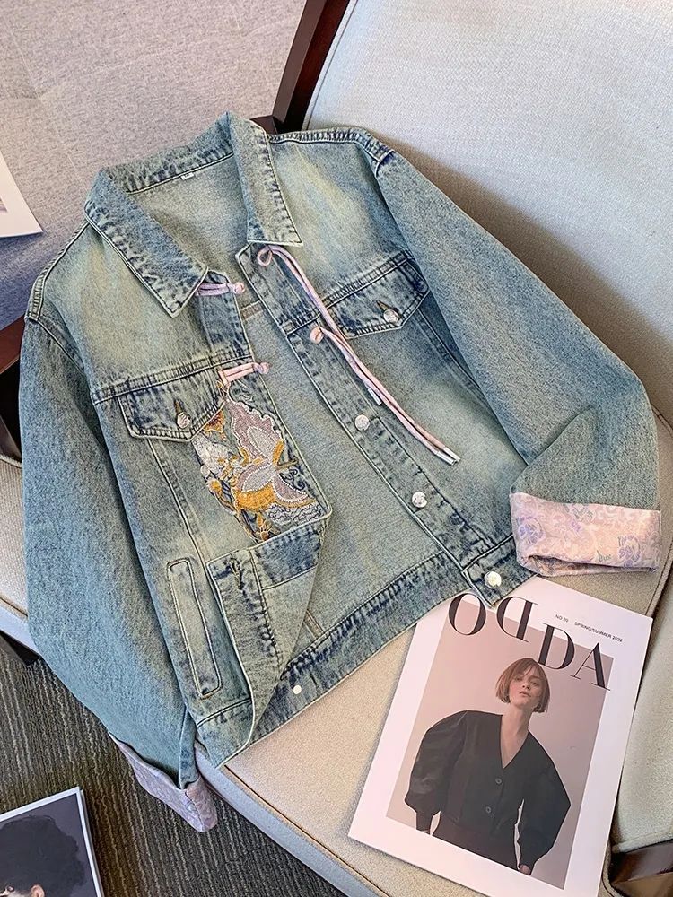 새로운 중국 스타일 국가 스타일 데님 코트 여성의 봄과 가을 2024 새로운 자수 당나라 원피스 짧은 자켓