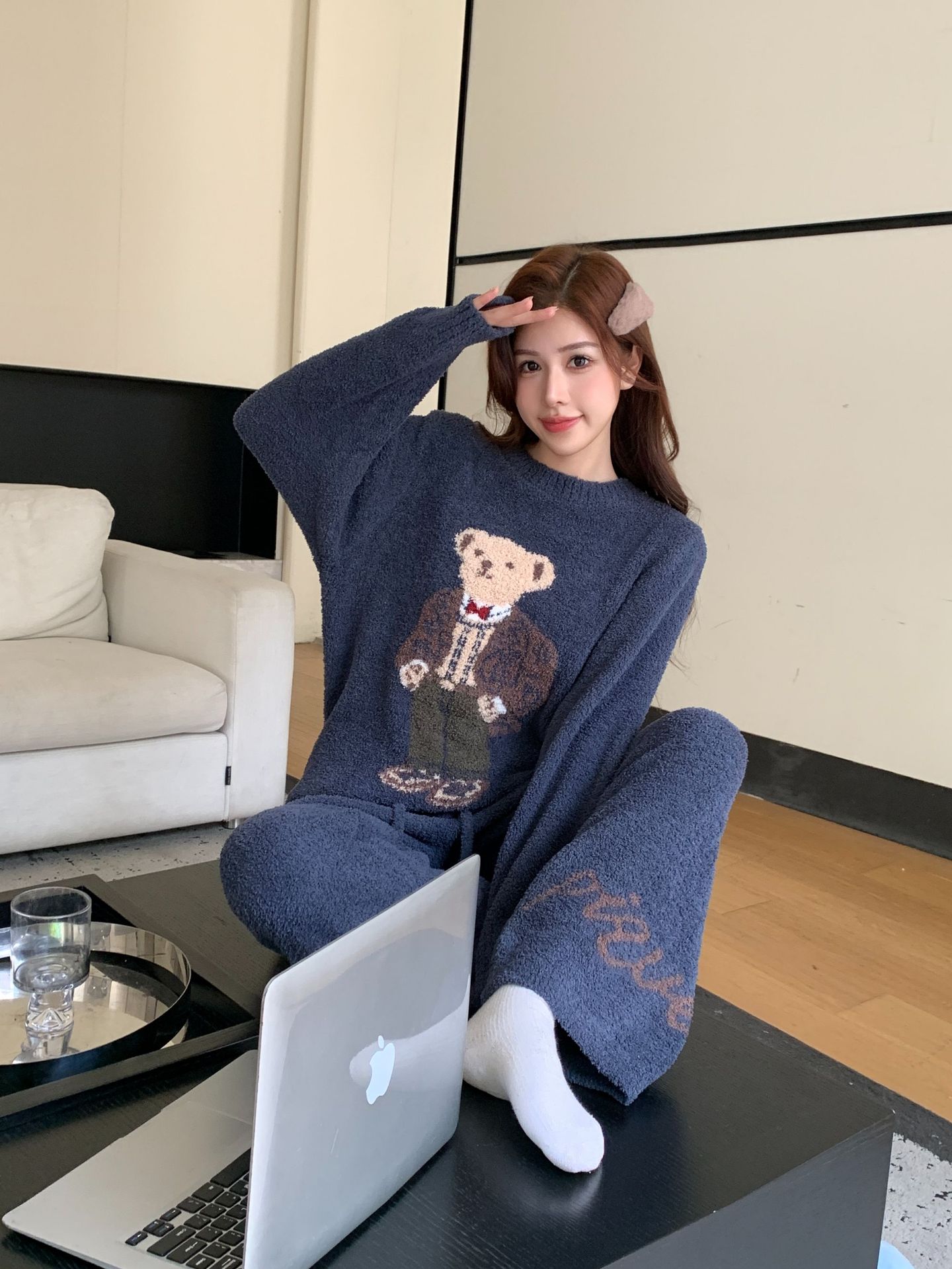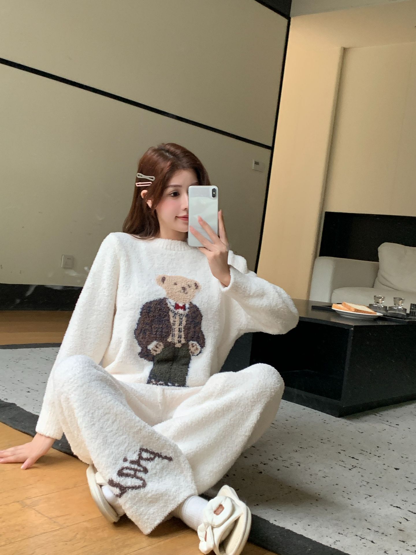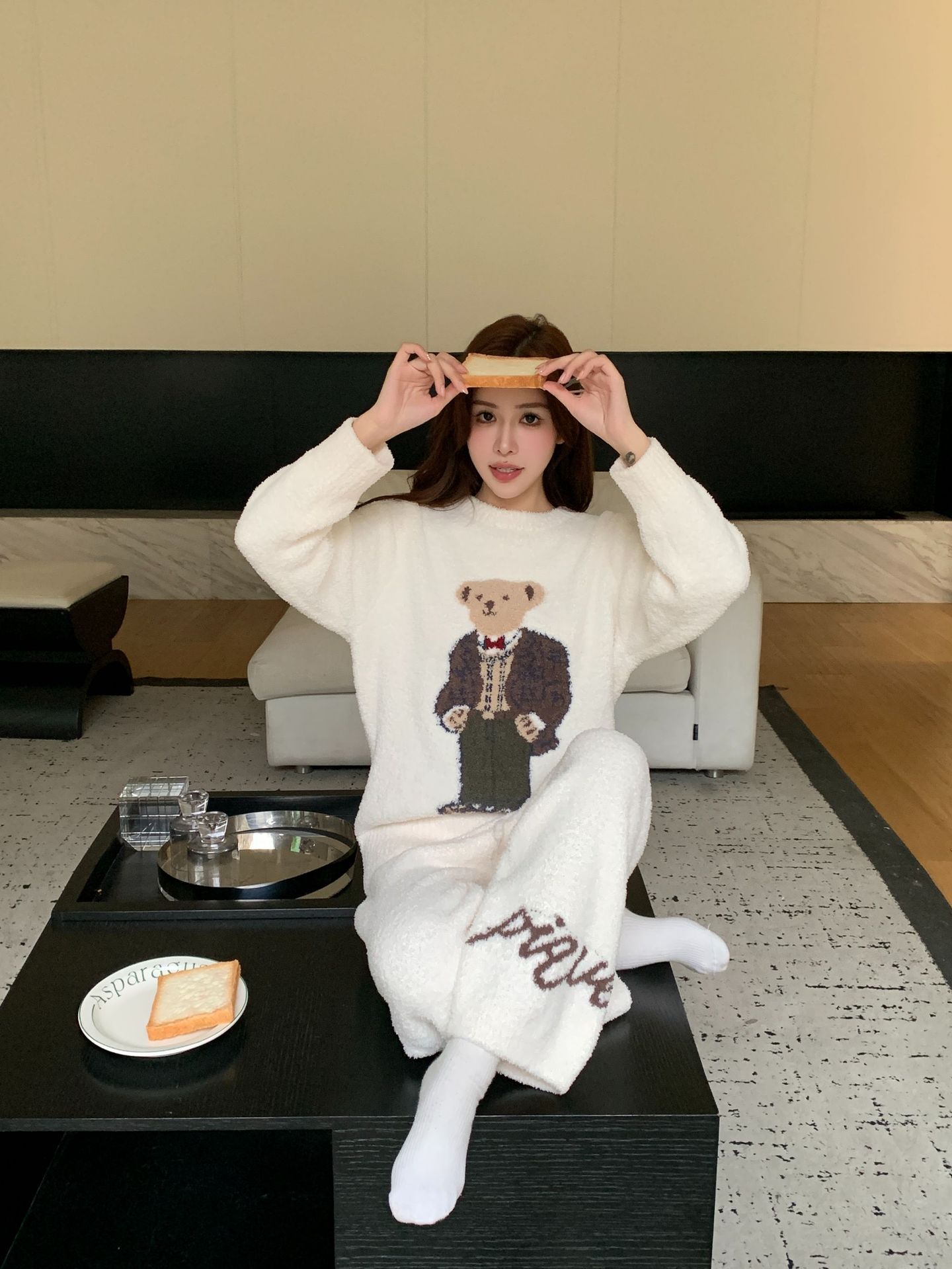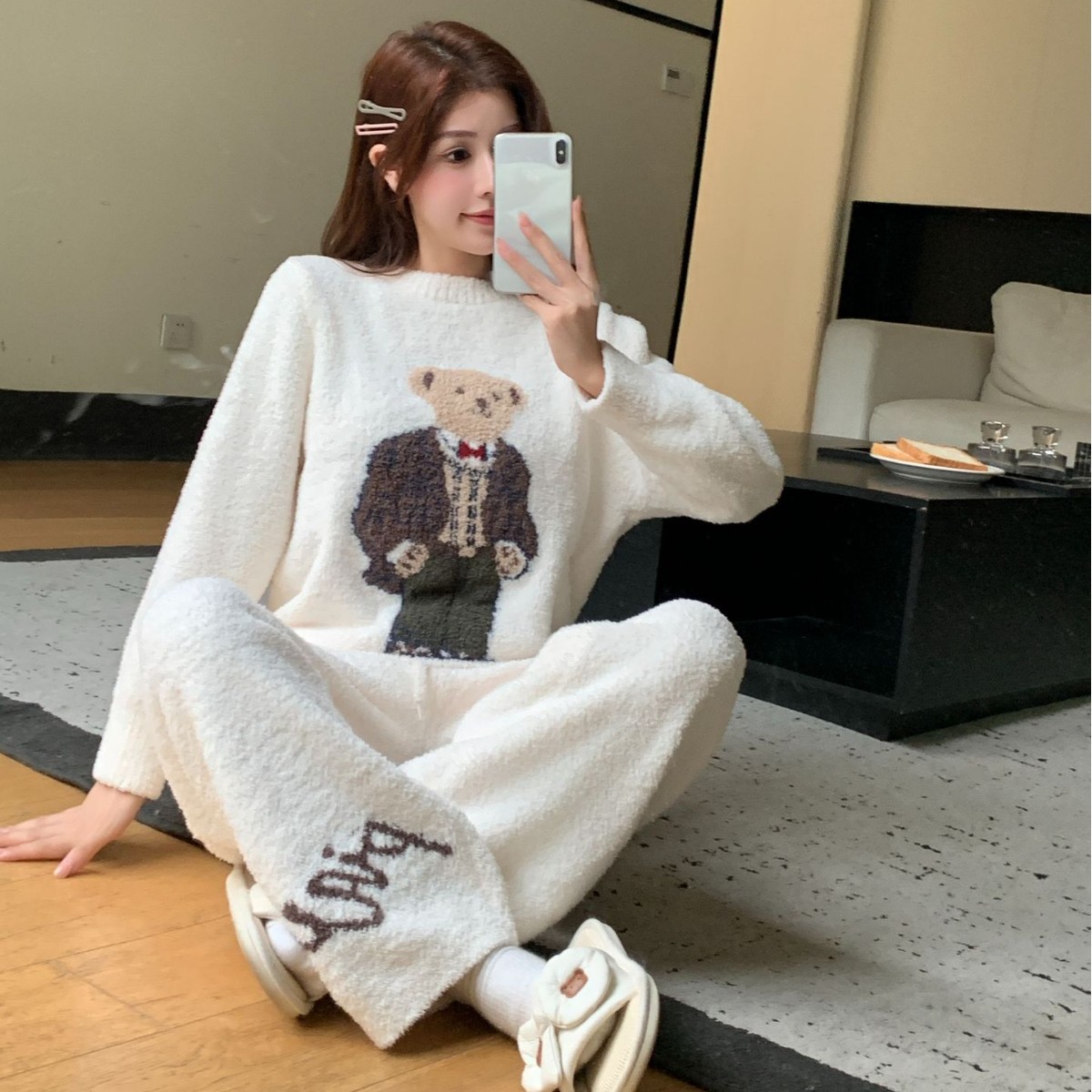 2024 가을과 겨울 부드러운 귀여운 만화 달콤한 격자 무늬 베어 여성용 두꺼운 홈 옷 잠옷