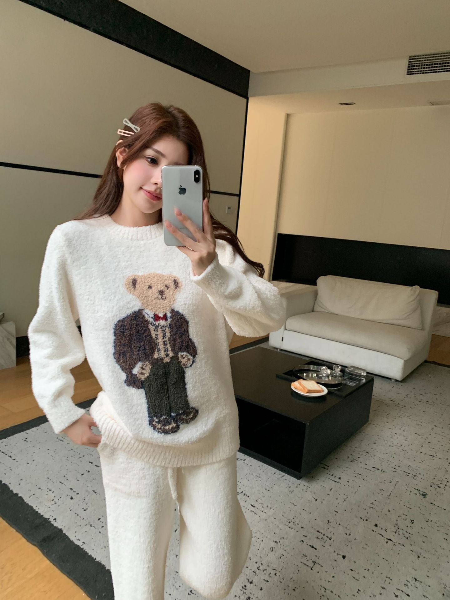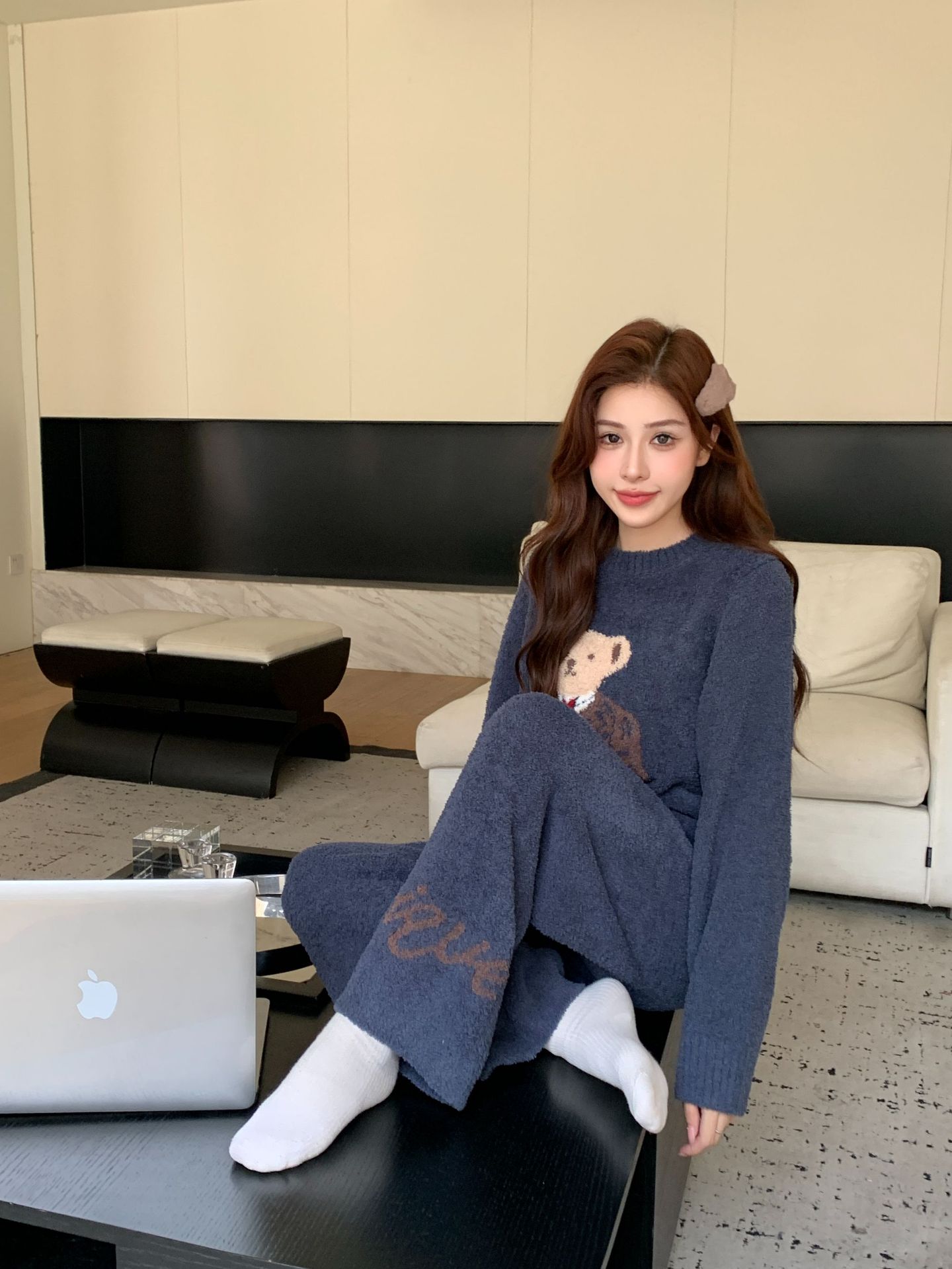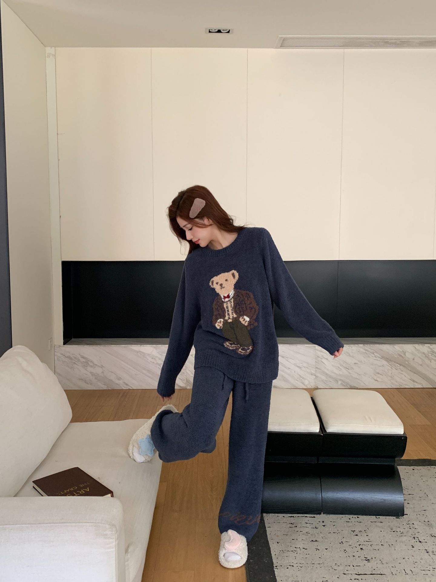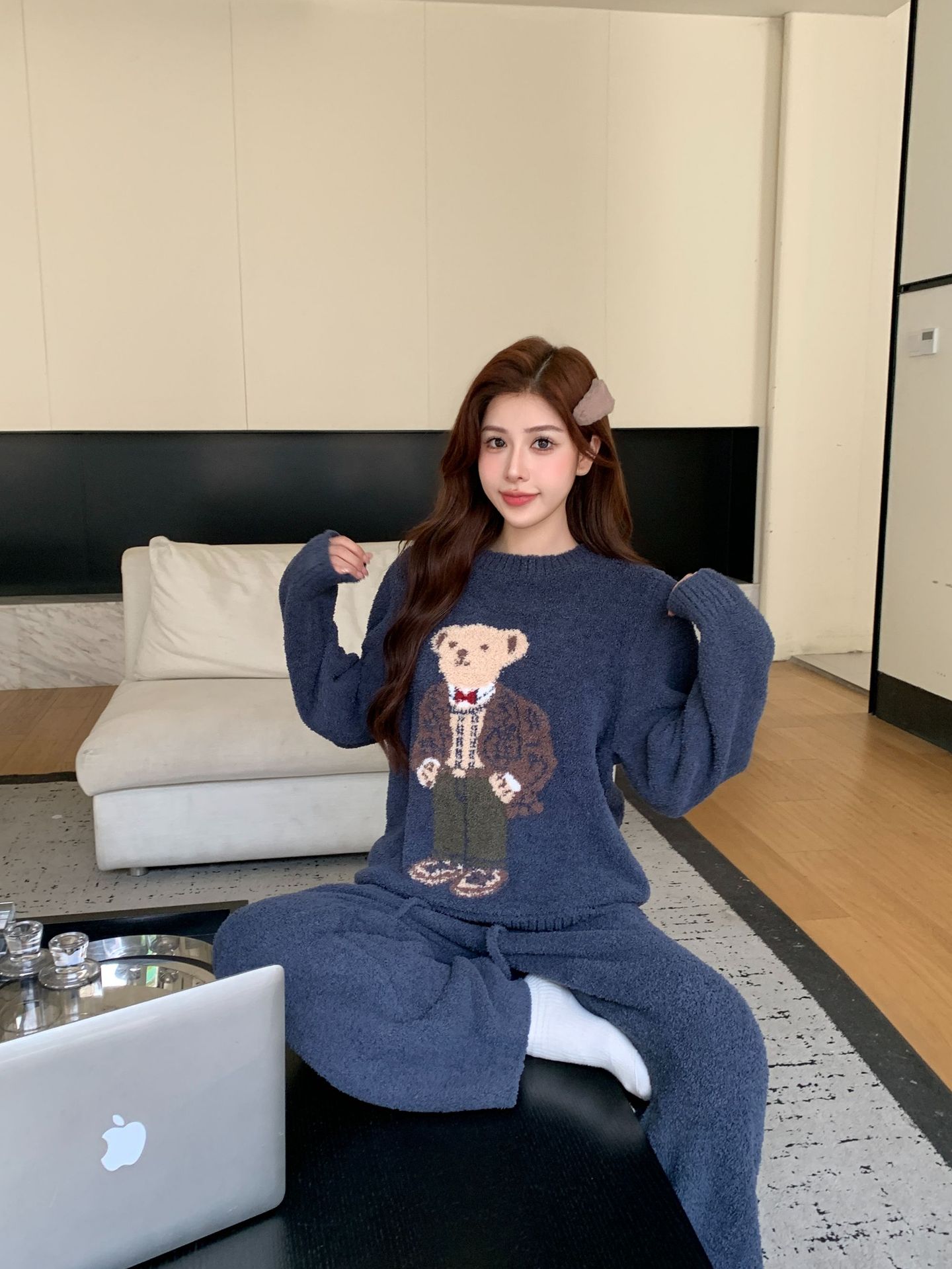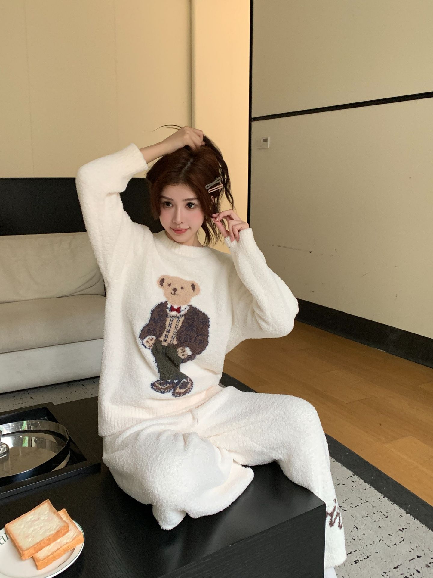 2024 가을과 겨울 부드러운 귀여운 만화 달콤한 격자 무늬 베어 여성용 두꺼운 홈 옷 잠옷