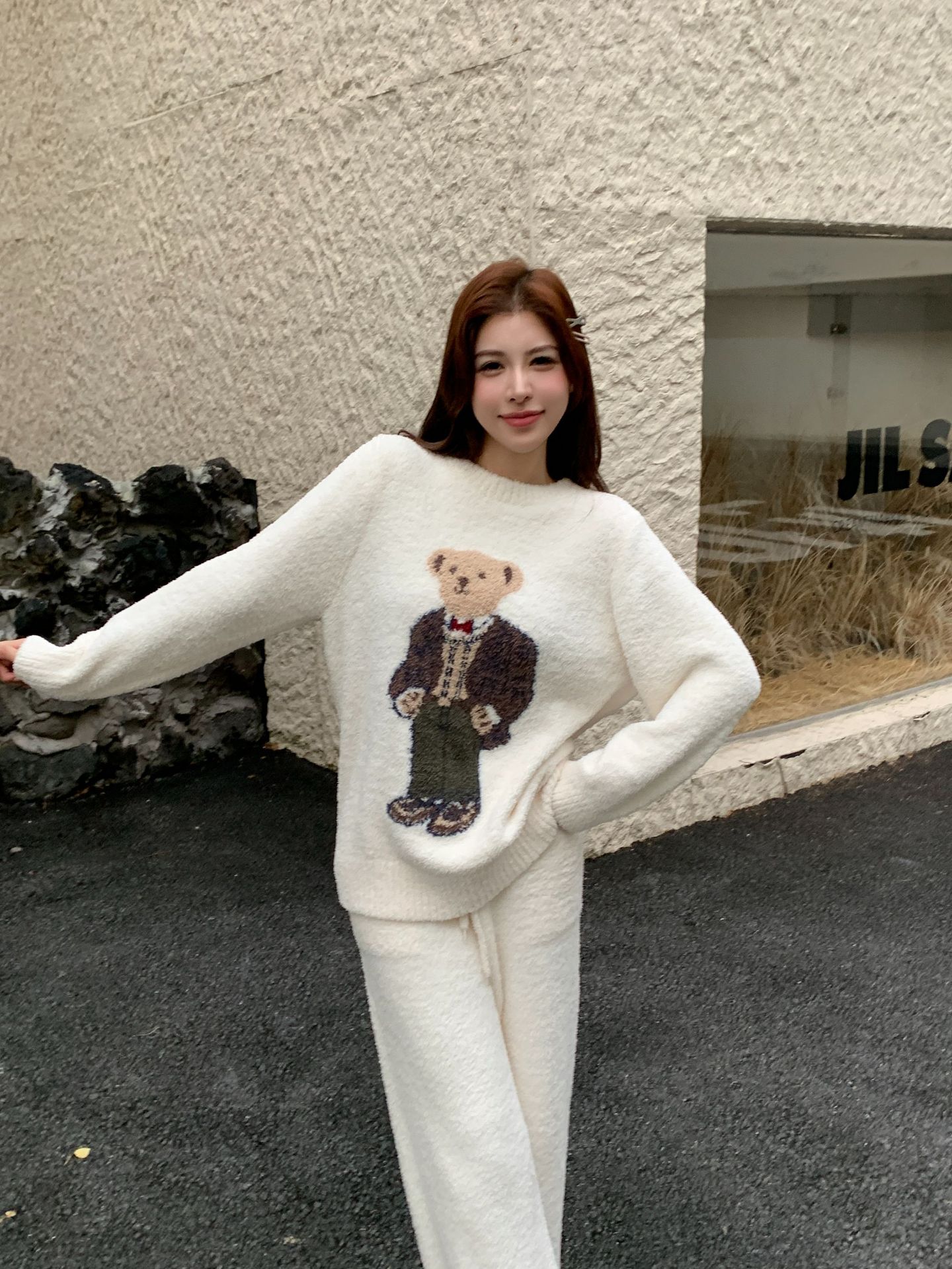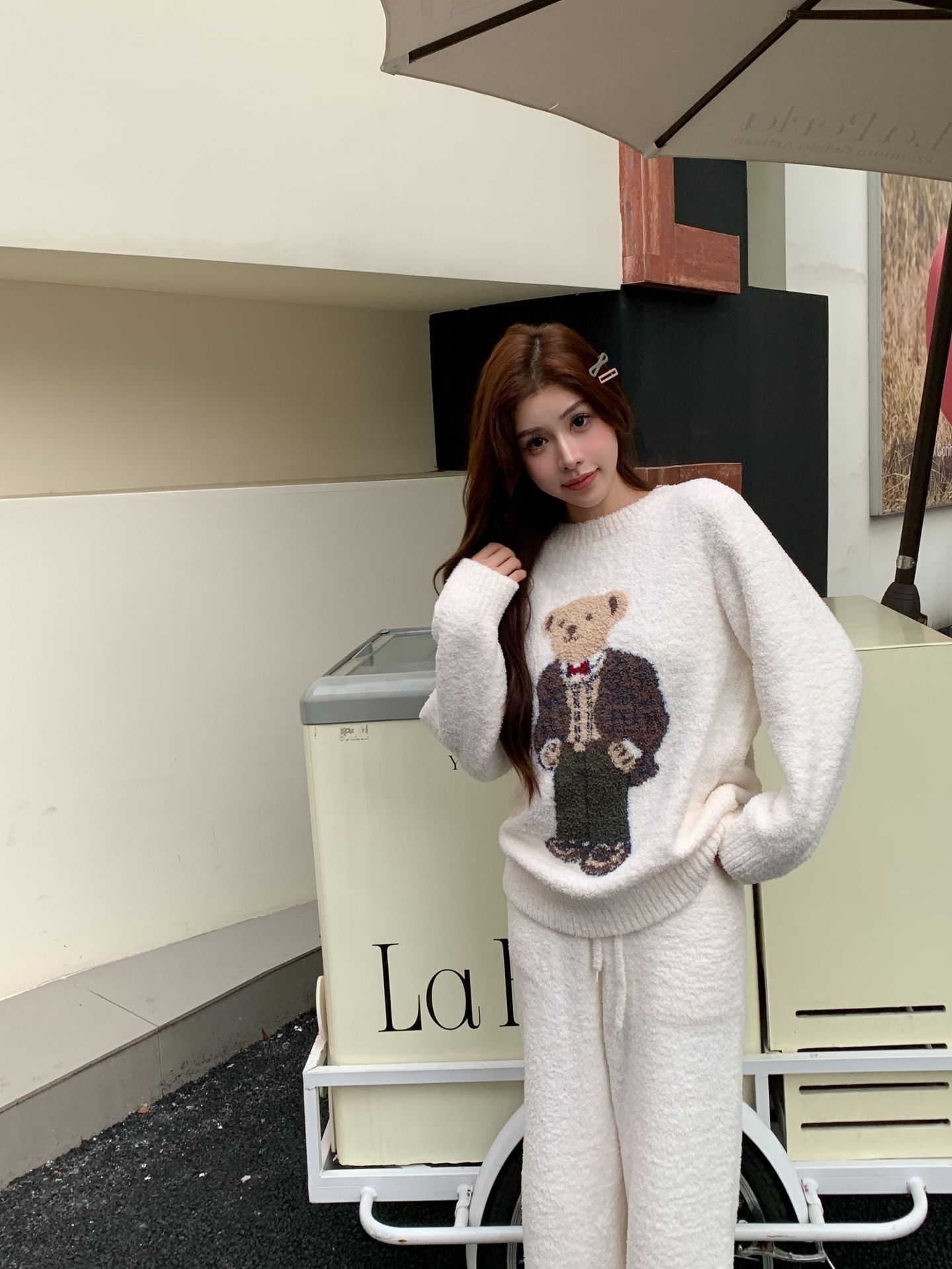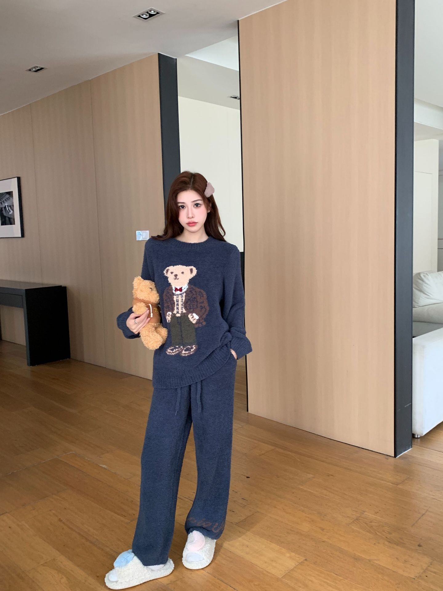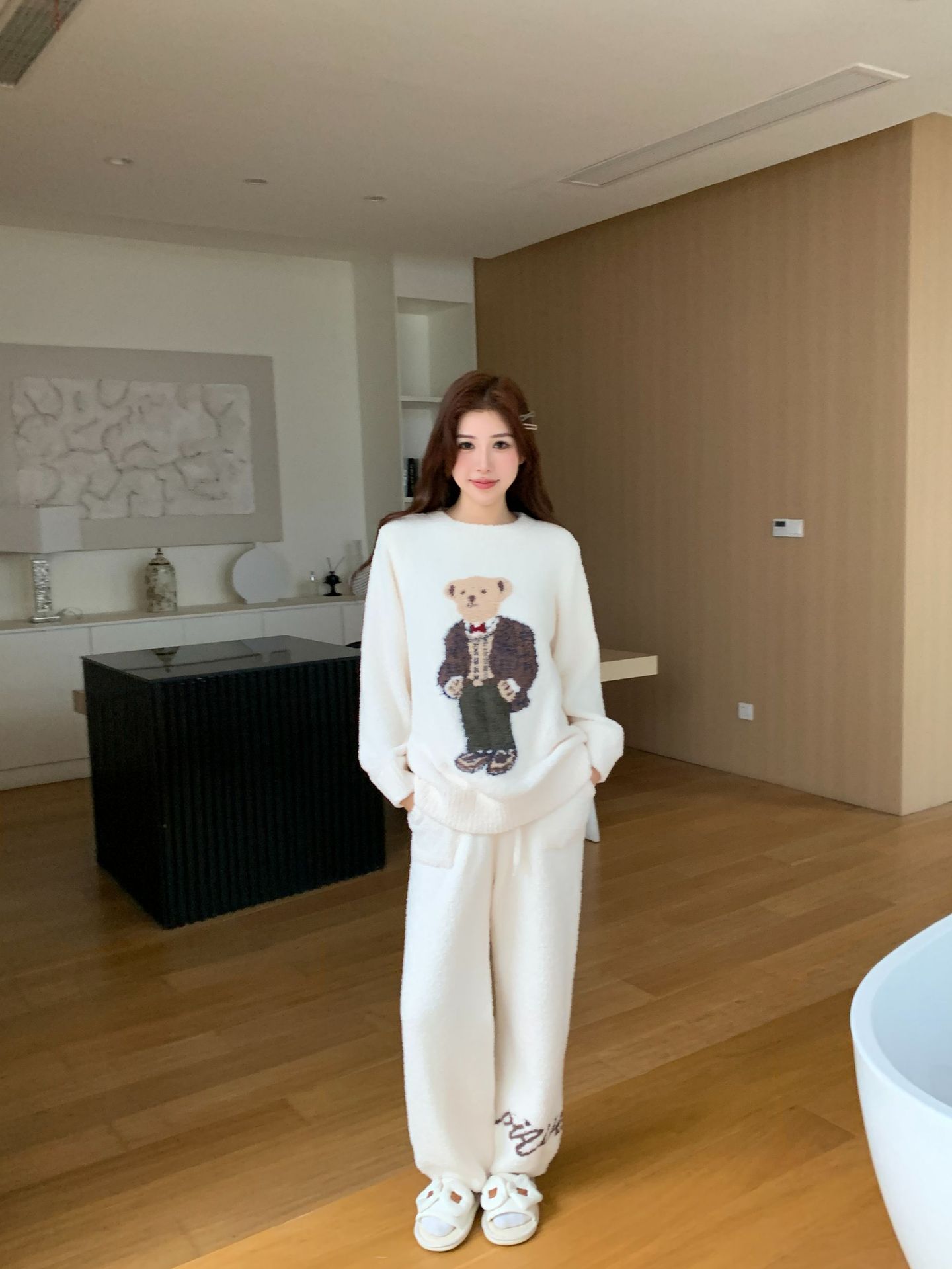 2024 가을과 겨울 부드러운 귀여운 만화 달콤한 격자 무늬 베어 여성용 두꺼운 홈 옷 잠옷