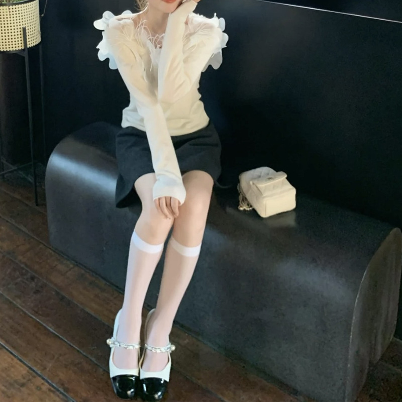 Jin Qian Xiao Xiang 스타일 순수한 욕망 깃털 최고 여성의 봄과 가을 새베이스 셔츠 긴 소매 내부 니트 스웨터 슬림 핏스토어 가기