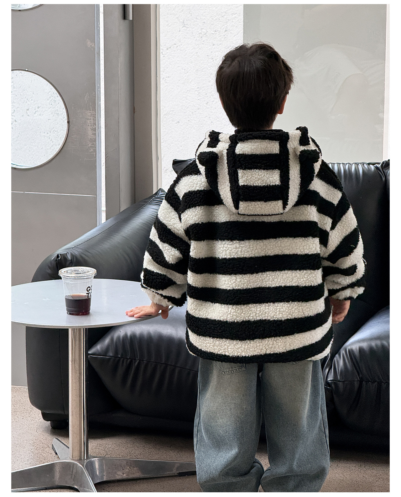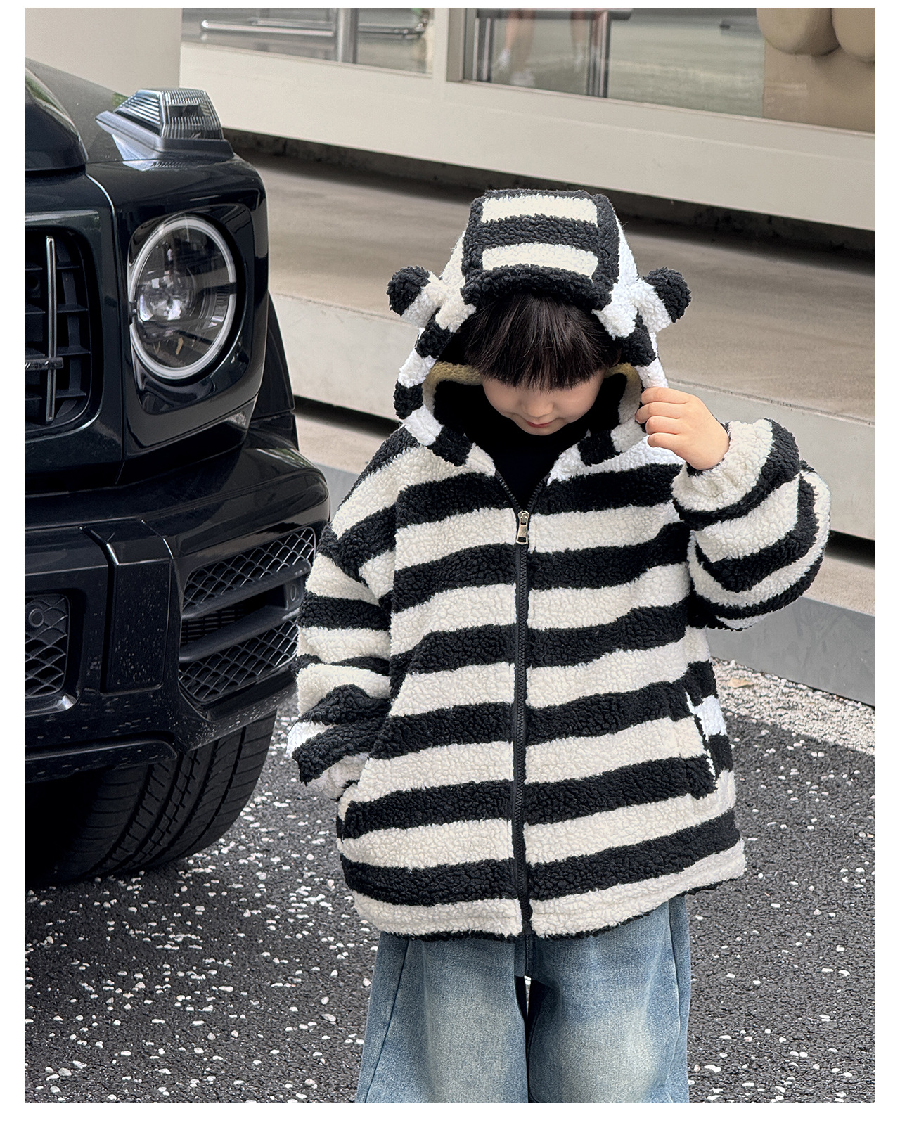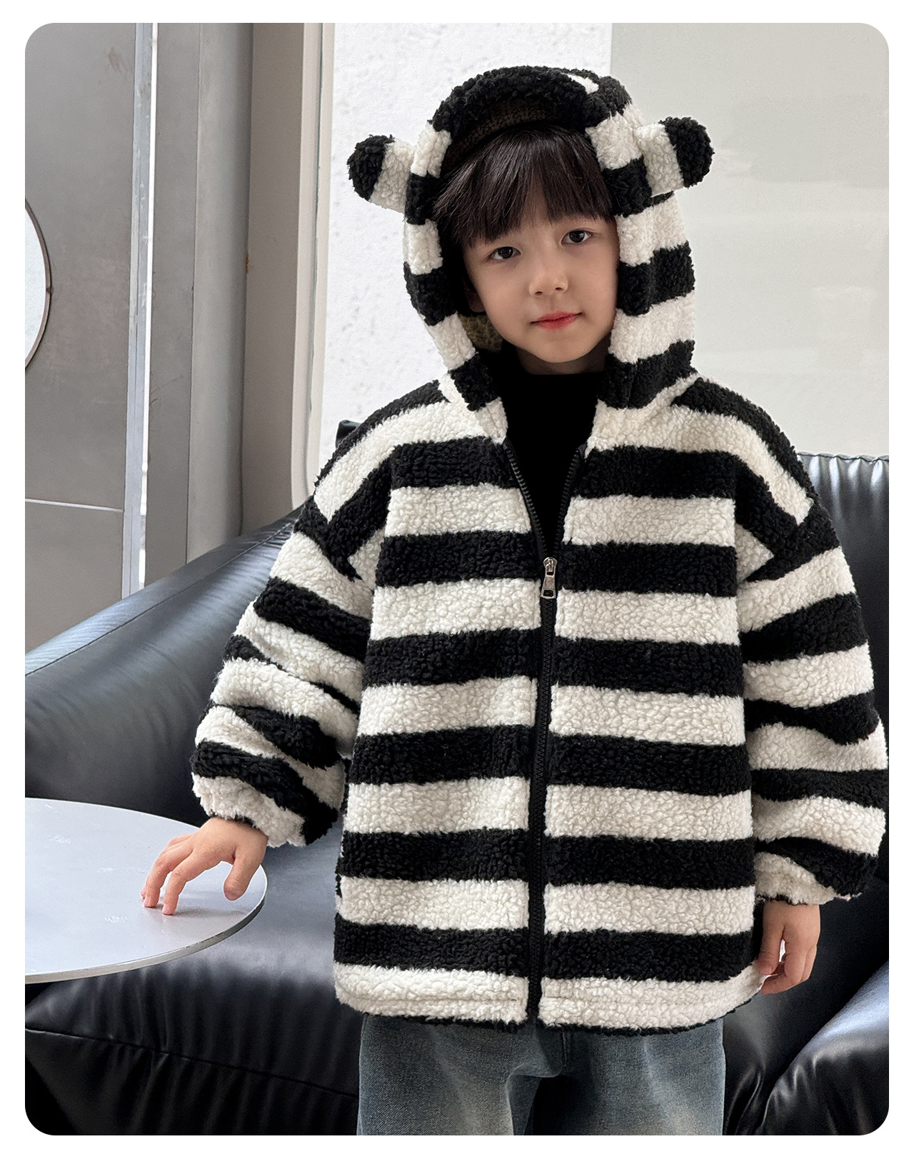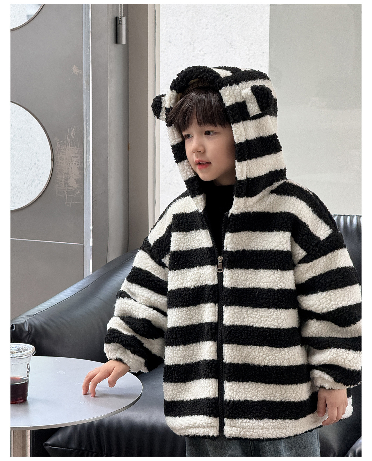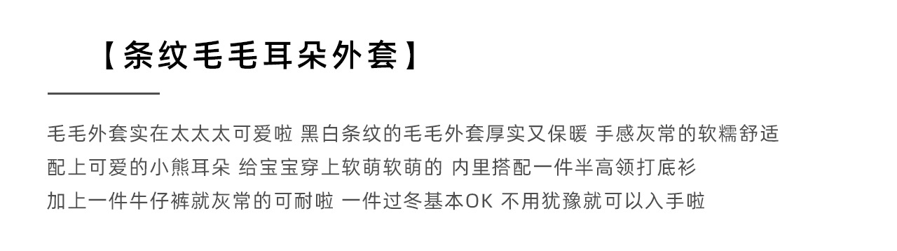 통쿠2025 아동용 겨울 신상품 호주 직조 아동복 귀여운 아기 스트라이프 플러시 귀 장식 남아용 코트스토어 가기