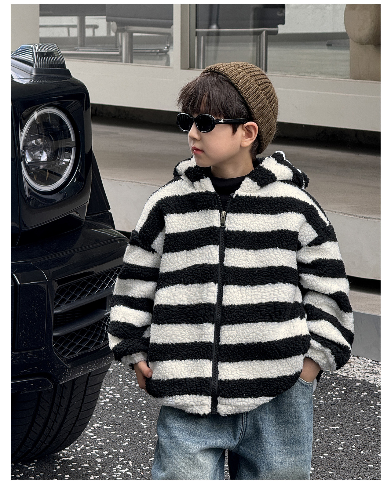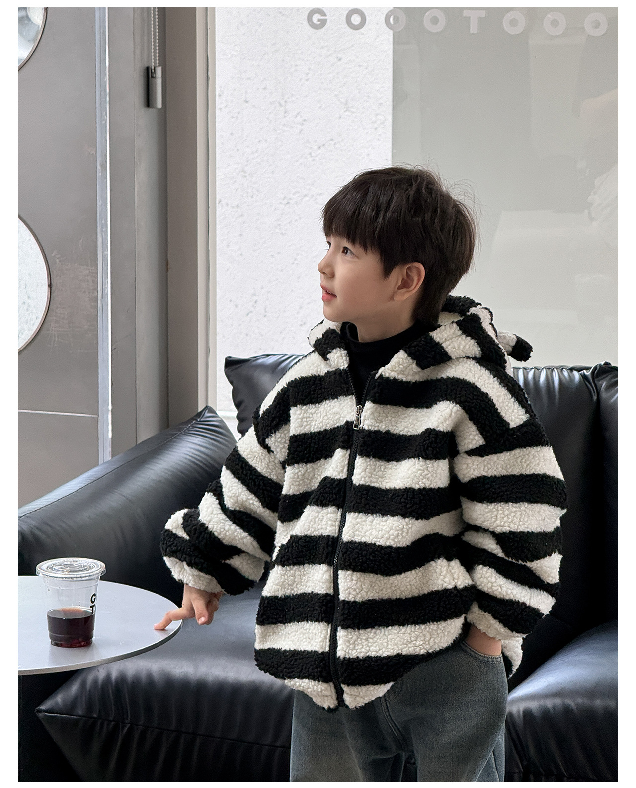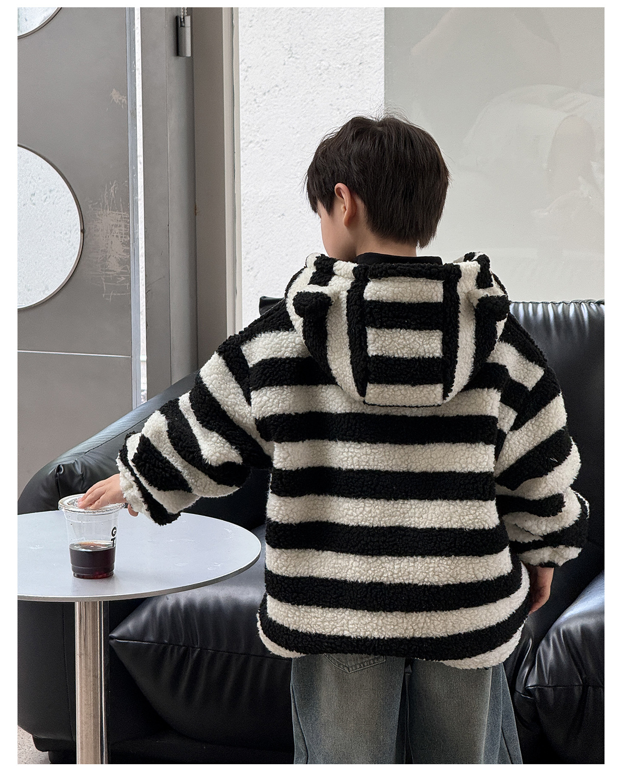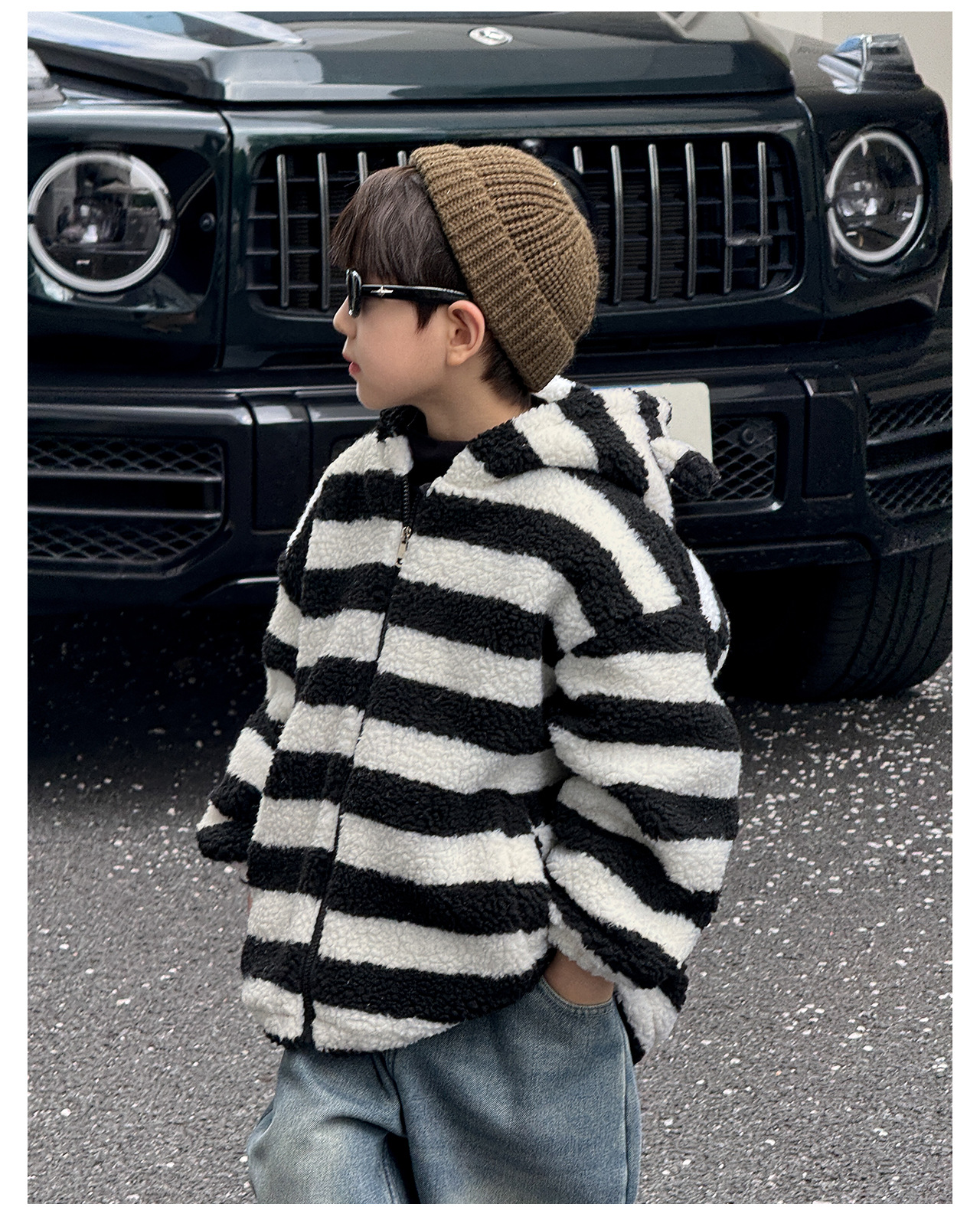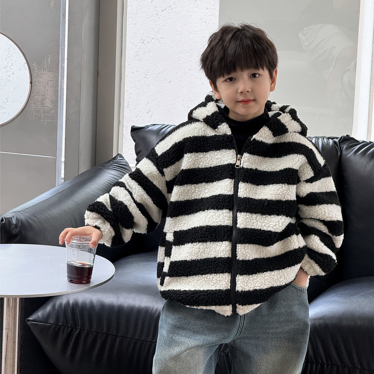 통쿠2025 아동용 겨울 신상품 호주 직조 아동복 귀여운 아기 스트라이프 플러시 귀 장식 남아용 코트스토어 가기