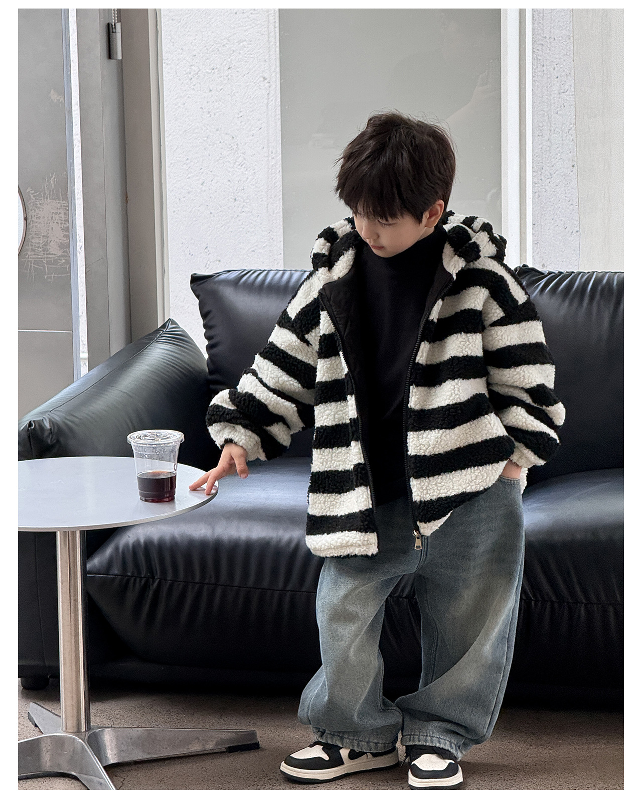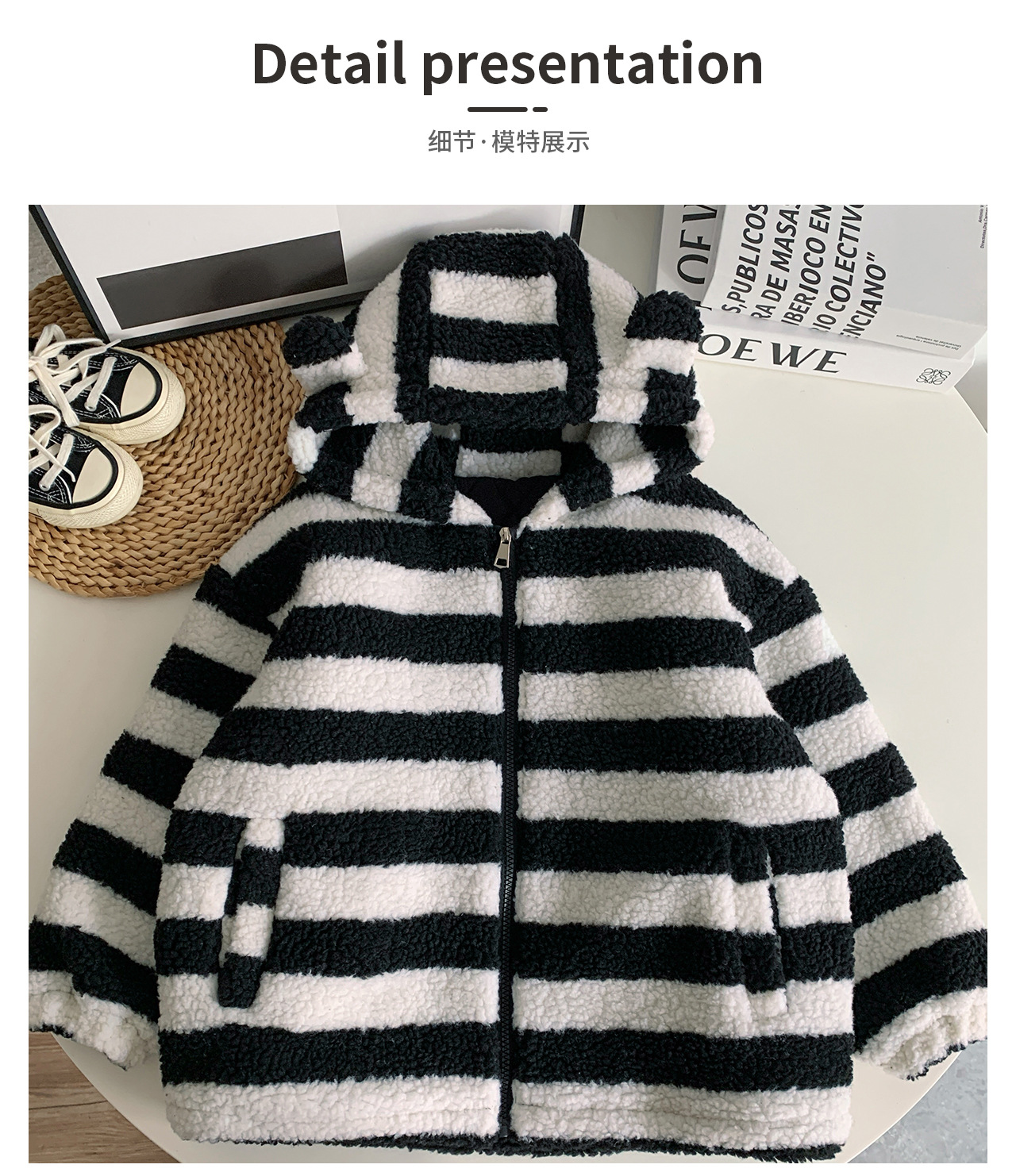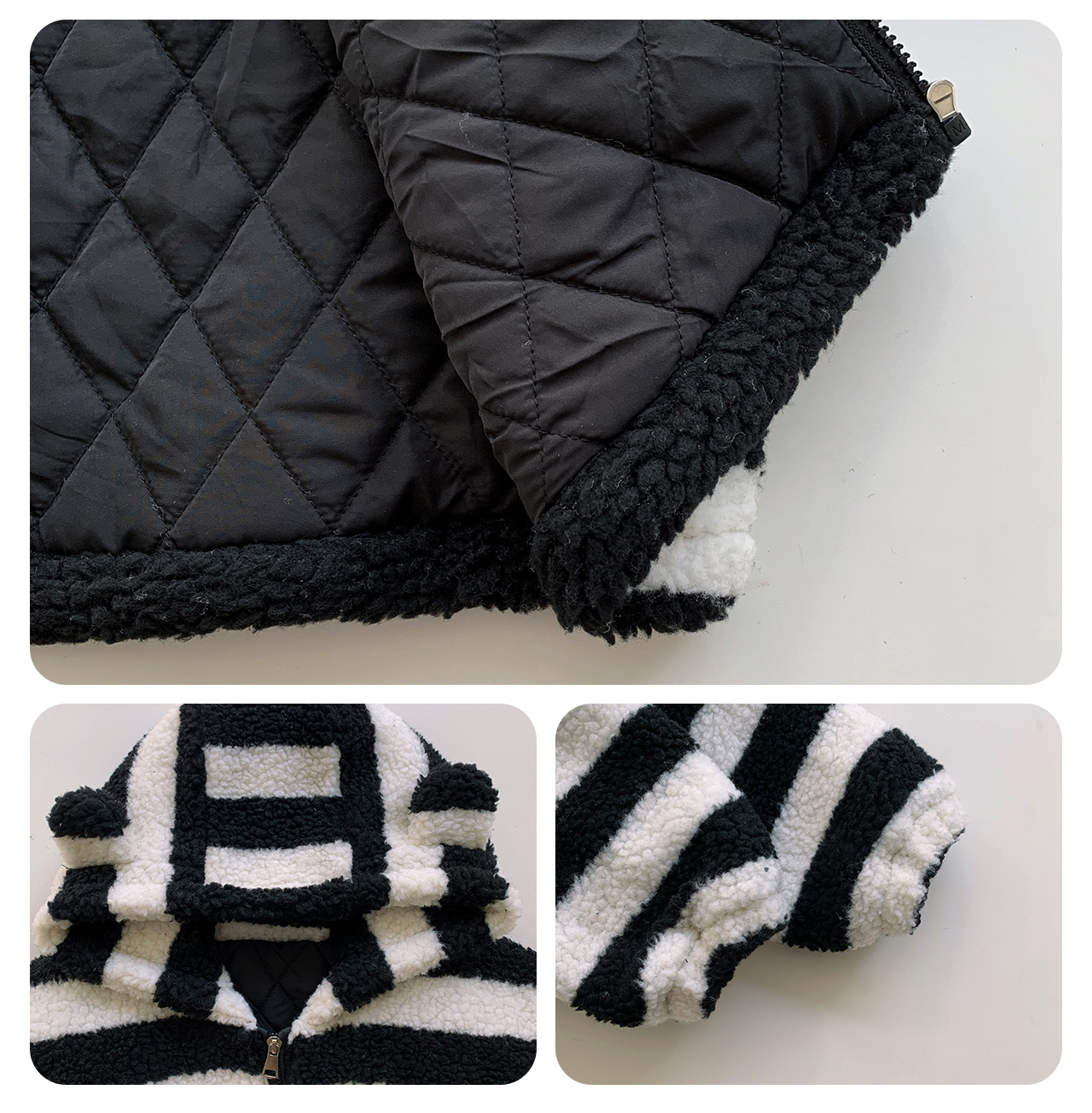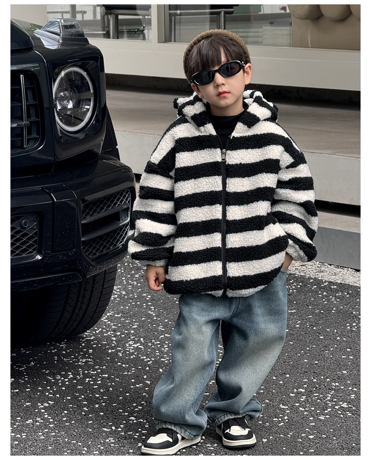 통쿠2025 아동용 겨울 신상품 호주 직조 아동복 귀여운 아기 스트라이프 플러시 귀 장식 남아용 코트스토어 가기