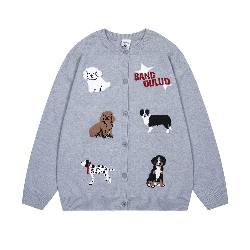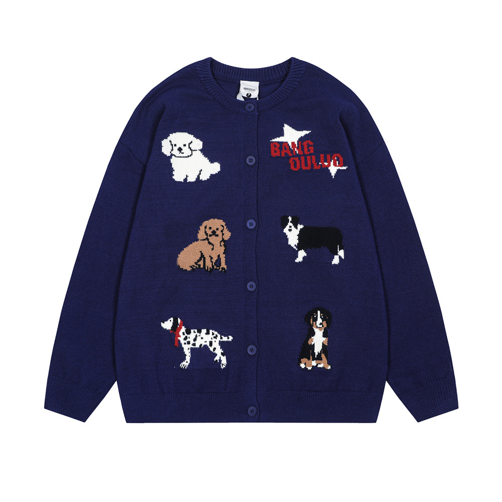 재미있는 강아지 만화 자수 니트 카디건 스웨터 남성용 루즈 라운드 넥 스웨터 코트 봄과 가을 아메리칸 스타일 스트리트 패션스토어 가기