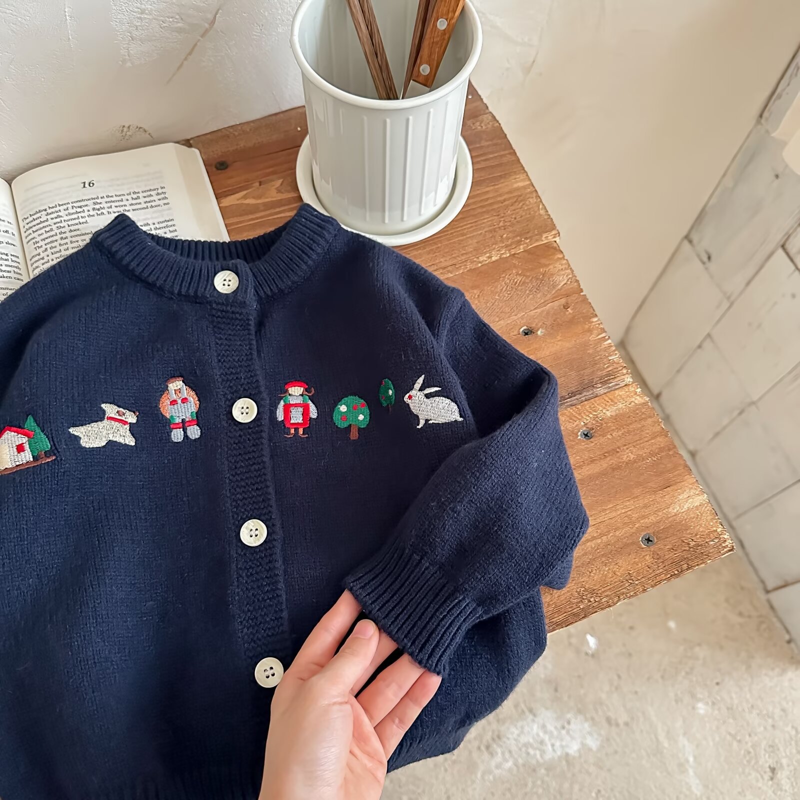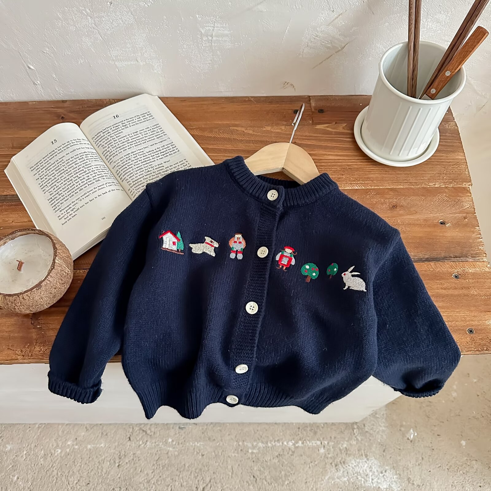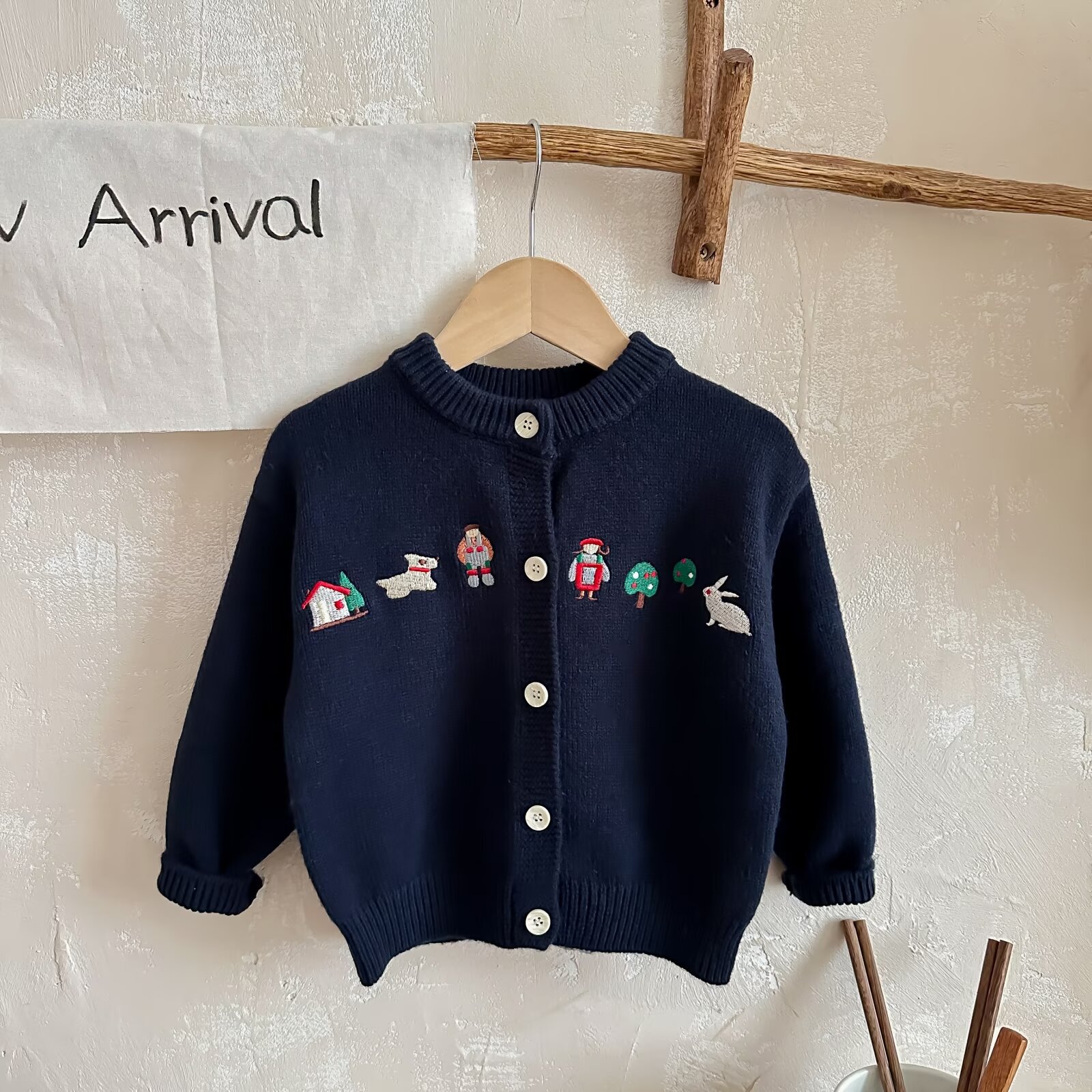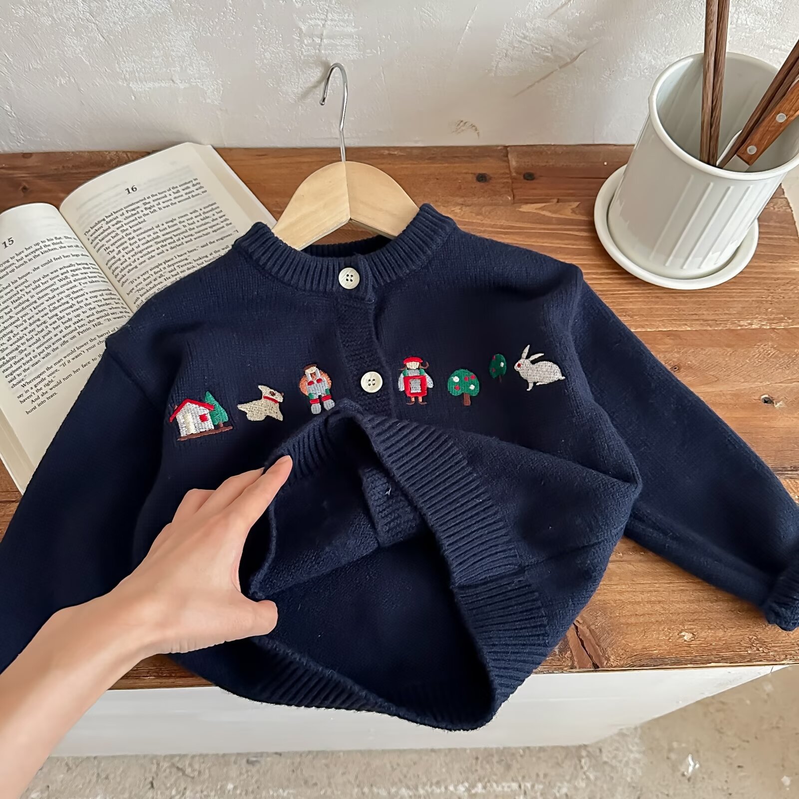 가을 2024 새로운 어린이 만화 자수 스웨터 아기 귀여운 카디건 코트 중립 스타일 둥근 목 단일 가슴 버클
