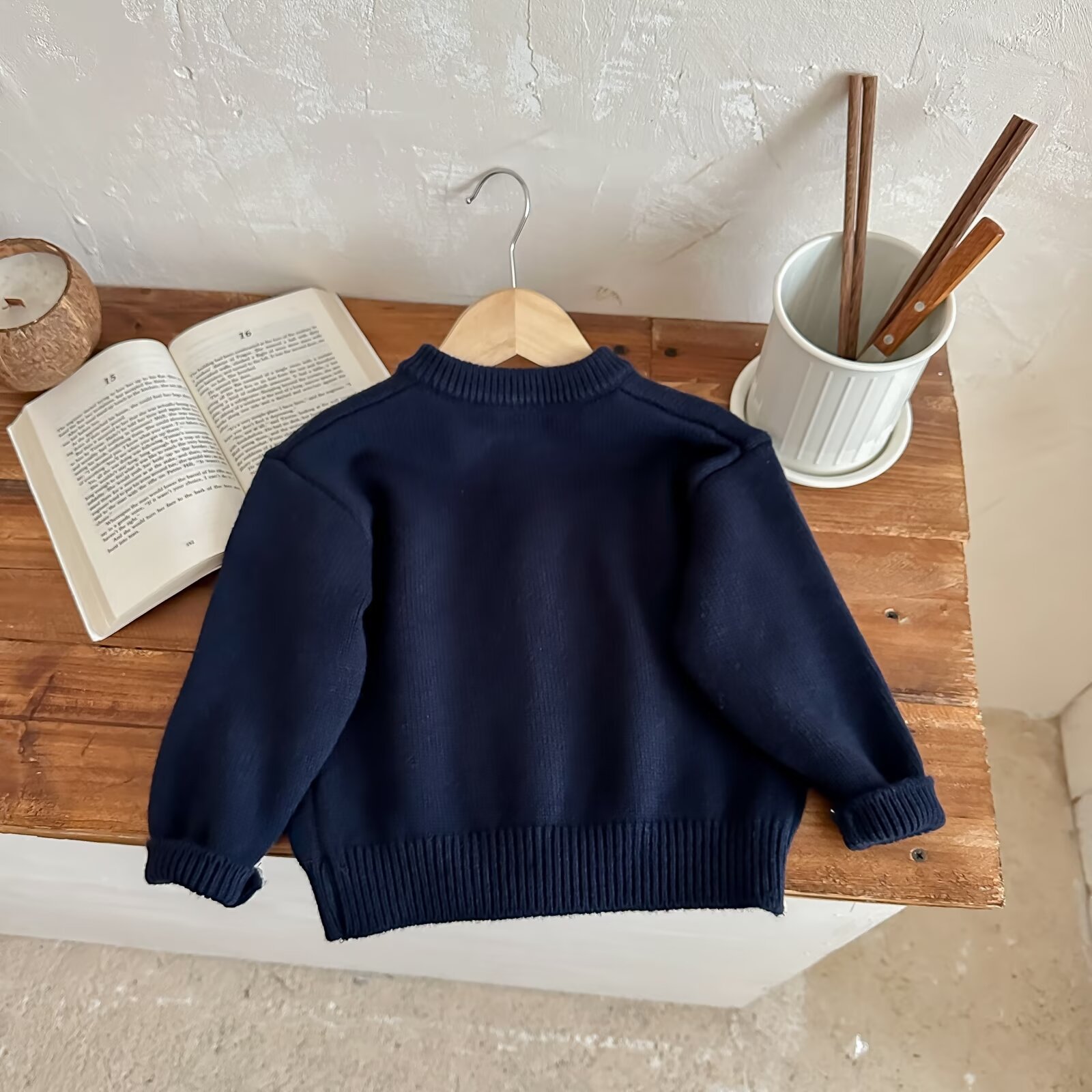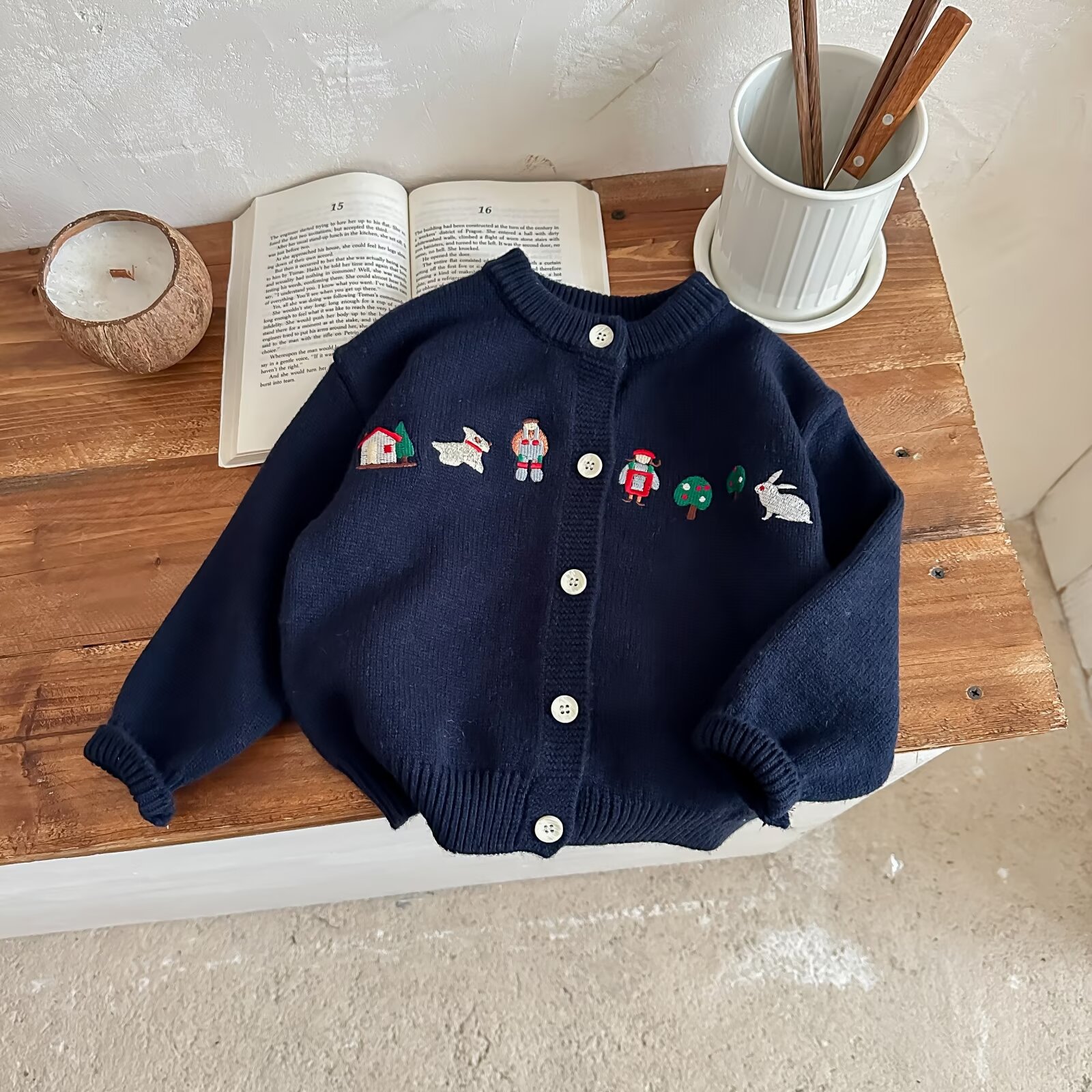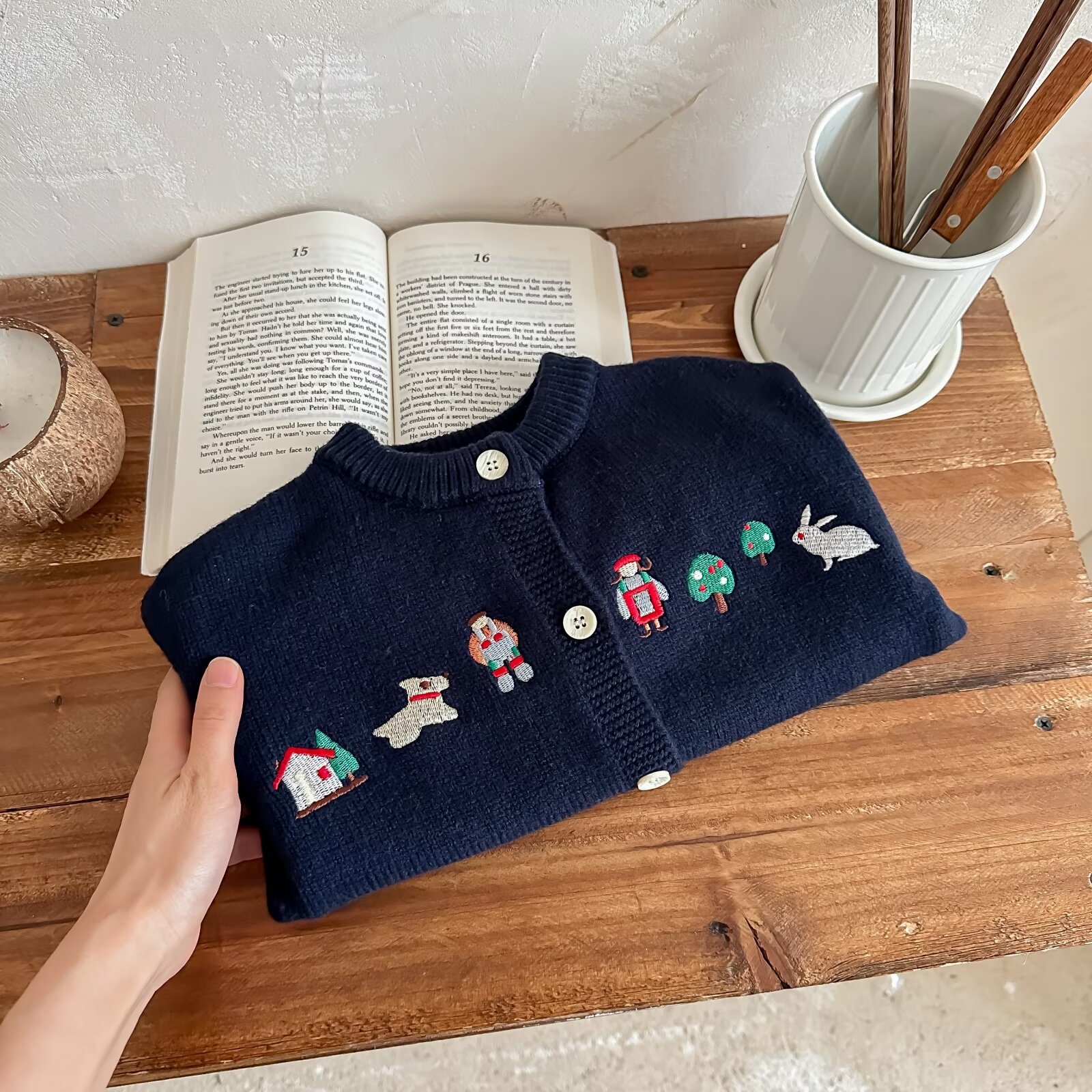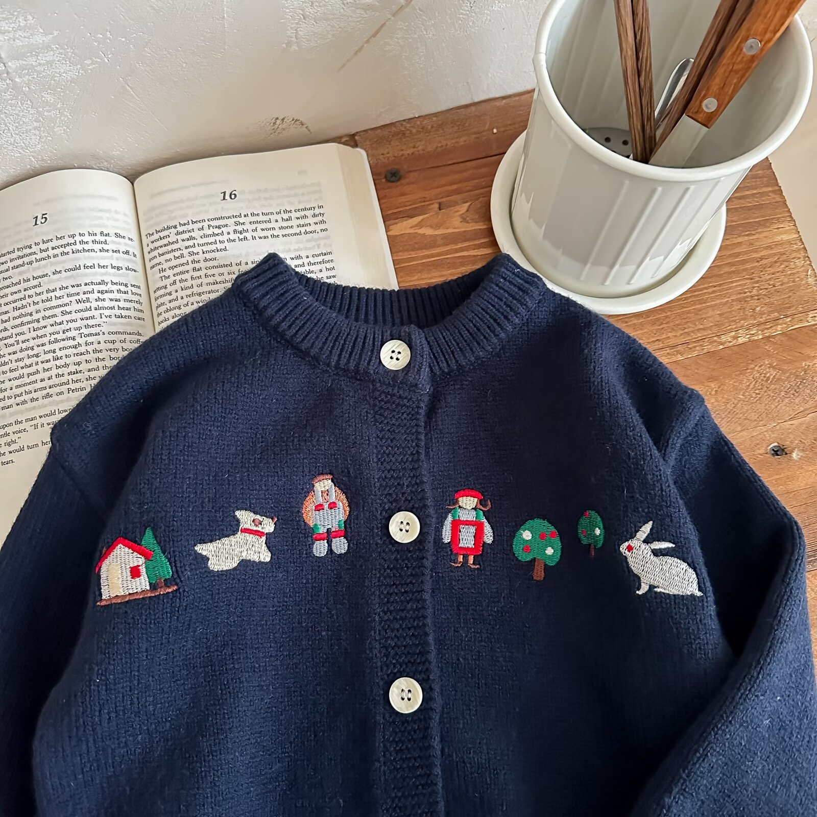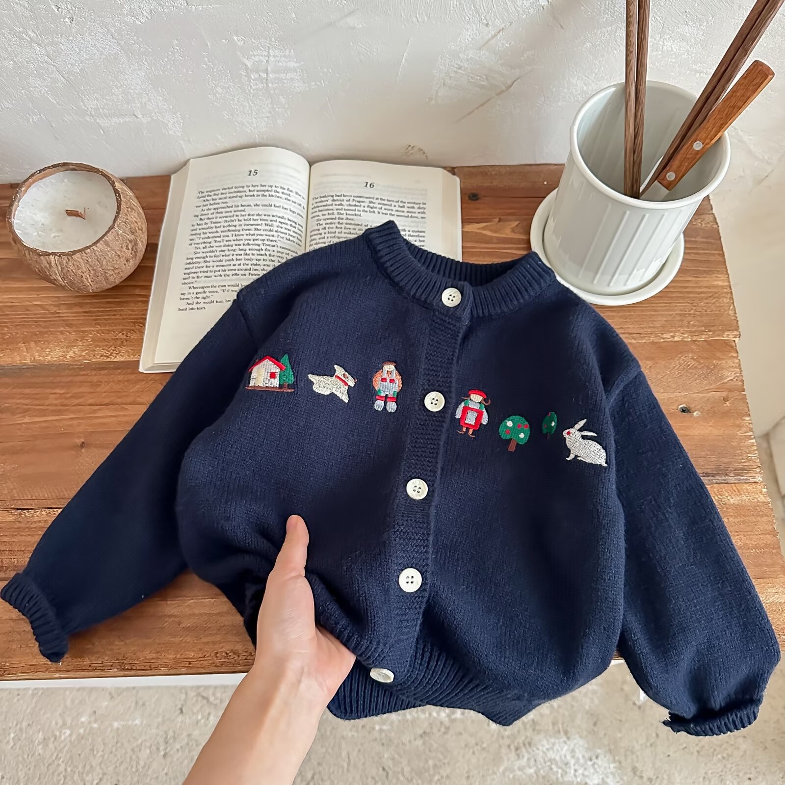 가을 2024 새로운 어린이 만화 자수 스웨터 아기 귀여운 카디건 코트 중립 스타일 둥근 목 단일 가슴 버클