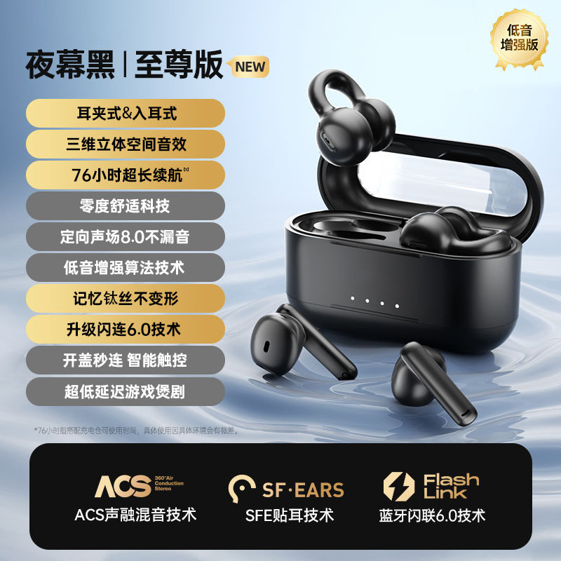 • [이어클립 및 귀 듀얼 체험] 나이트 블랙_익스트림 에디션 [76H 초장기 배터리 수명_입체 공간 음향 효과]
