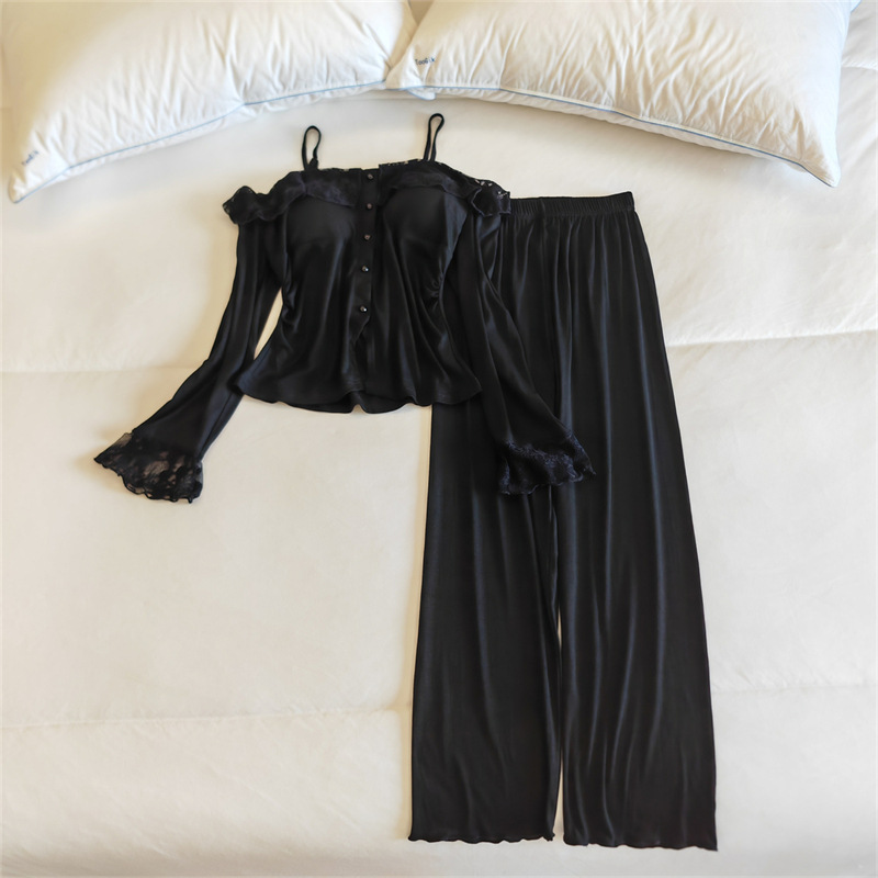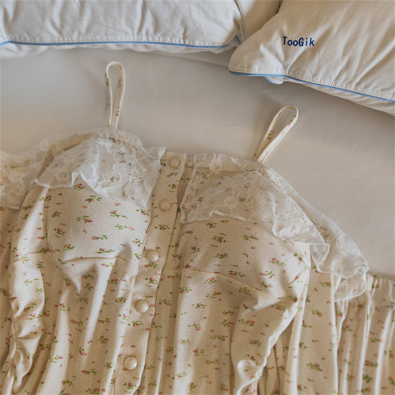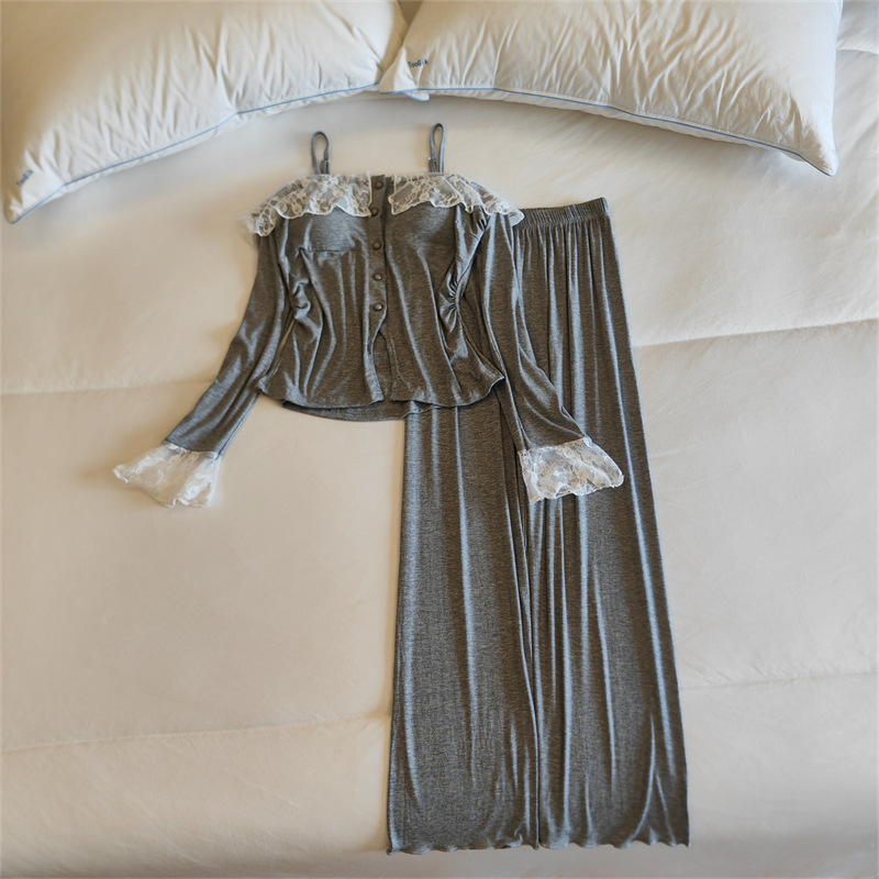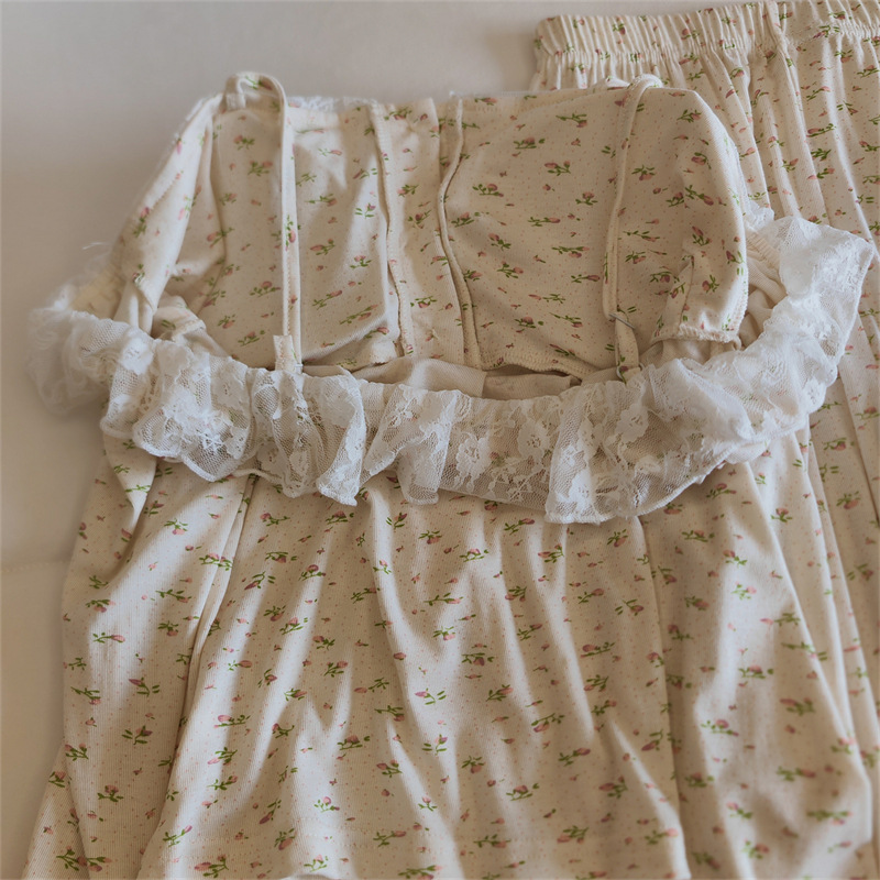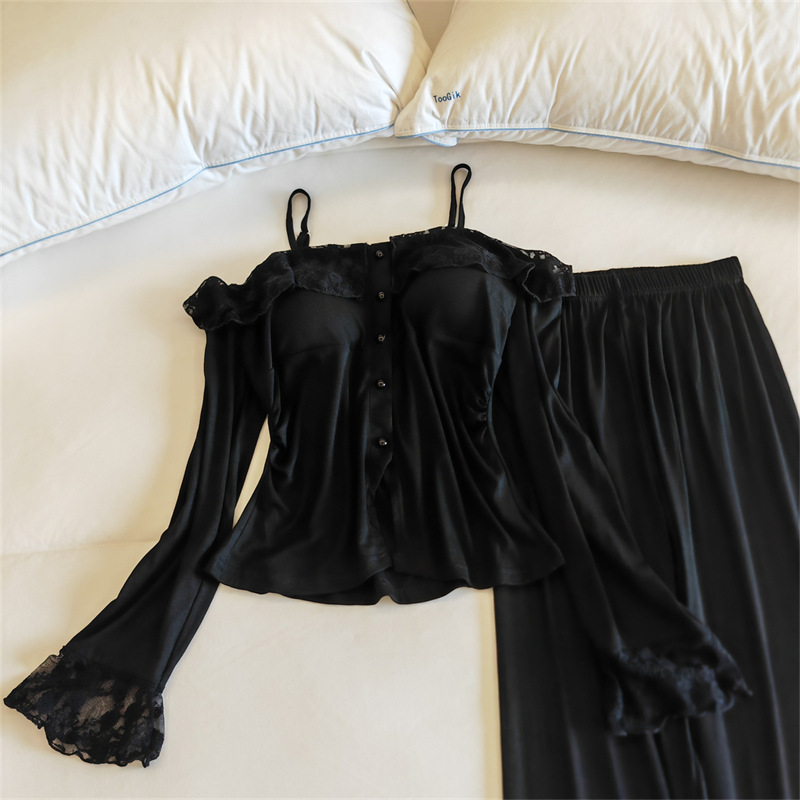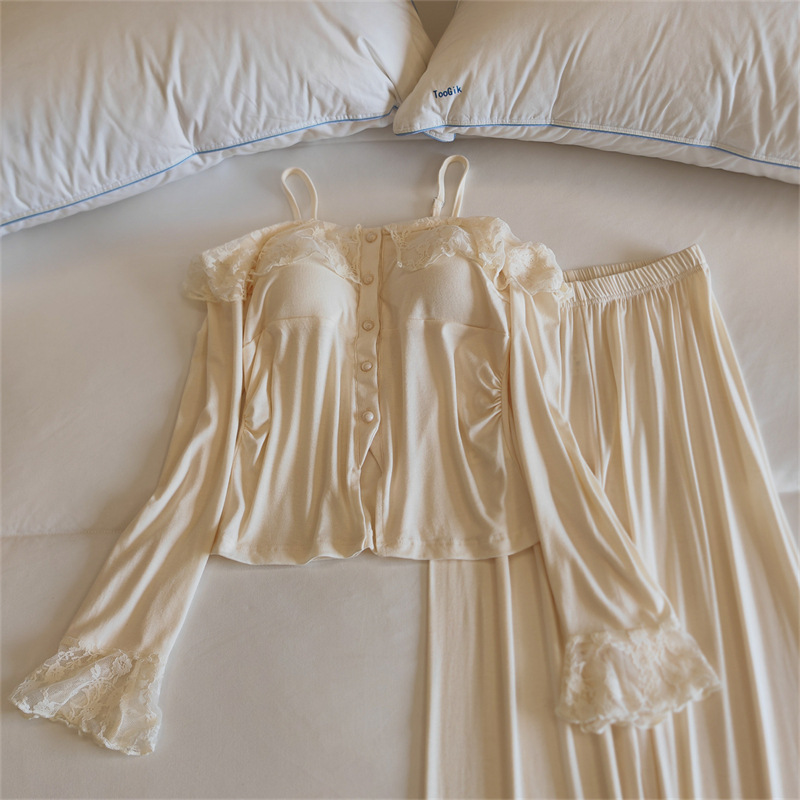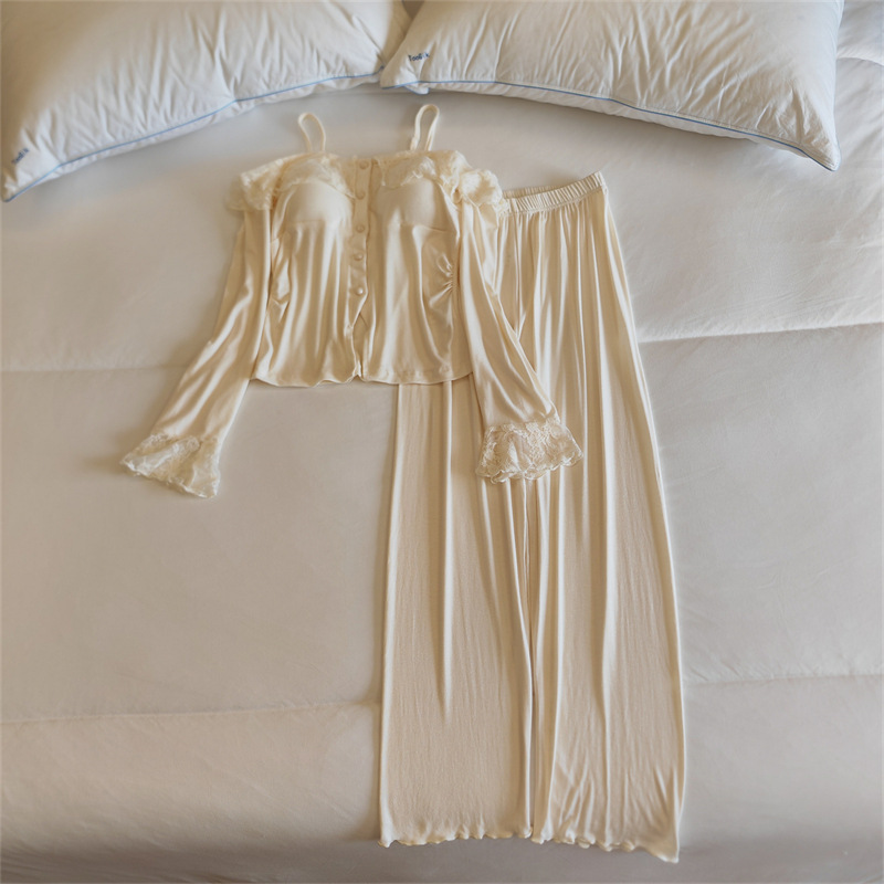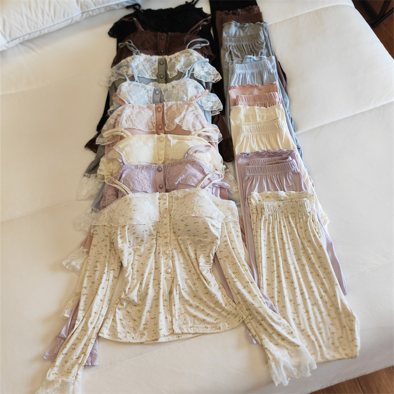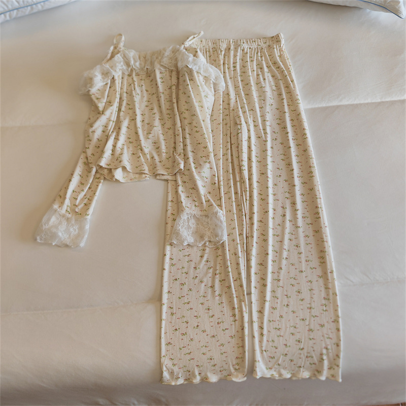 가슴 패드와 여성 잠옷 봄 가을과 겨울 어깨 인터넷 레드 스타일 작은 꽃 긴 소매 모달 홈 옷 투피스 세트