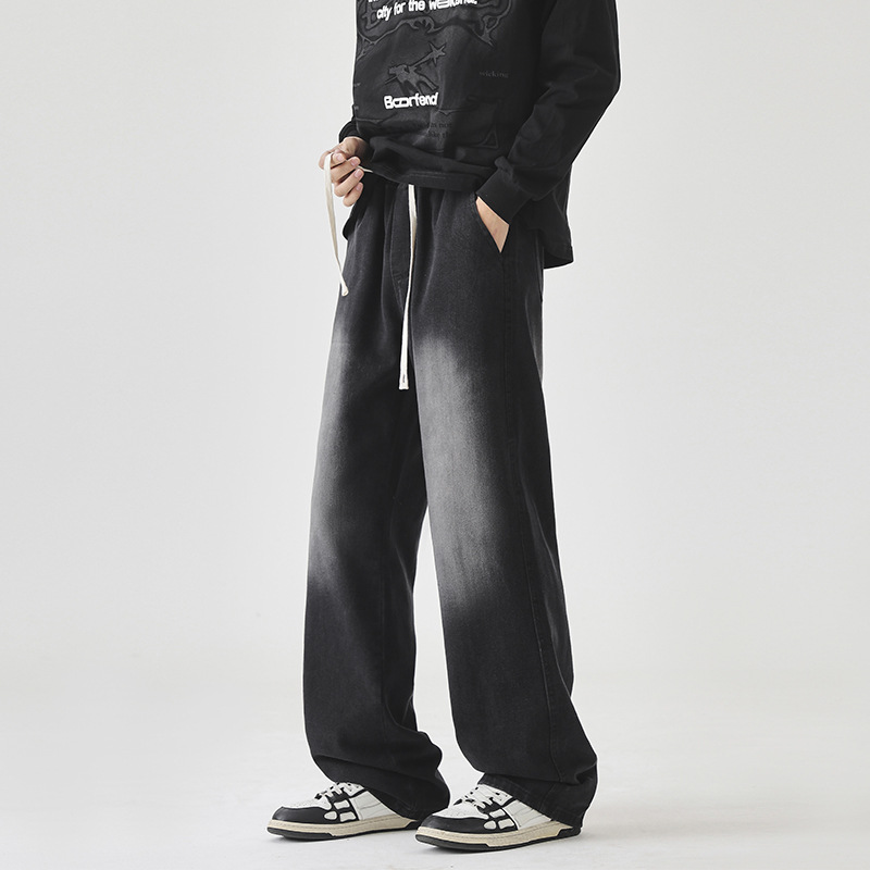 아메리칸 스타일 툴링 청바지 남성용 검은 가을과 겨울 하이 스트리트 와이드 레그 바지 소년 기모 캐주얼 스트레이트 롱 바지스토어 가기