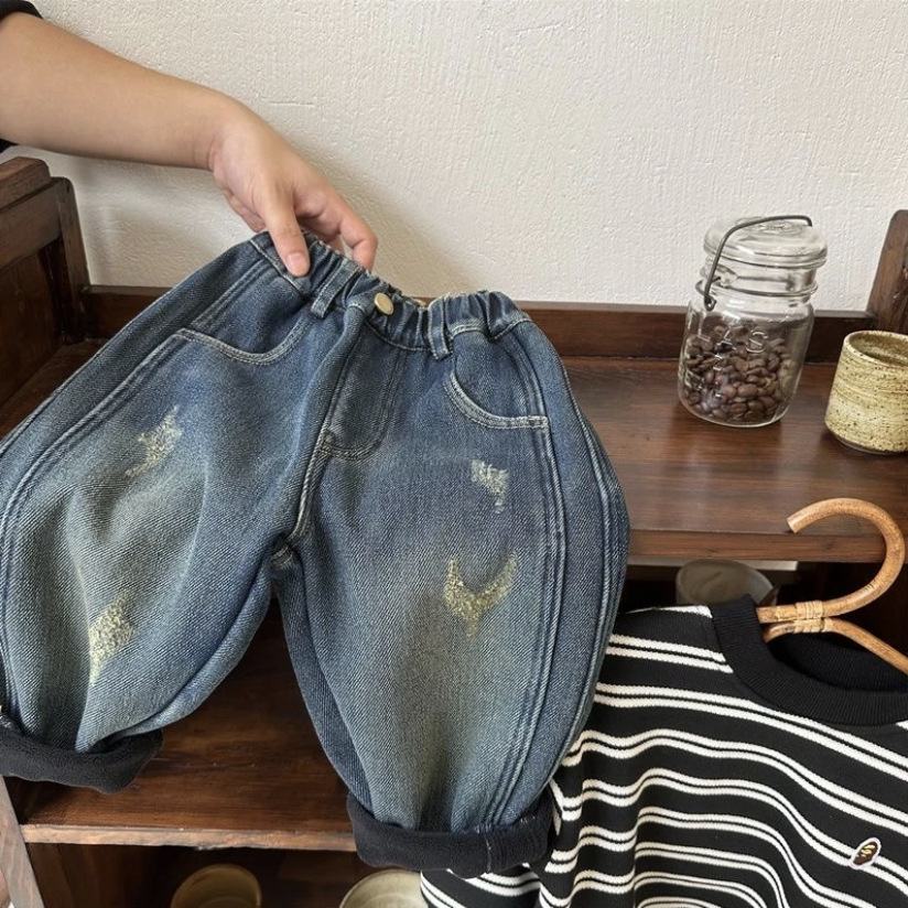 어린이 기모 두꺼운 청바지 2024 겨울 새 소년과 소녀 스크래치 바지 아기 스트레치 소프트 바지스토어 가기