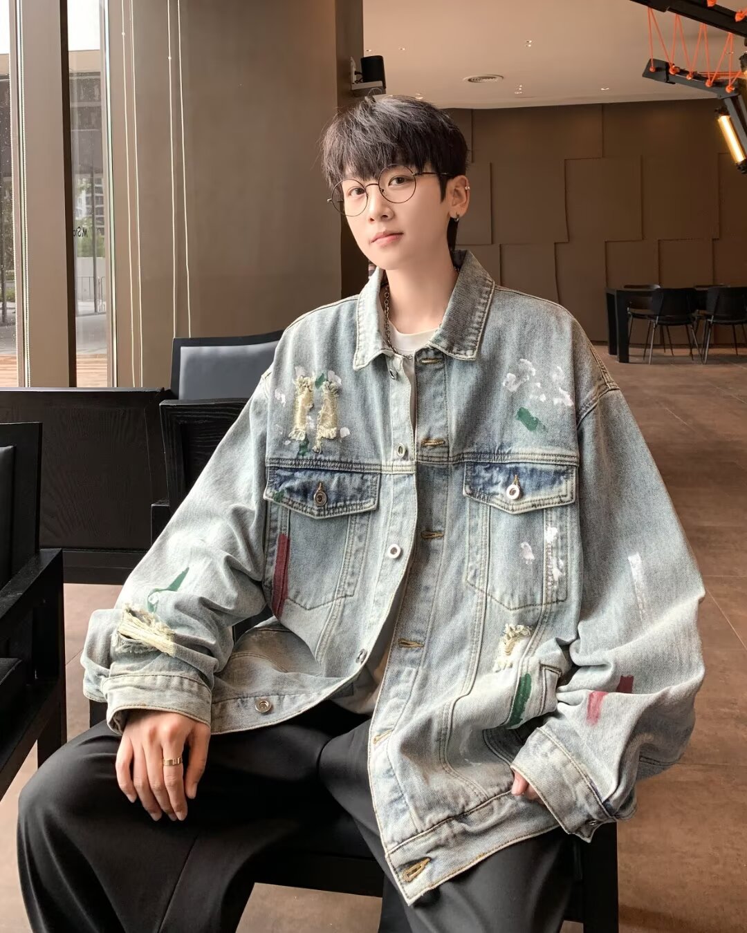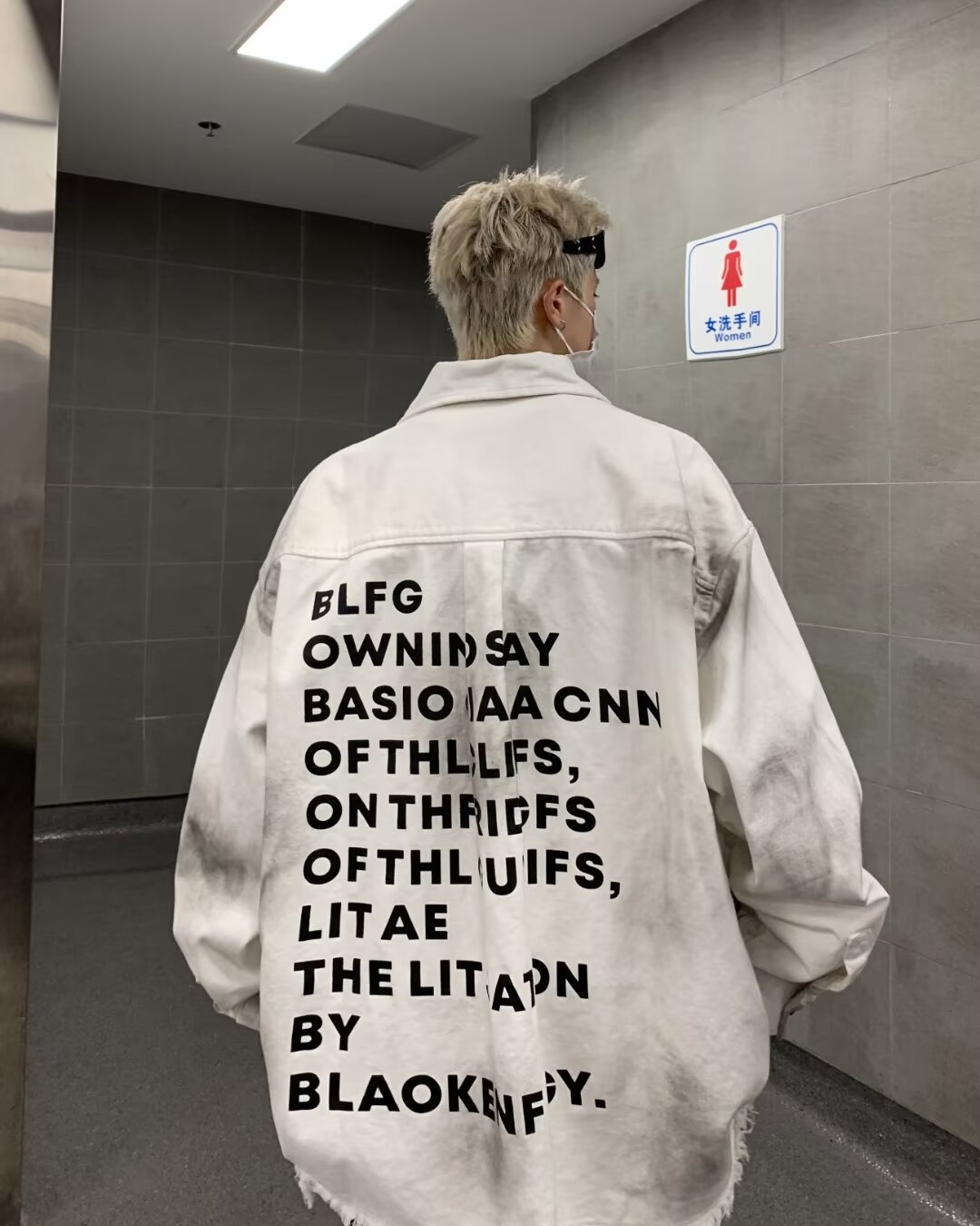 가을 2024 년 새 편지 인쇄 된 술 프린지 파괴 데님 셔츠 재킷 남성과 여성의 느슨한 재킷