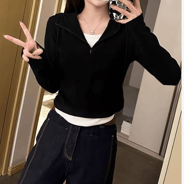 대조 컬러 가짜 두 개의 후드 긴 소매 티셔츠 여성용 2024 가을 한국판 플러스 사이즈 연령 감소 스웨터 여성베이스 셔츠 탑