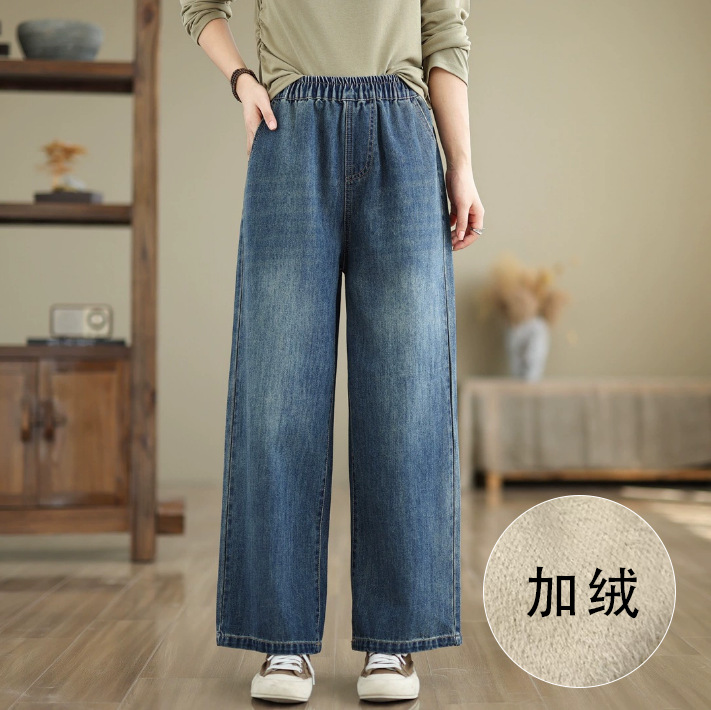 봄과 가을 새로운 느슨한 라이트 플레이트 청바지 여성용 높은 허리 슬리밍 플러스 사이즈 느슨한 허리 넓은 다리 바지스토어 가기