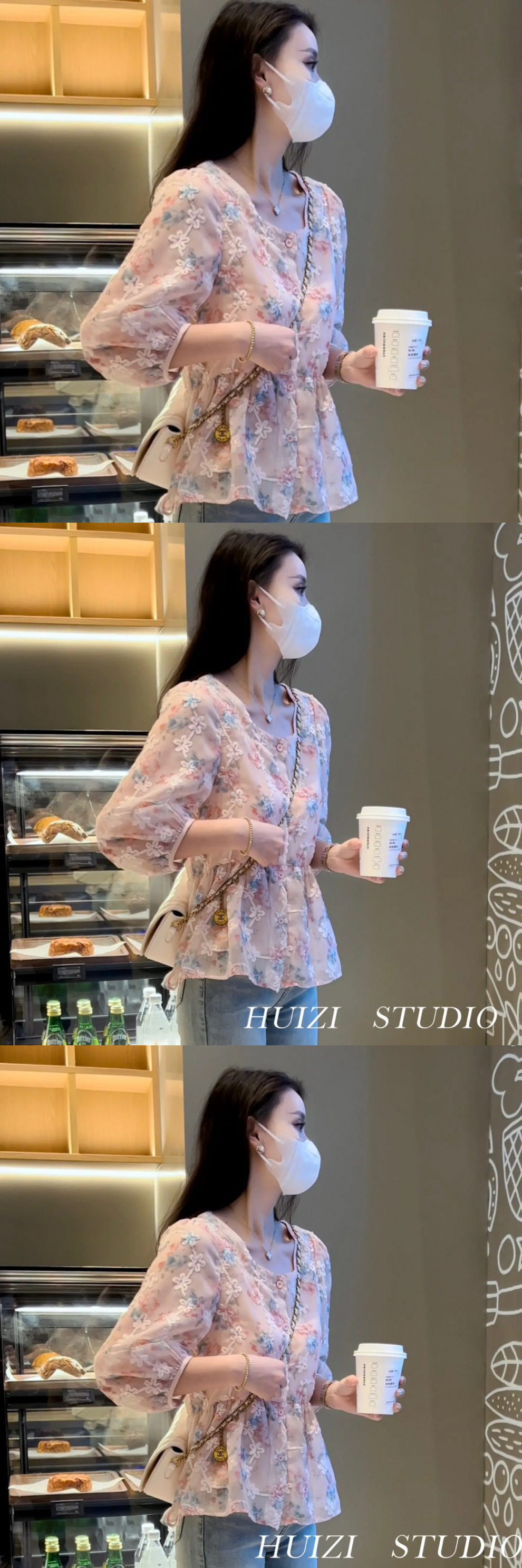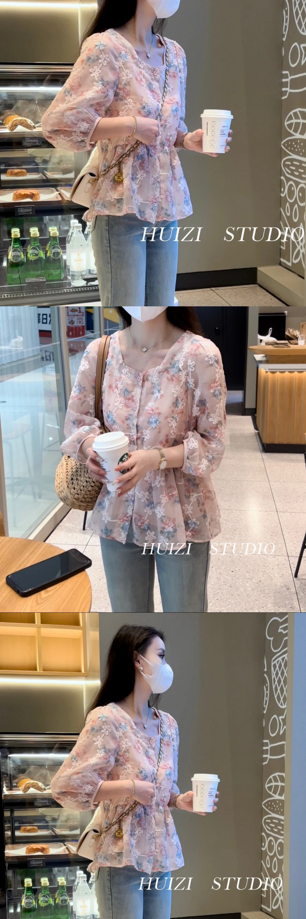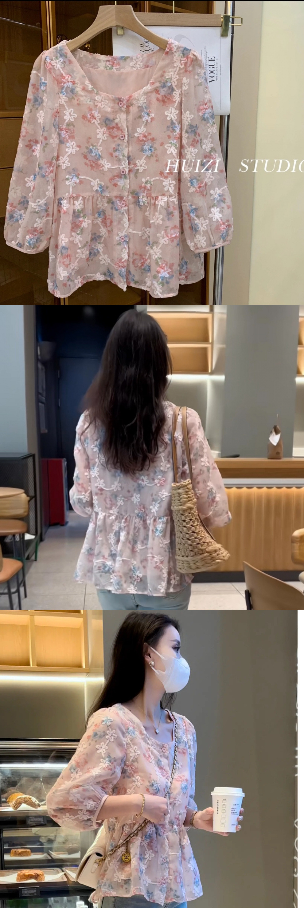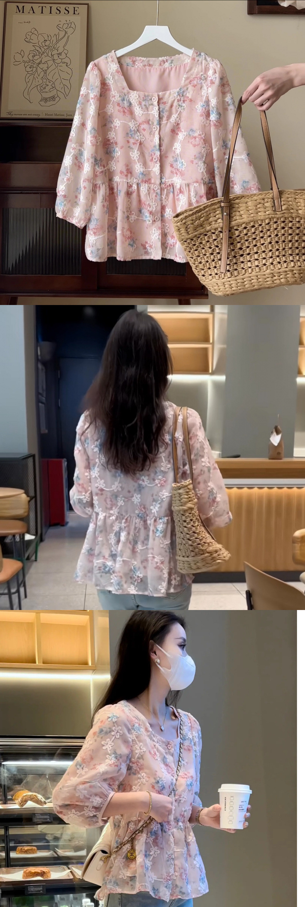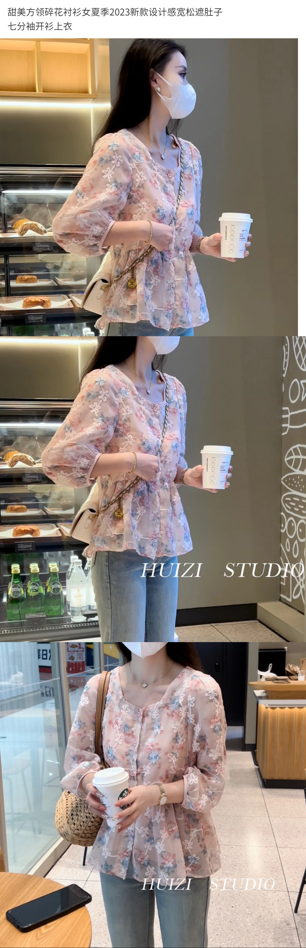 Y 스위트 스퀘어 칼라 플로랄 셔츠 여성의 여름 2024 새로운 디자인 센스 루즈 벨리 커버 중간 소매 카디건스토어 가기