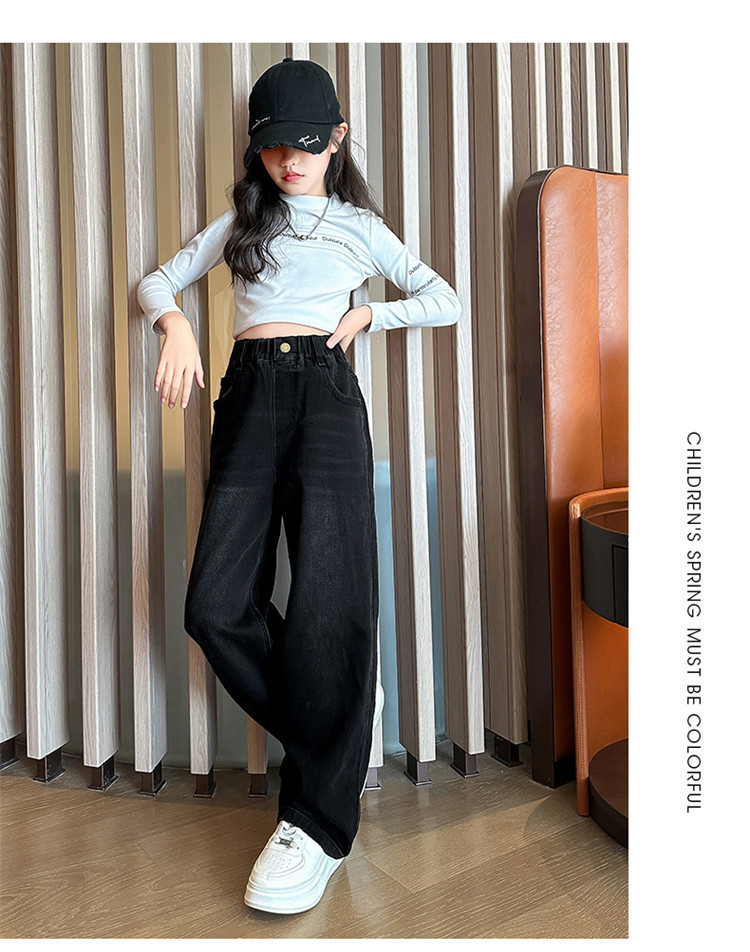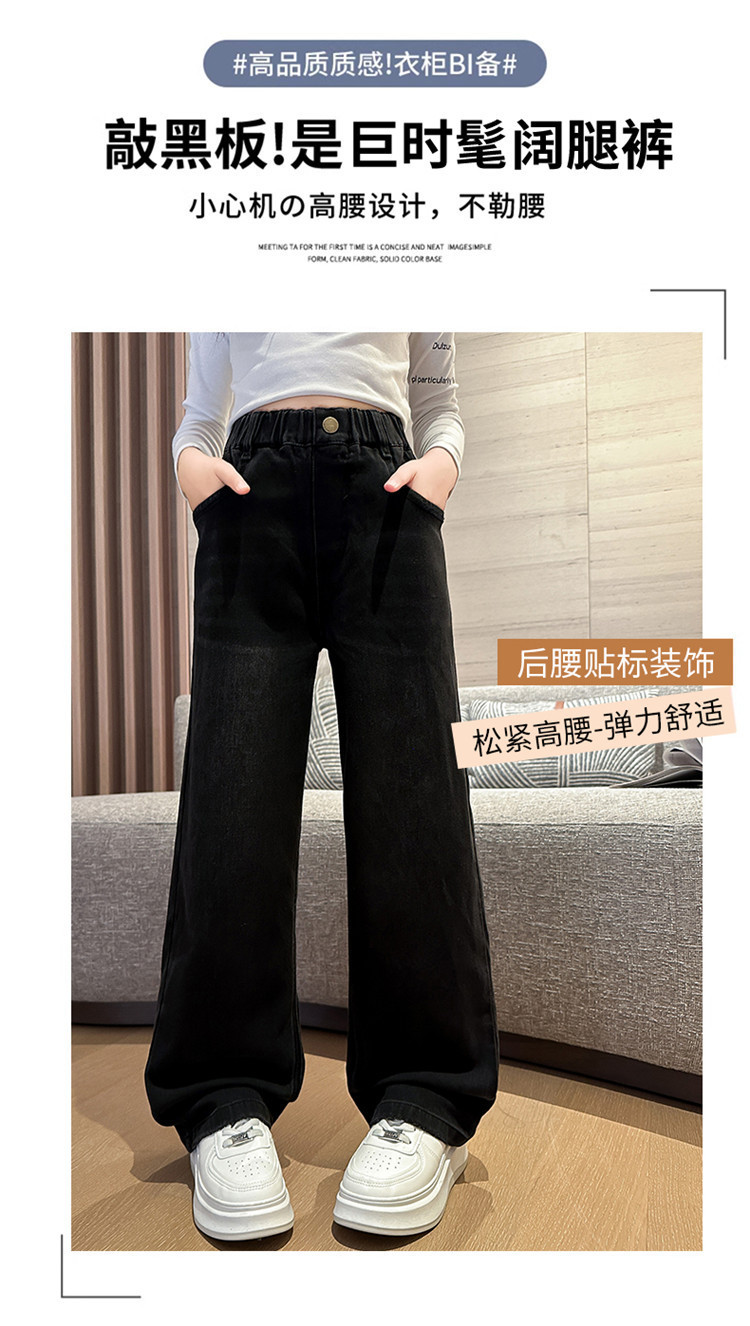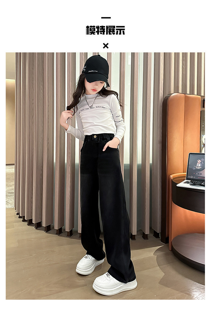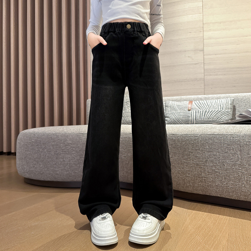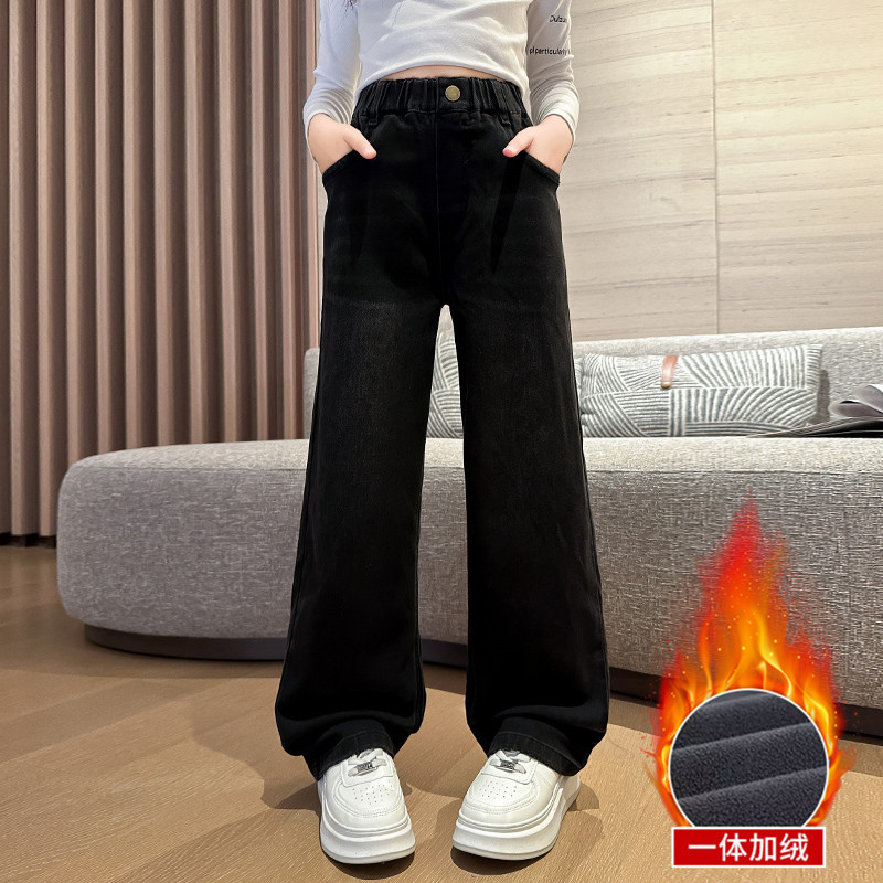 2024 겨울 새 여자 기모 바지 한국식 서양식 뒷주머니 와이드 레그 청바지 어린이 원피스 양털 스트레이트 바지
