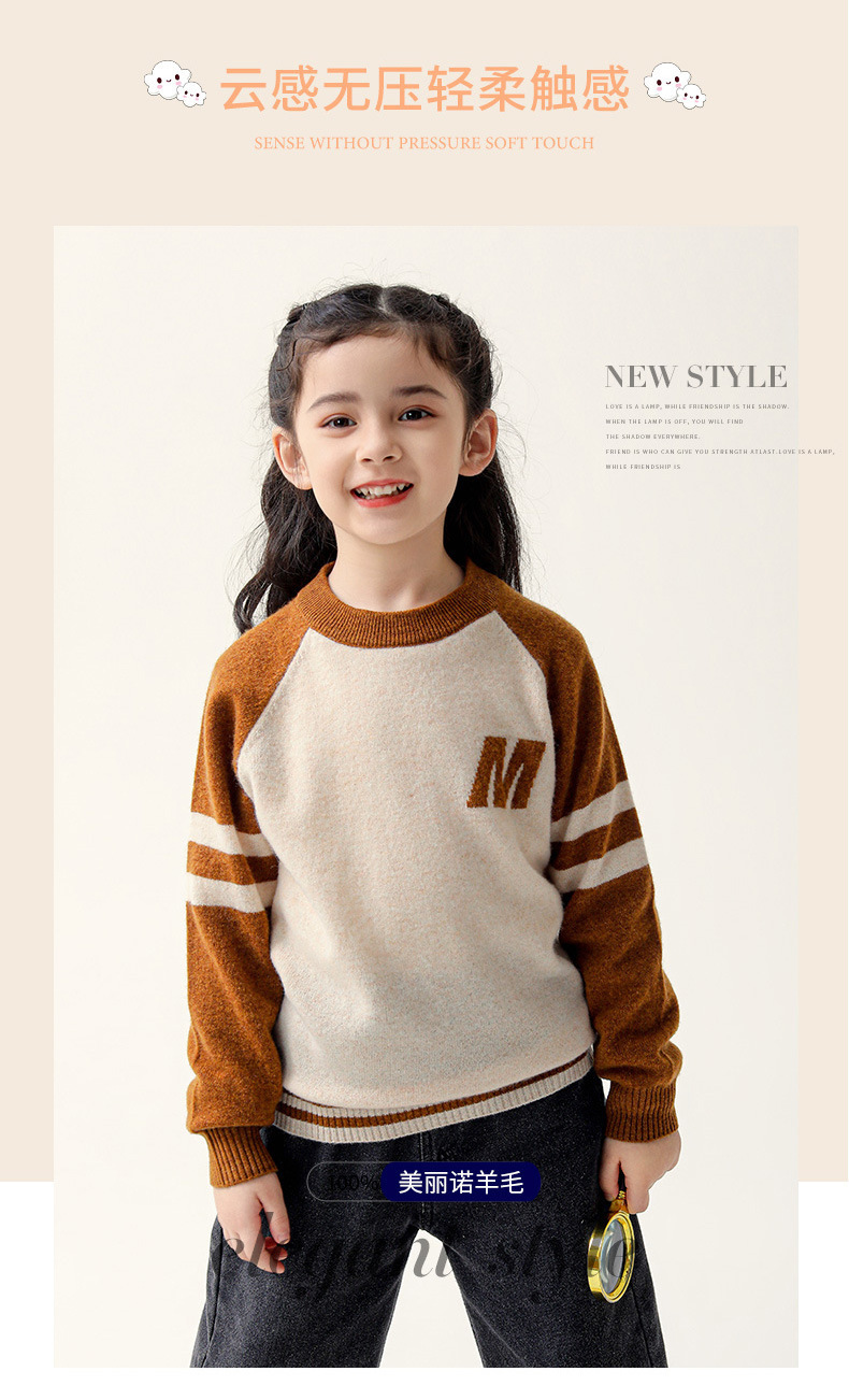 새로운 100% 어린이용 울 스웨터, 남아용 라운드넥 M자 컬러블록 니트, 여아용 따뜻하고 다용도로 활용 가능한 니트